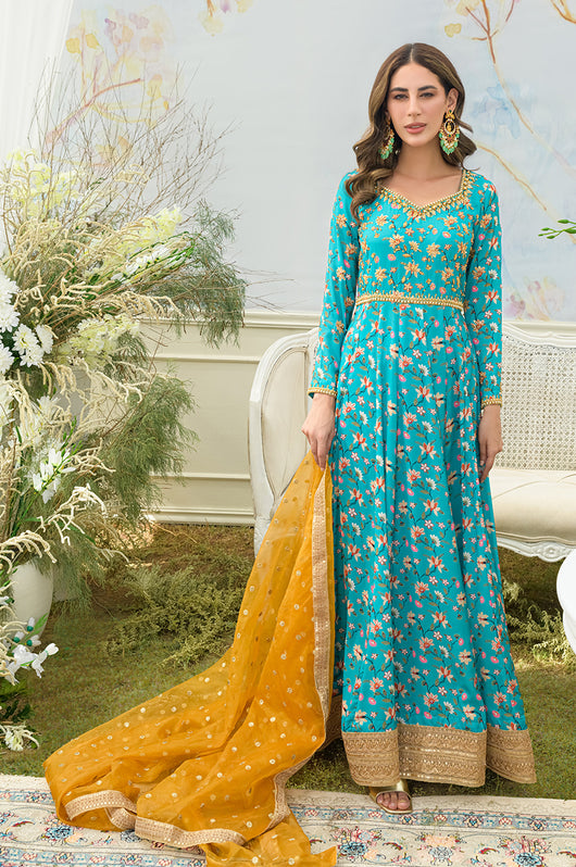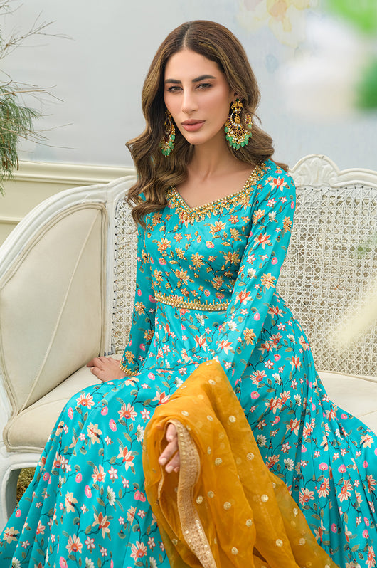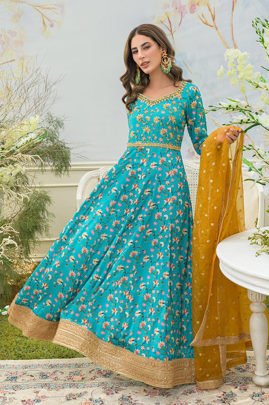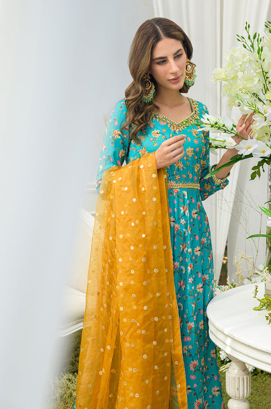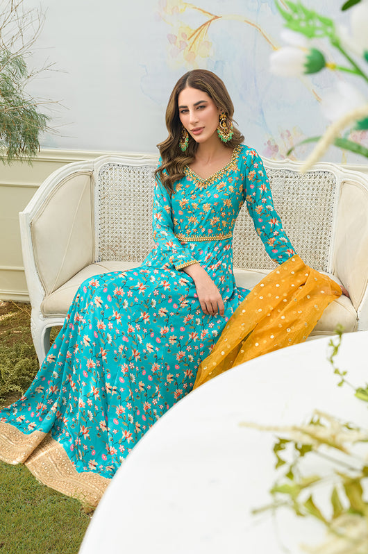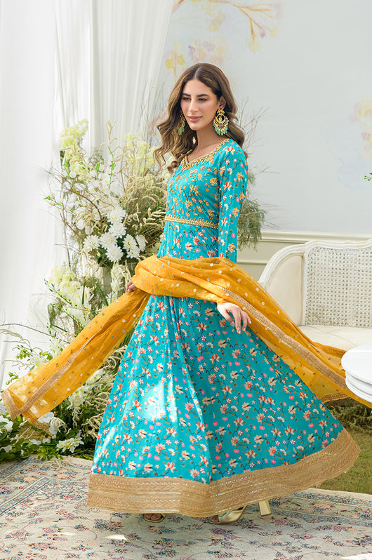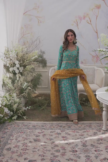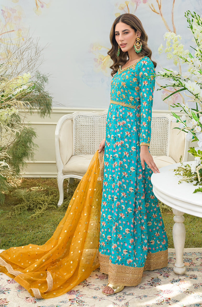 Ahana is a Turqouise blue peshwas with a detailed lace border at the bottom and a heavily embellished bodice. The dress is contrasted with a mustard dupatta with lace finishes and paired with plain turquoise colored silk pants.