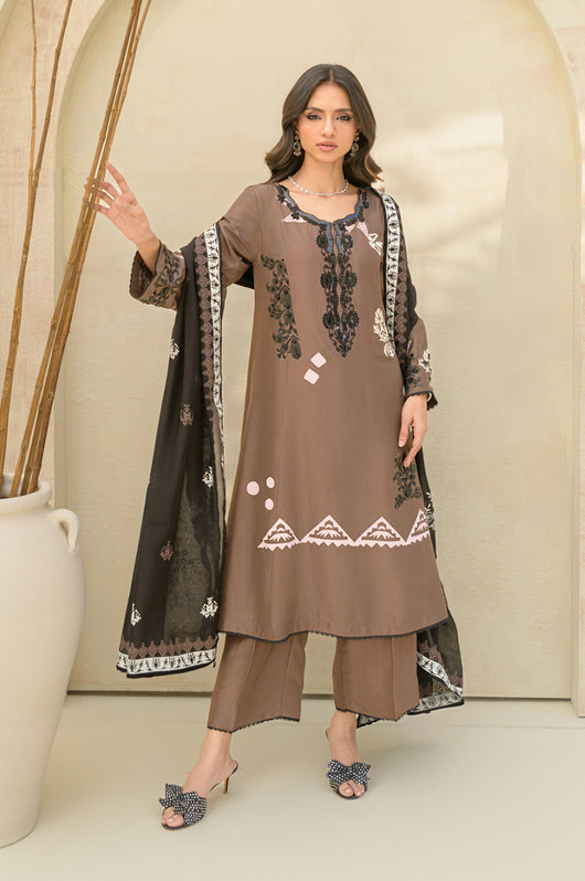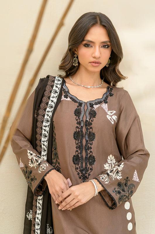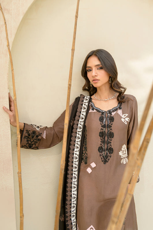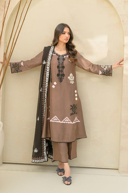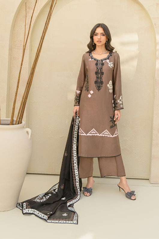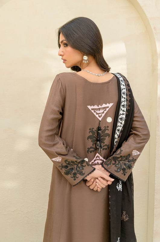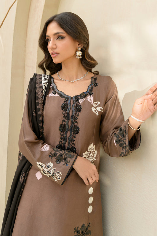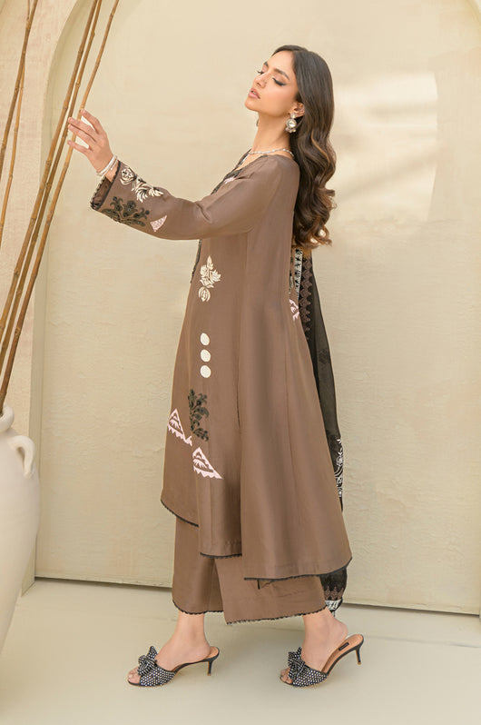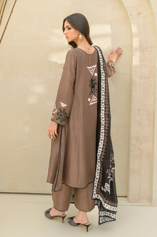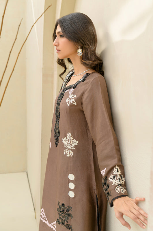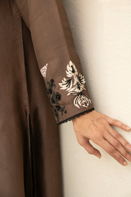 Aireen is a brown abstract block printed suit made in either raw silk 80 gms or butter silk. It has hand work made in black material on the neckline and sparkling touches in black all over the shirt. comes with hand embellished and block printed back as well with hanging details. Comes with culotte pants and a black block printed dupatta to complete the look.