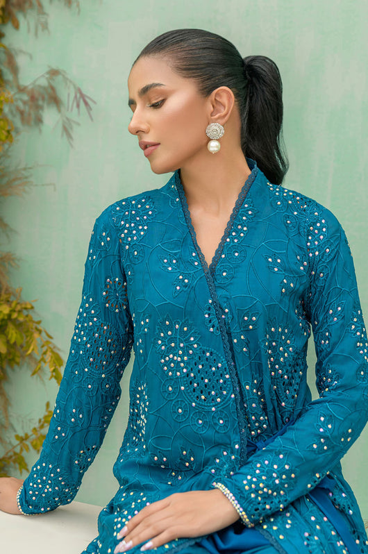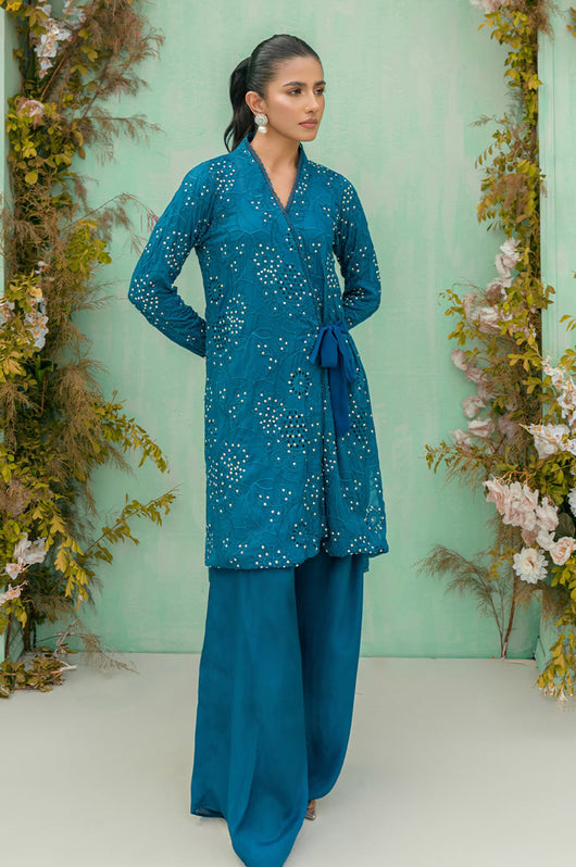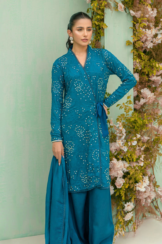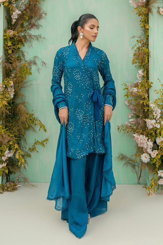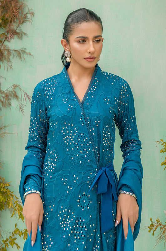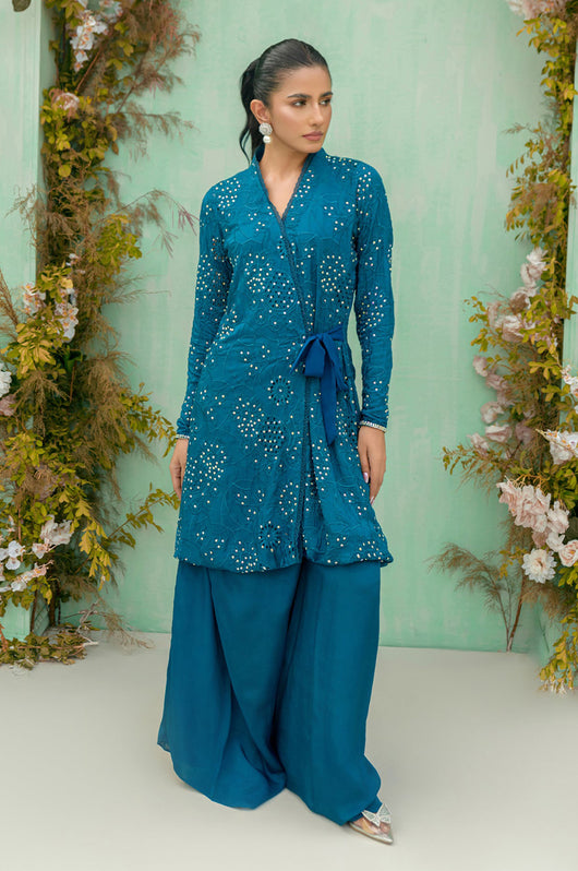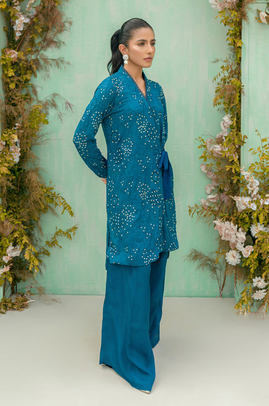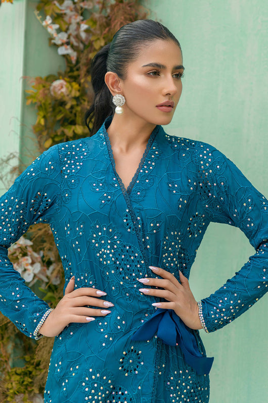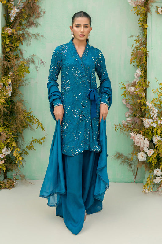 Alish is made on butter silk with Schiffli technique, it’s a teal blue colored dress embellished in multicolored hand stitched stones all over for the midnight sky inspired feel. The shirt is between 38-40 inches in length with same colored lace finishes and a side kimono style wrap around shirt. The dress comes with an inner and a v-cut pants made in bosci silk and an ombre dupatta with lace finishes.