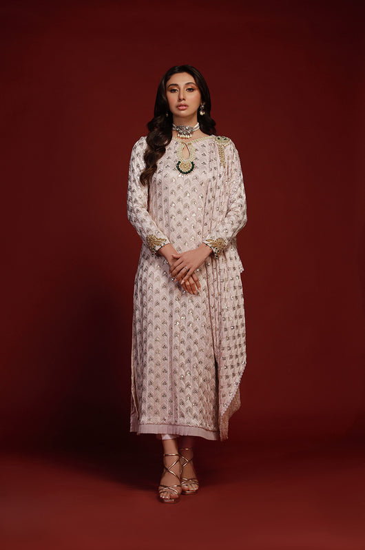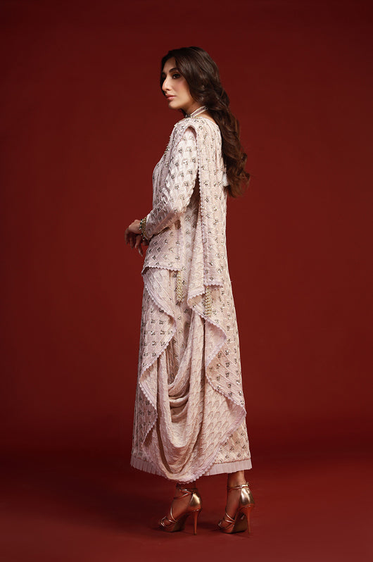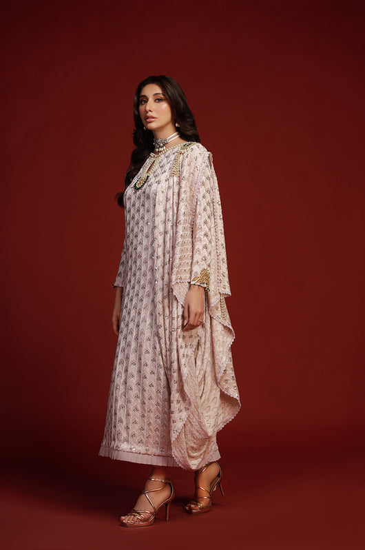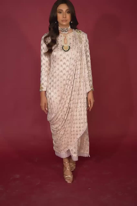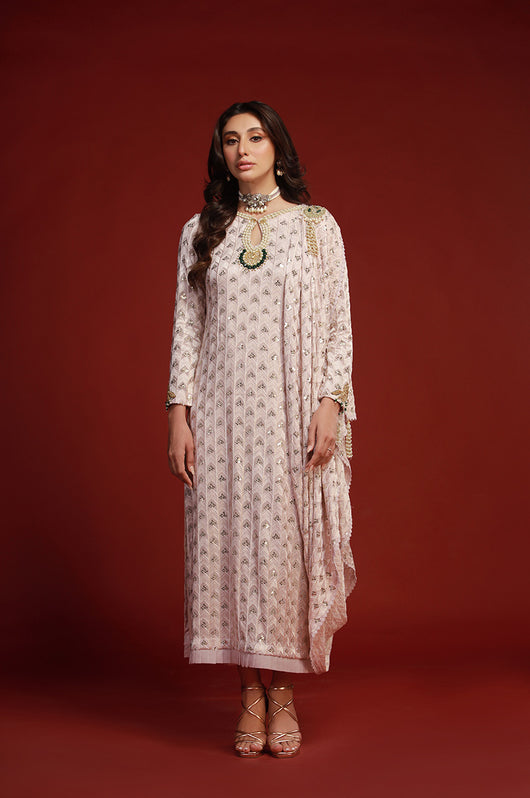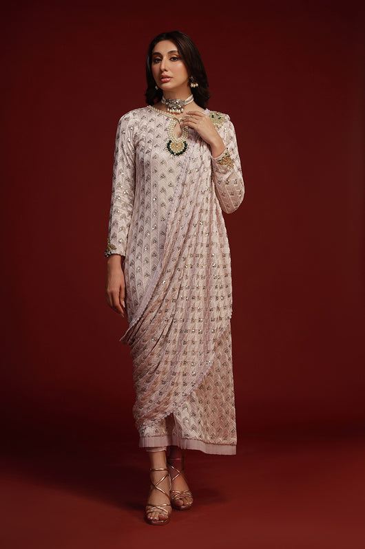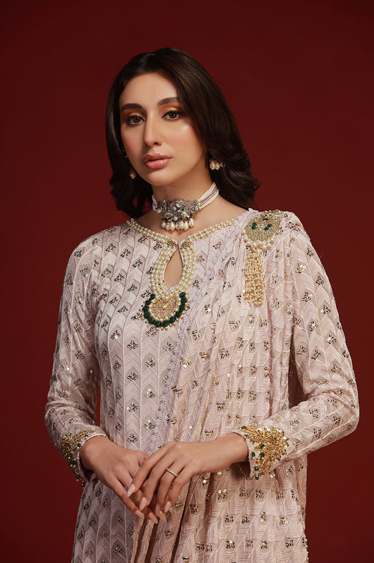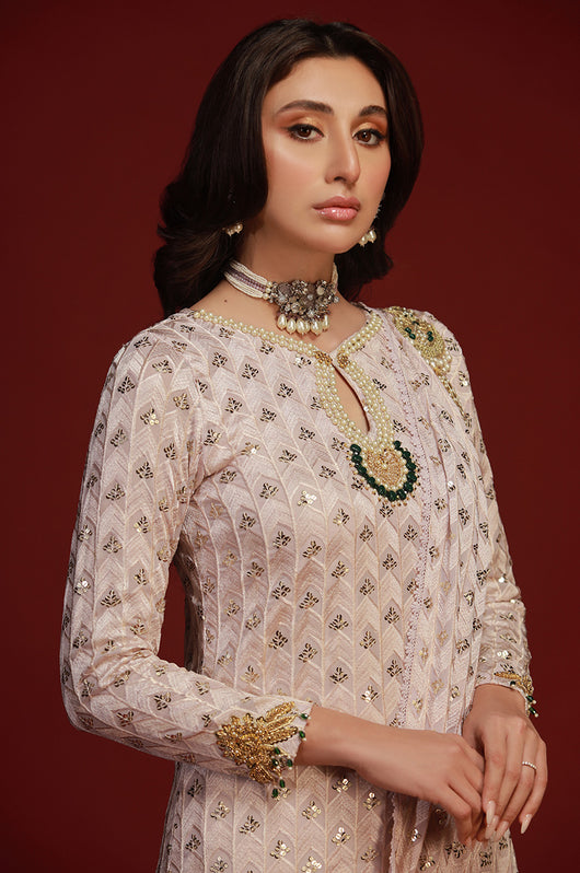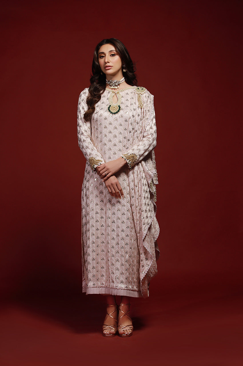 Light pink straight shirt made in embroidered chiffon with pleated organza details at the bottom and a pearl embellished neckline and sleeves. The look is enhanced by adding the emerald green notes. Comes with a detachable drape dupatta which can be worn on either side and cotton silk pants. Tassel details all throughout the dupatta on the top and also on the edges to add finesse to the overall look.