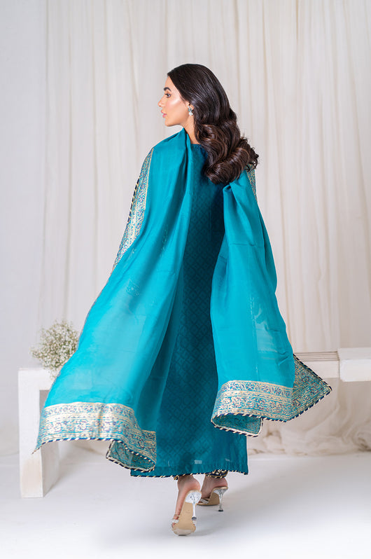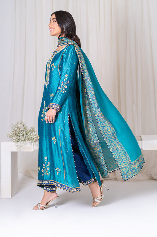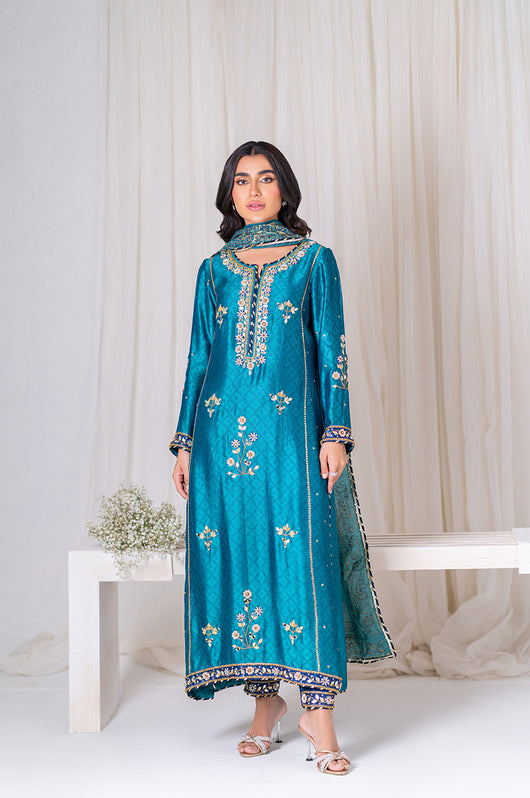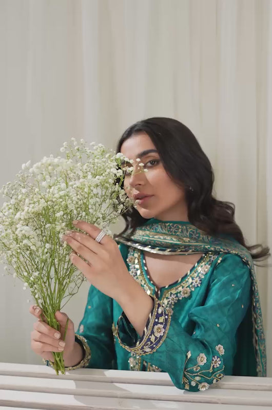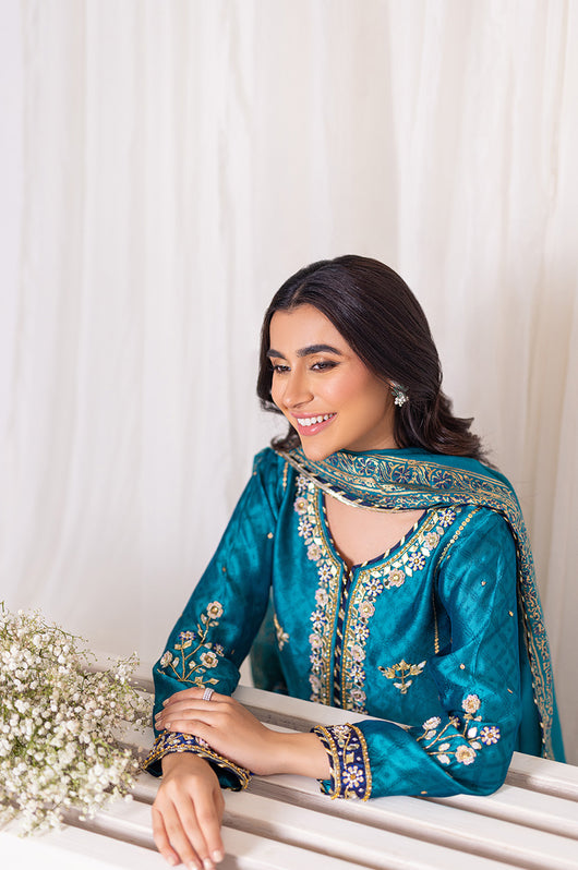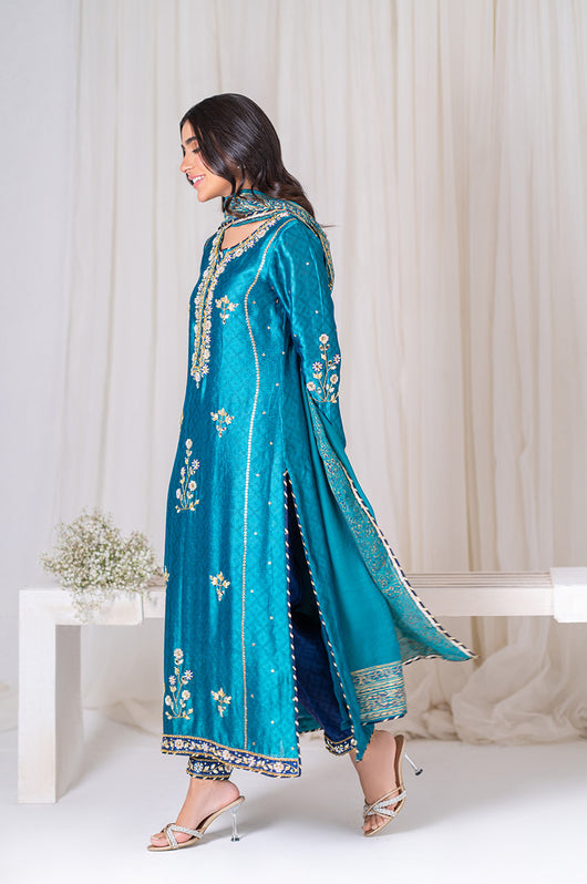 Amel is a classic firozi and dark blue colored formal heavily embellished outfit made in cutdana sequins resham and other traditional material. The heavily embellished shirt is 48 inches long and is a standard fit with an inside inner. There is dark blue applique all over the shirt with heavily embellished borders all throughout the outfit on the shirt and the pants. Accompanied by a silk dupatta with block printed details and chatapati all over for the classic yet traditional finish.