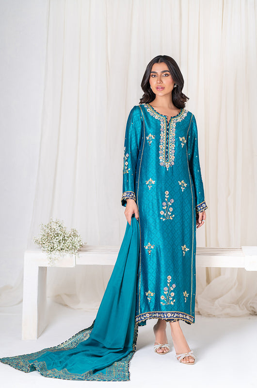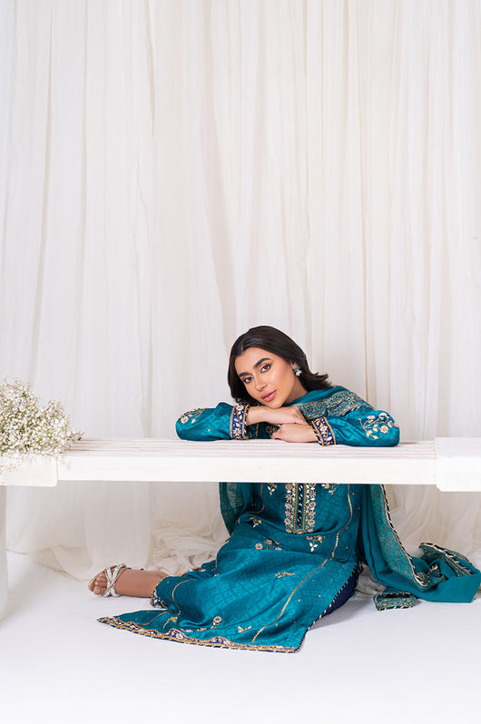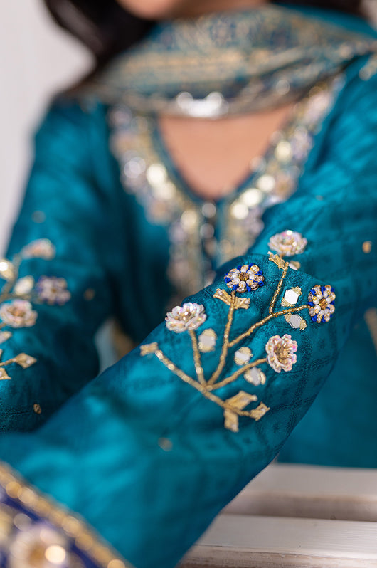 Amel is a classic firozi and dark blue colored formal heavily embellished outfit made in cutdana sequins resham and other traditional material. The heavily embellished shirt is 48 inches long and is a standard fit with an inside inner. There is dark blue applique all over the shirt with heavily embellished borders all throughout the outfit on the shirt and the pants. Accompanied by a silk dupatta with block printed details and chatapati all over for the classic yet traditional finish.