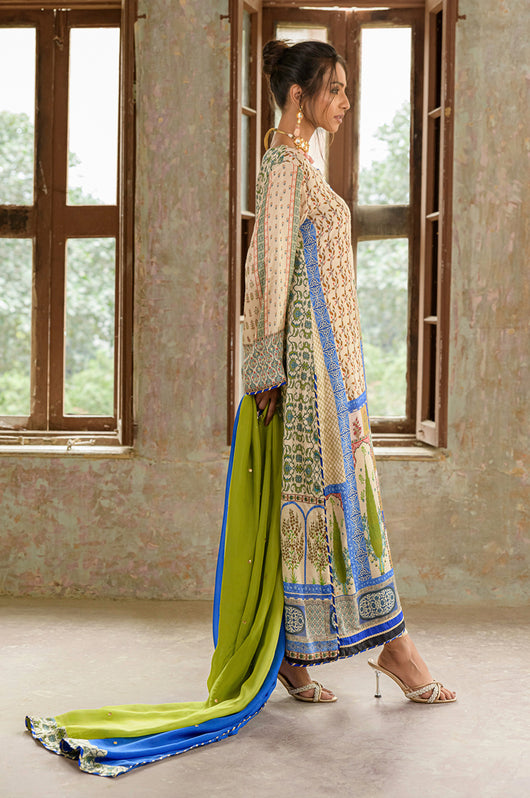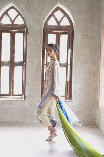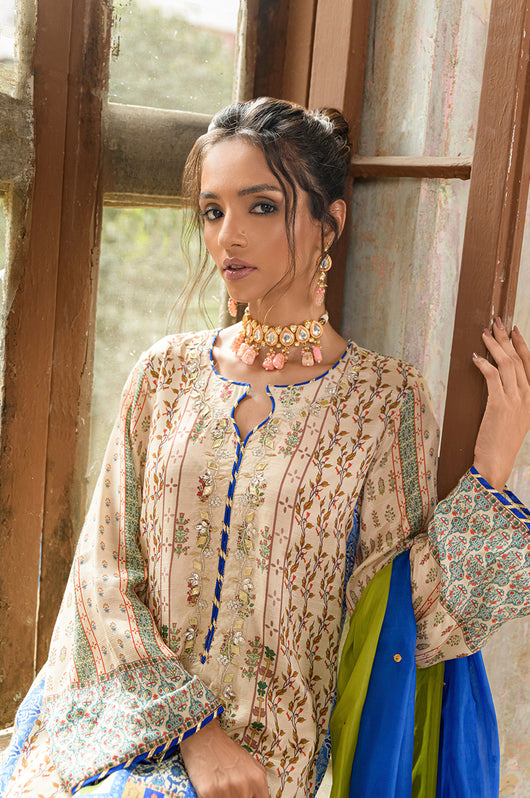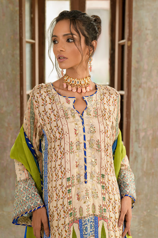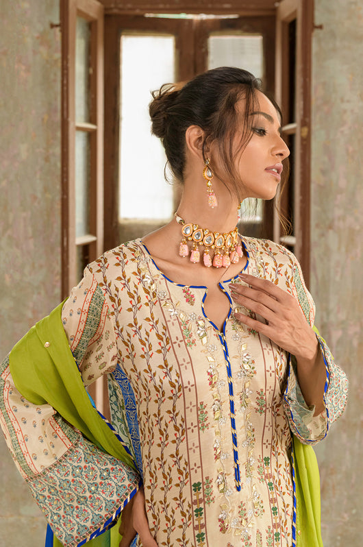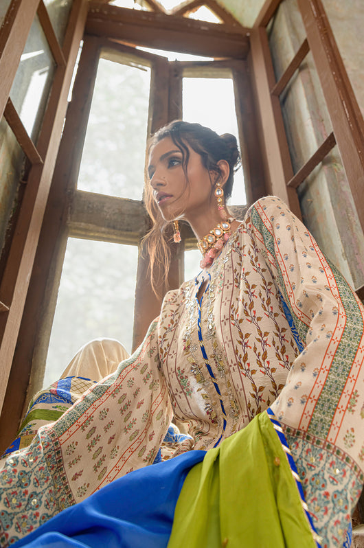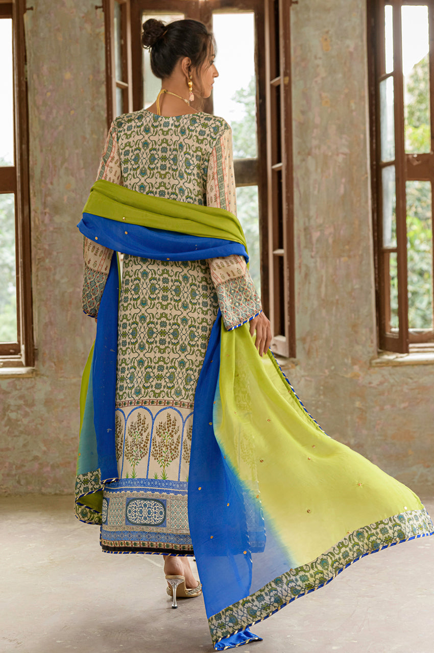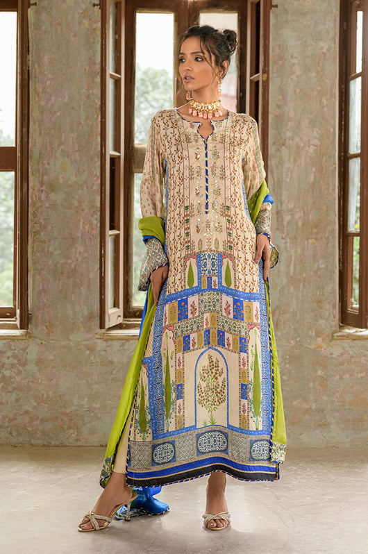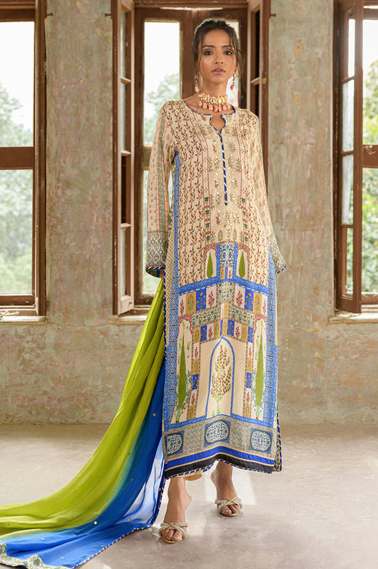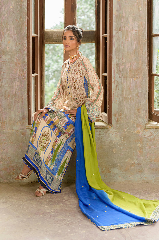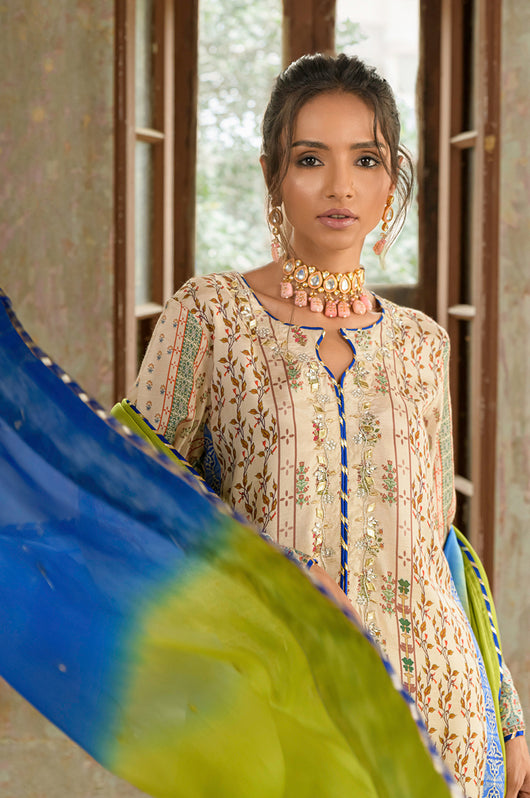 Printed canvas made on a coffee colored base. The dress comes with a lightly embellished neckline and sleeves. With notes of ink blue perfect for the luncheons and kitty parties. The dress comes with a two colored embellished dupatta and lace and printed border finishes all over. Length of shirt is between 46-49 inches. Opt for custom length when placing the order.