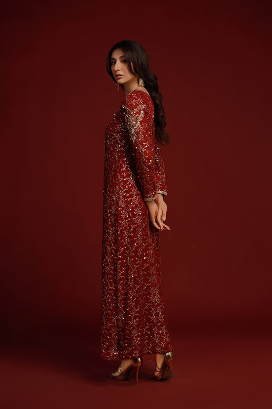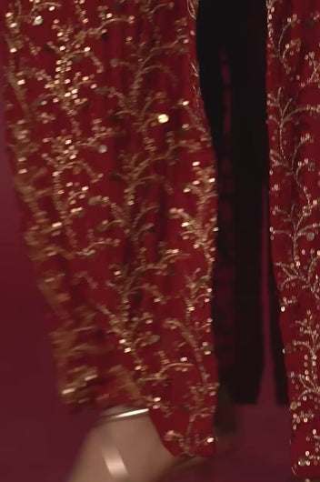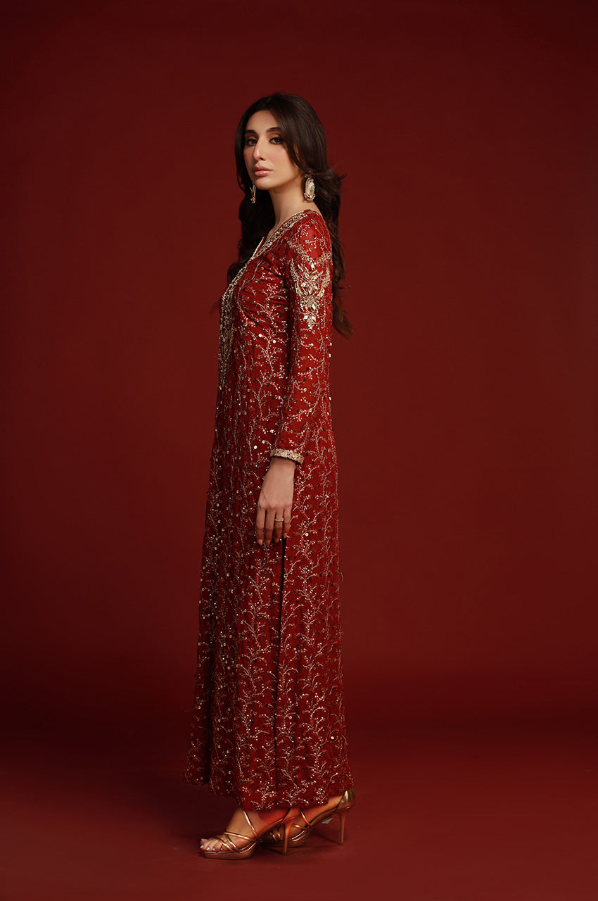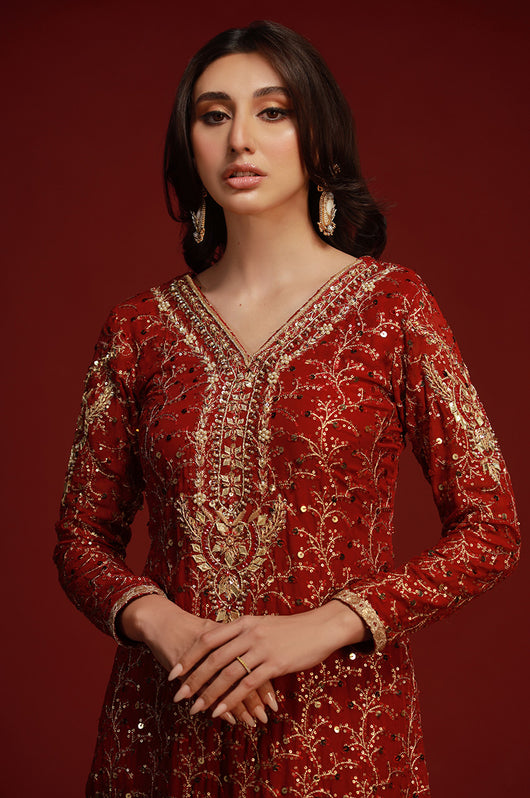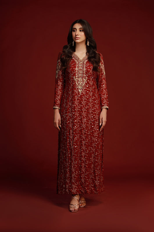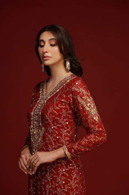 The Red embroidered chiffon is a long straight style kaftan shirt with fitted sleeves with heavile embellished neckline and sleeves with bigger bunches on the arm. Neckline is embellished in red stones and gold details. Comes with pants and inner.