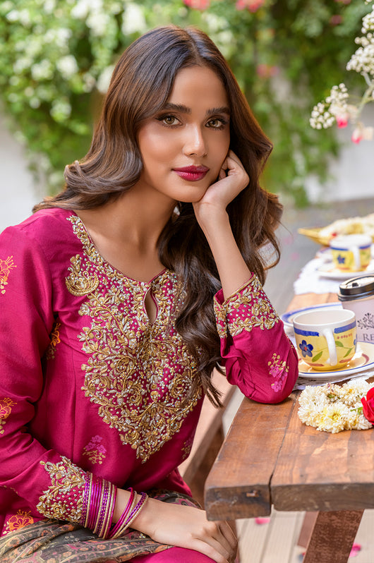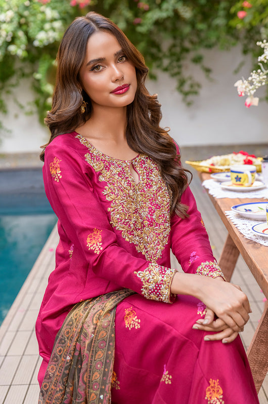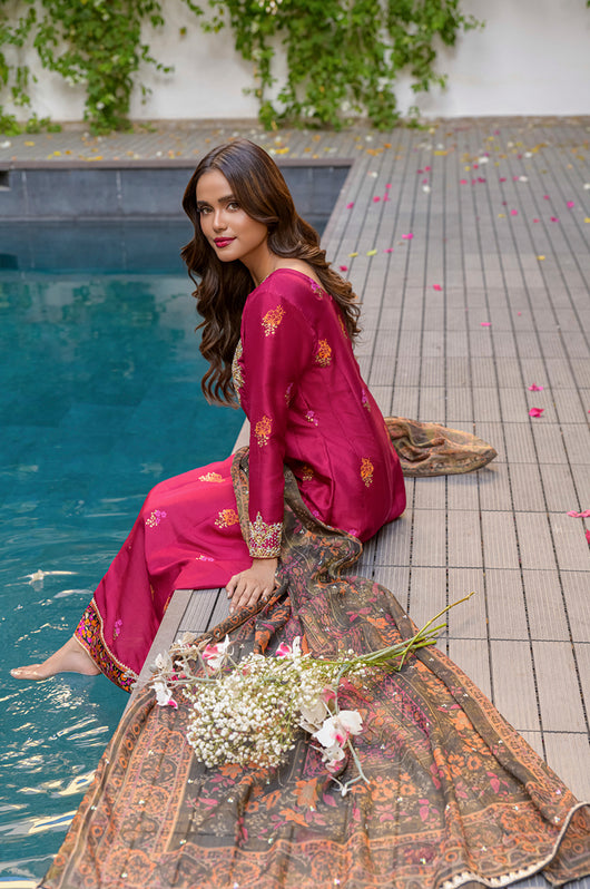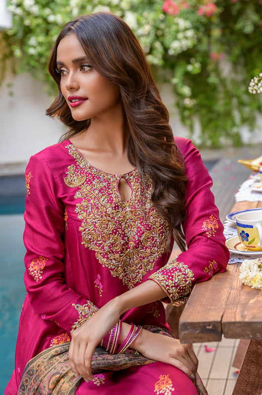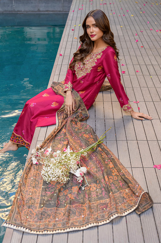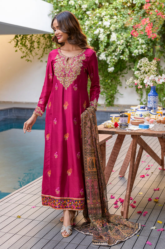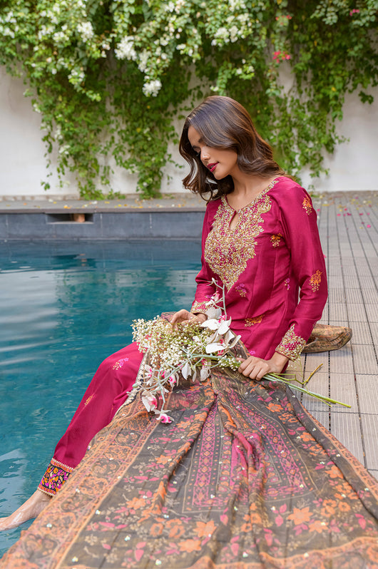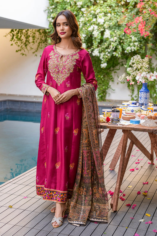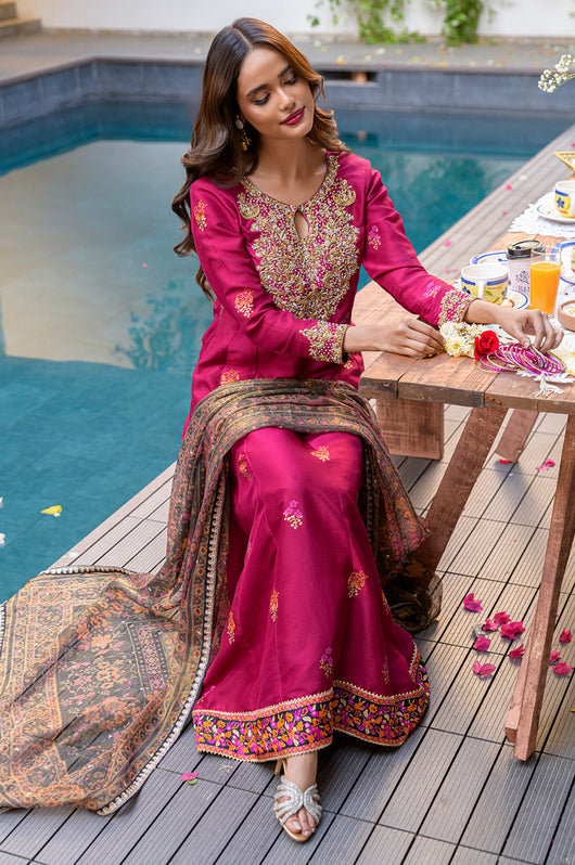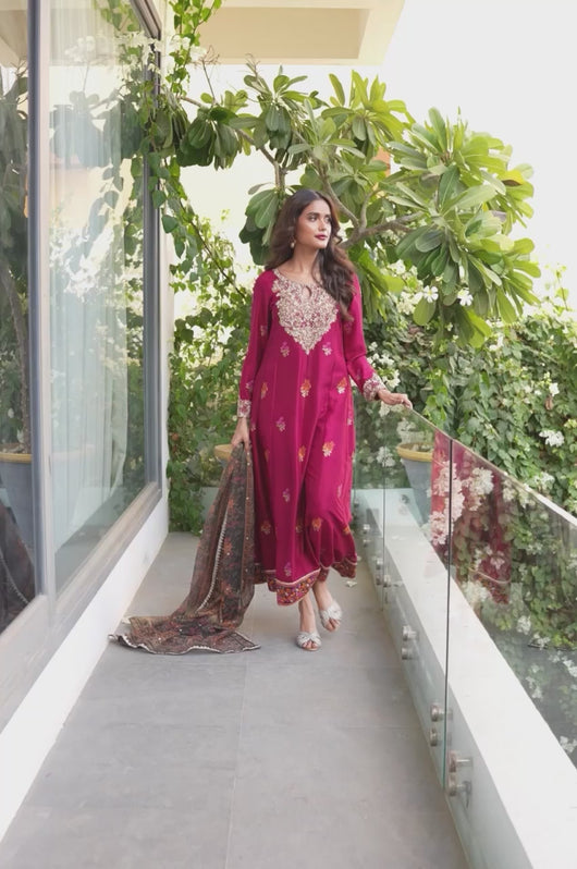 Amyrah is a kalidar made in berry colored pure raw silk 80 gms fabric with straight cut matching pants and a digitally printed pure Mysore Chiffon dupatta. The dress comes with a heavily embellished neckline with kora dabka nakshi resham and all other premium materials details. Along with a silk digitally printed border at the bottom of the shirt matching the dupatta. Dupatta has chan and lace details all over. Pants are made in pure cotton silk.