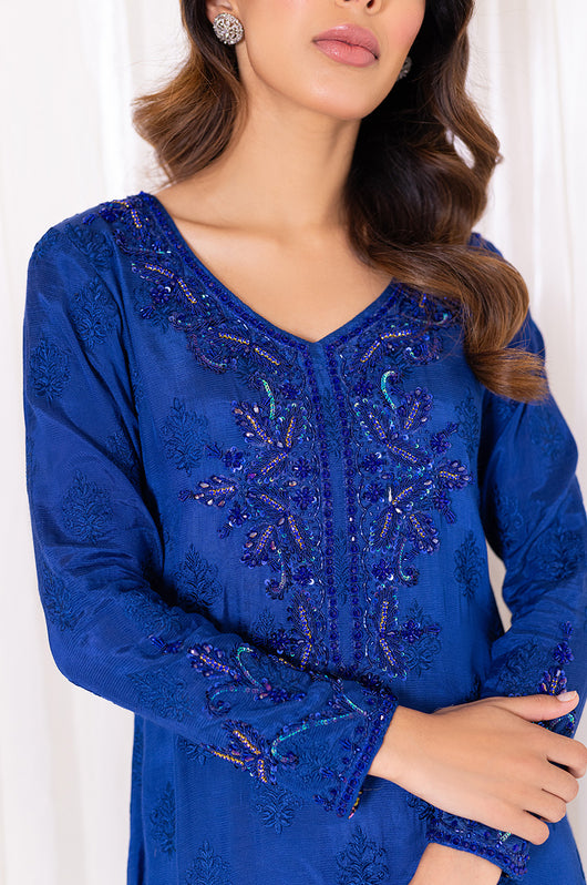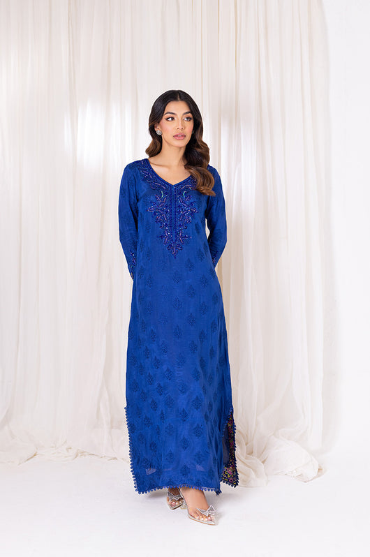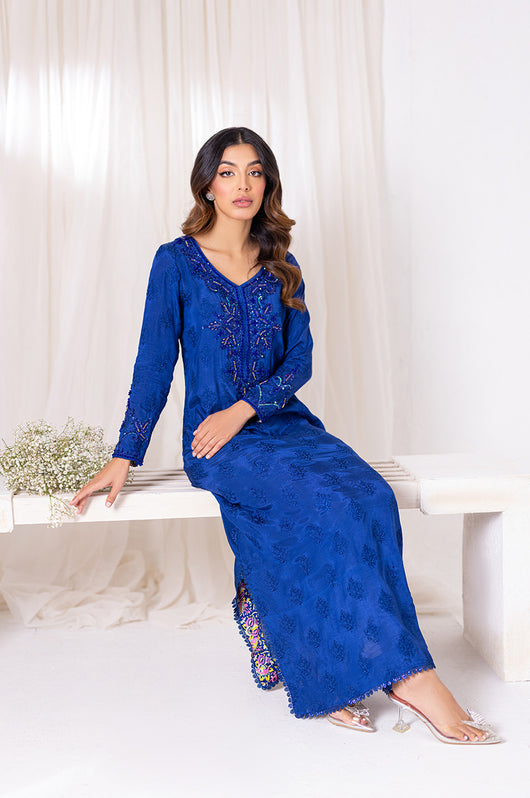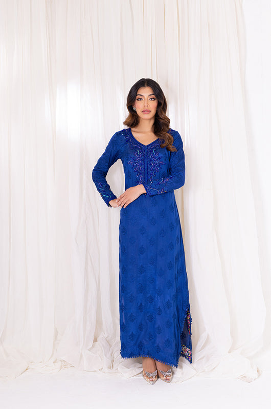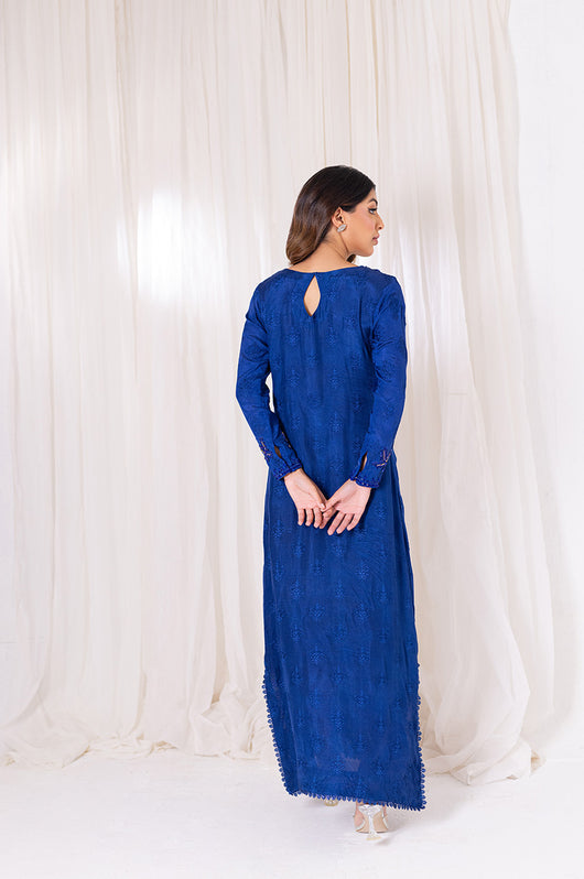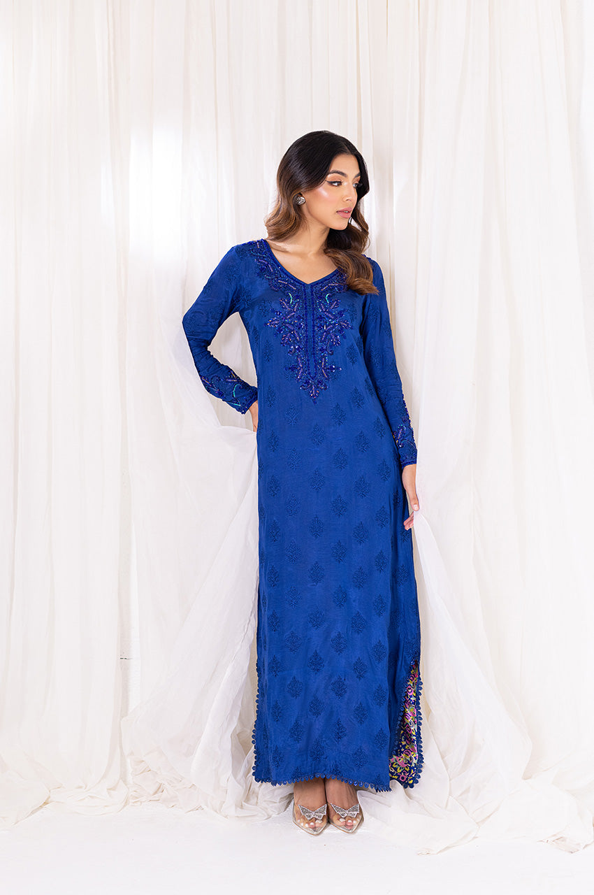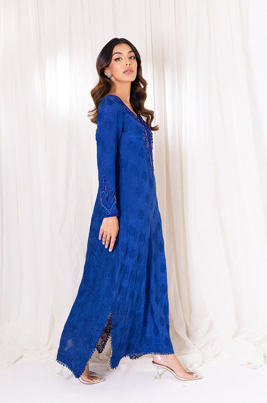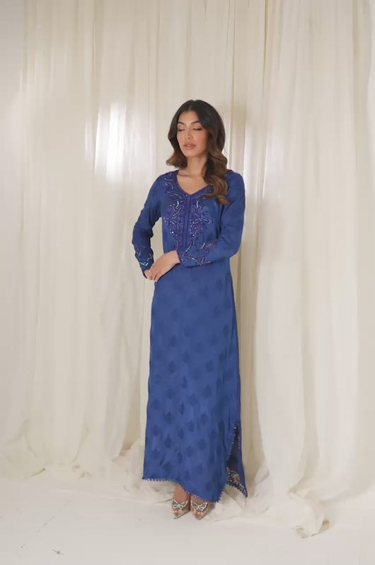 Aneela is an ink blue long straight kaftan that comes with printed details in the side slit and heavily embellished neckline in the same colored material with notes of pink and green. The length of the kaftan is 53 inches and has lace details all over.