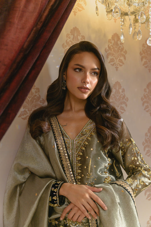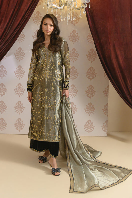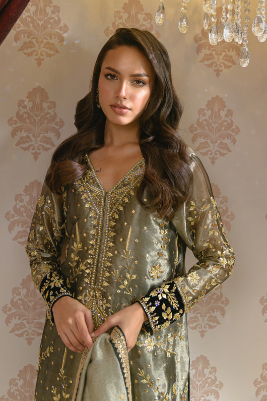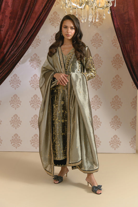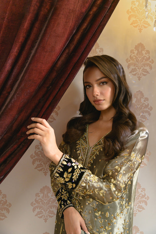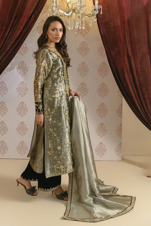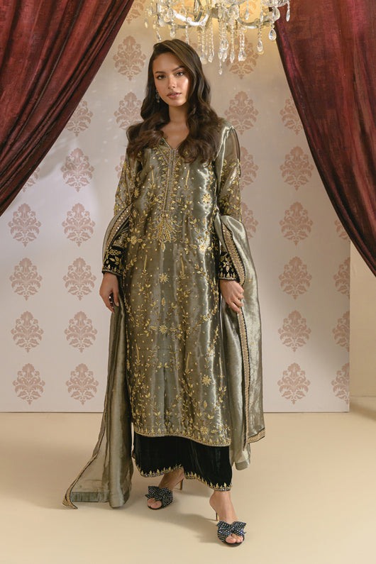 Anna is a heavily embellished charcoal grey Lame silk shirt and pure velvet black pants, made in our signature handwork style. The outfit is heavily embellished with charcoal dupatta with chan and lace finishes.