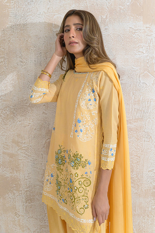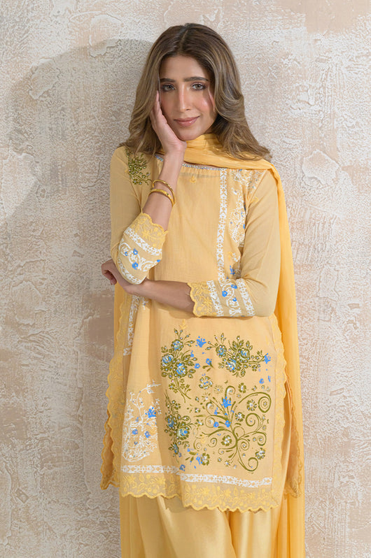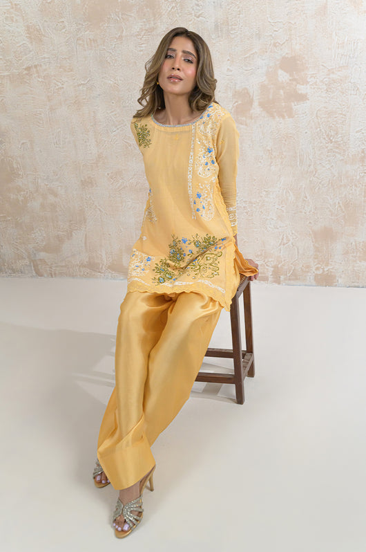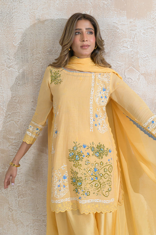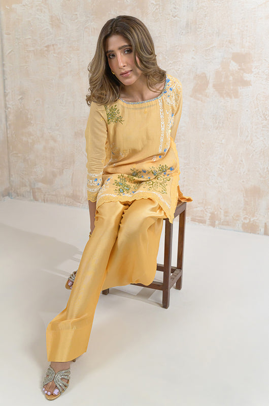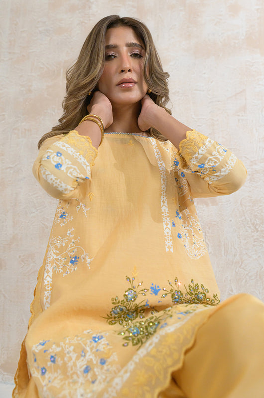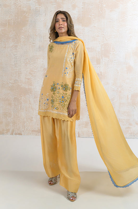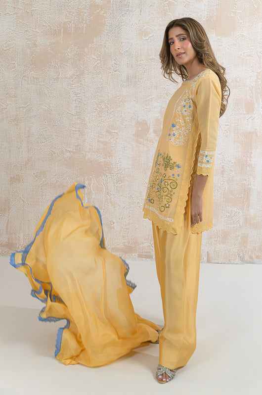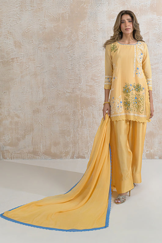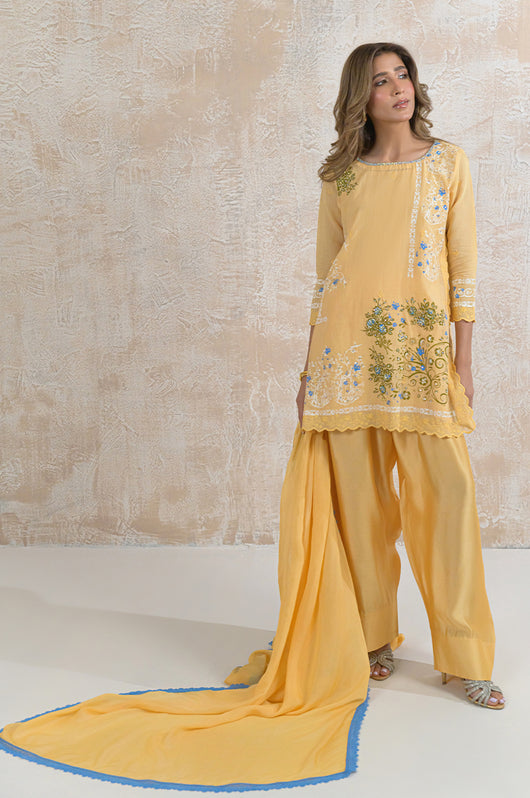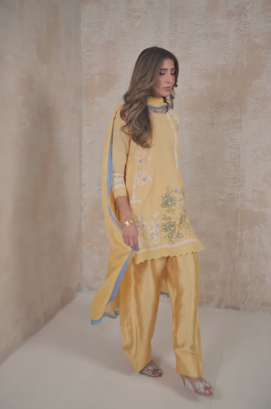 Apricot yellow is made in pure butter silk. The outfit is block printed in contrasting tones like blues and green with ivory borders. The outfit has embroidered borders in the same color. The shirt is then hand embellished and hand-worked with different materials. Comes with a butter silk farshi shalwar and medium silk dupatta with lace finishes in blue.
