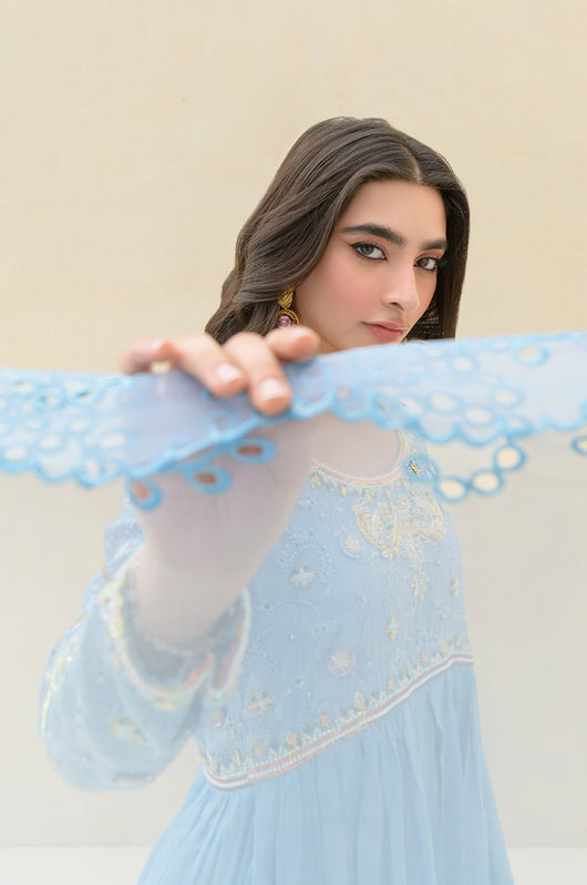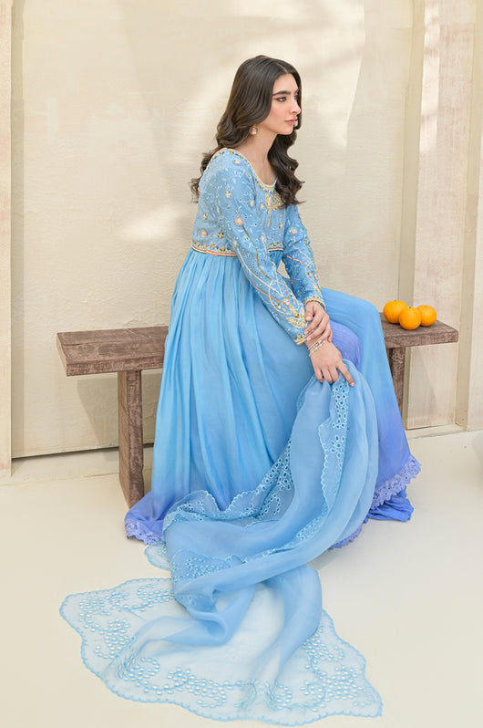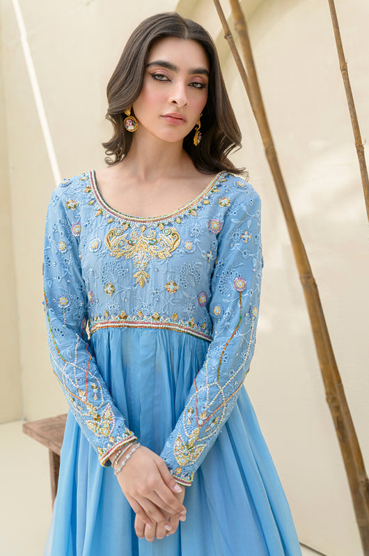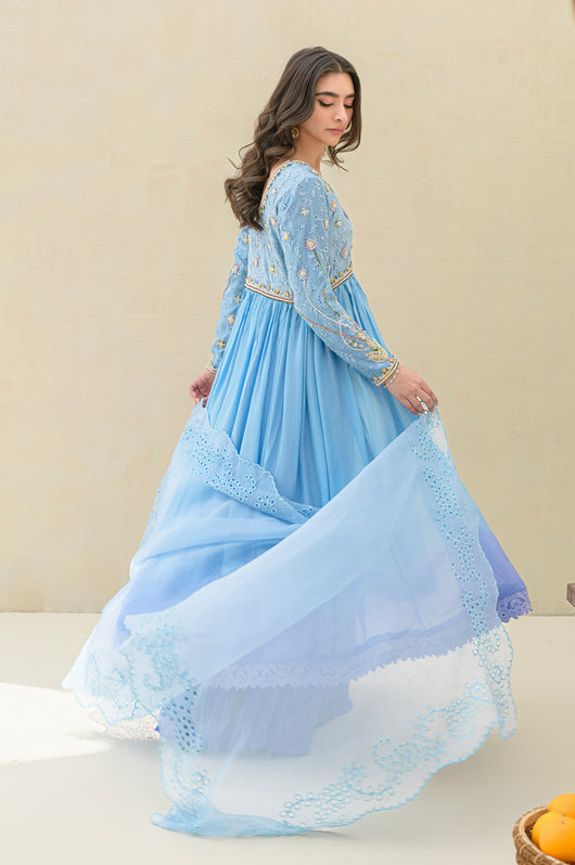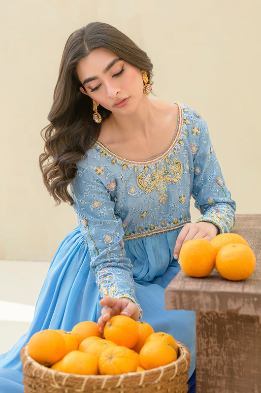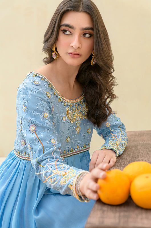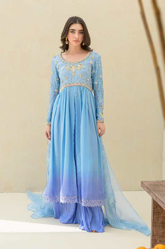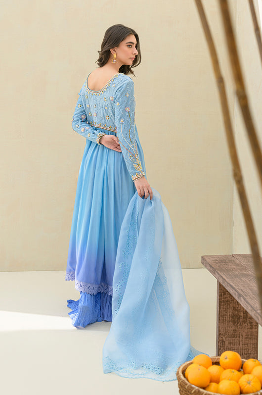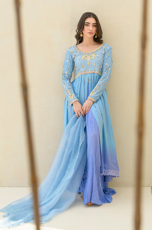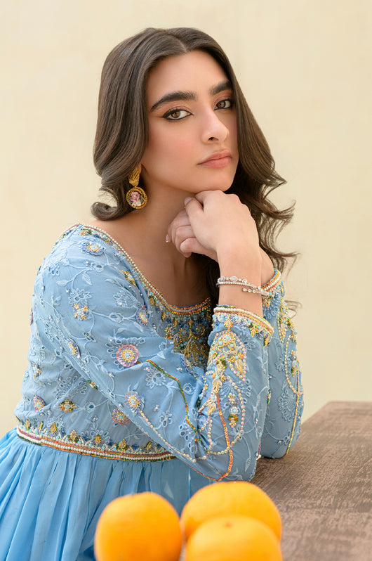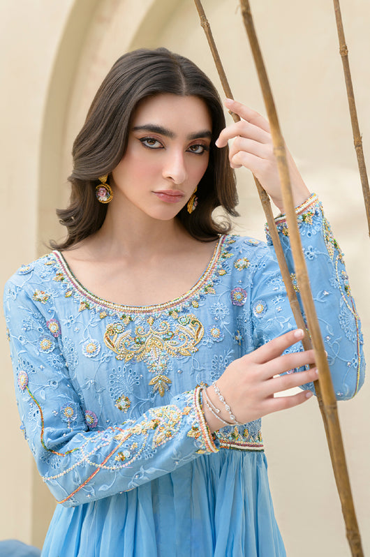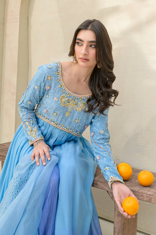 Powerfully chic and undeniably glamorous, this ensemble is your modern style solution.The bodice of this luxuriously, flowing kalidaar is generously hand worked created to steal the moment – be it day or night.A stunning periwinkle blue canvas of pure silk is brought to life with pastel silk thread work as well as silver, pearl and bead hand embel No lishments. Same embellishments are done on the back as well. The outfit can be paired with striking crushed lehenga in lilac color, this is one of those fail safe ensembles certain to make you the belle of any ball!