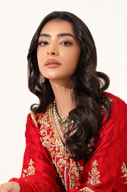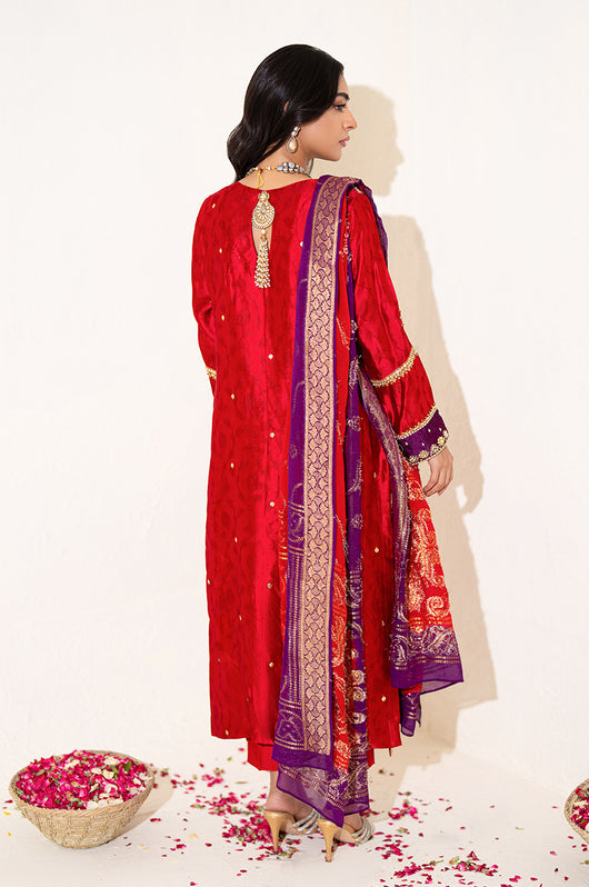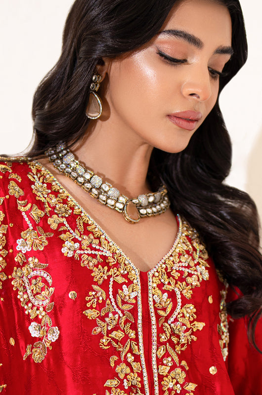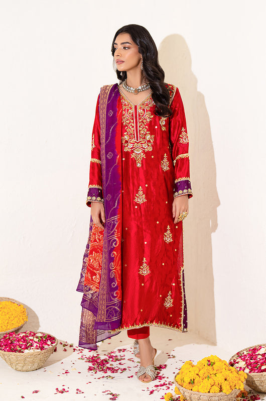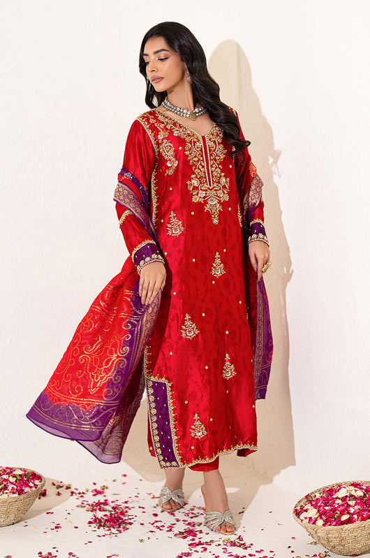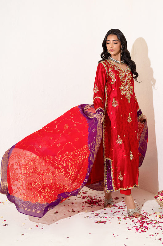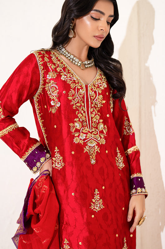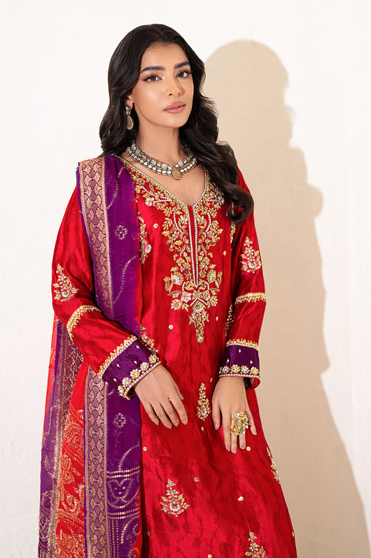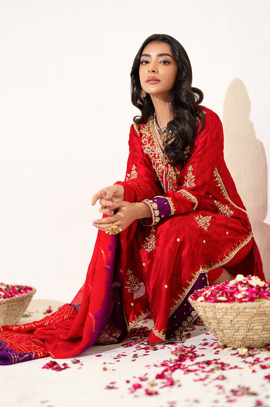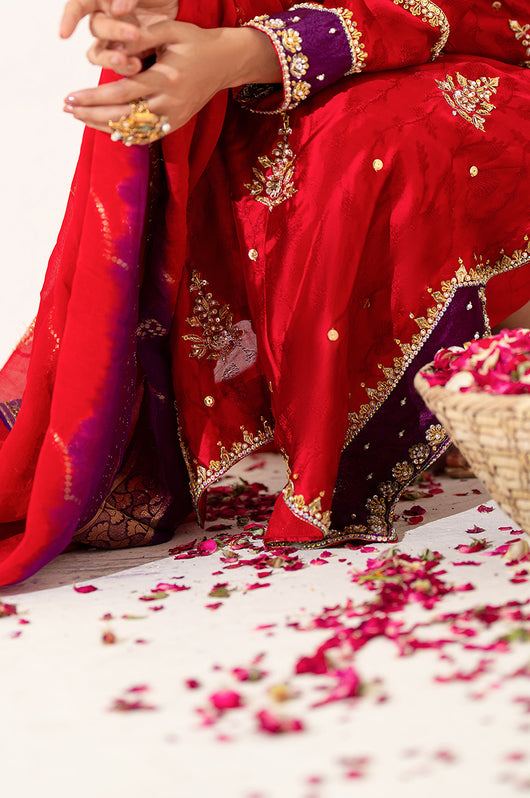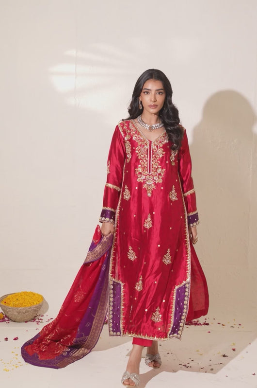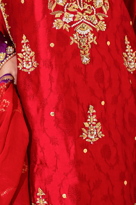 The red seesha silk shirt comes with royal purple applique, and is fully hand embellished with a heavy neckline, motifs all over the shirt and heavily embellished daman and sleeves. There is a motif in the back to complete the look with chan all over. The dress comes with bosci silk red pants and a pure banarsi chiffon dupatta in shades of red and purple to complete the look.