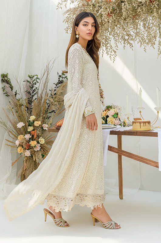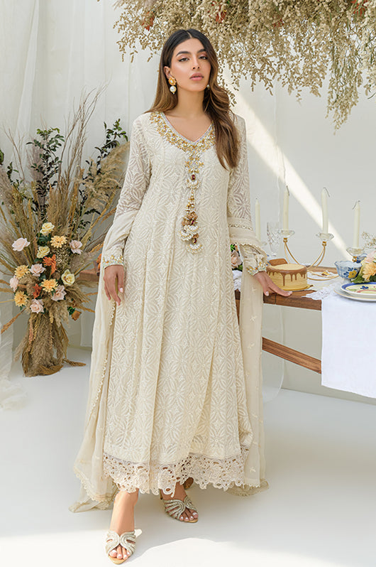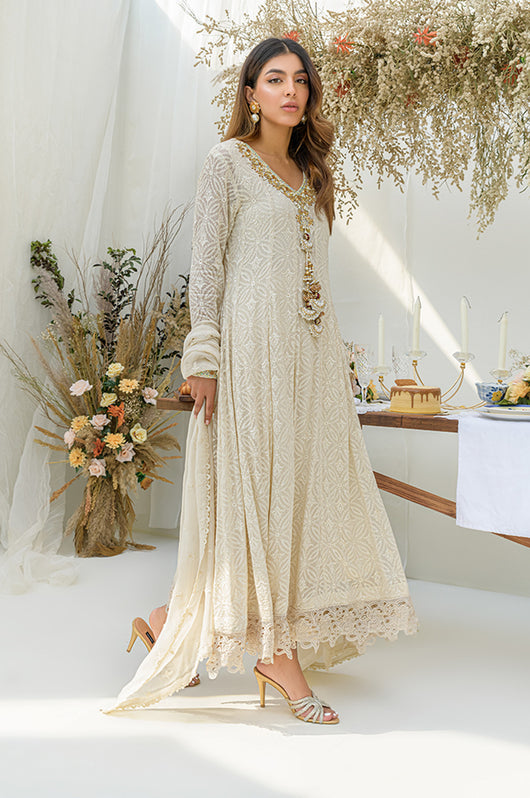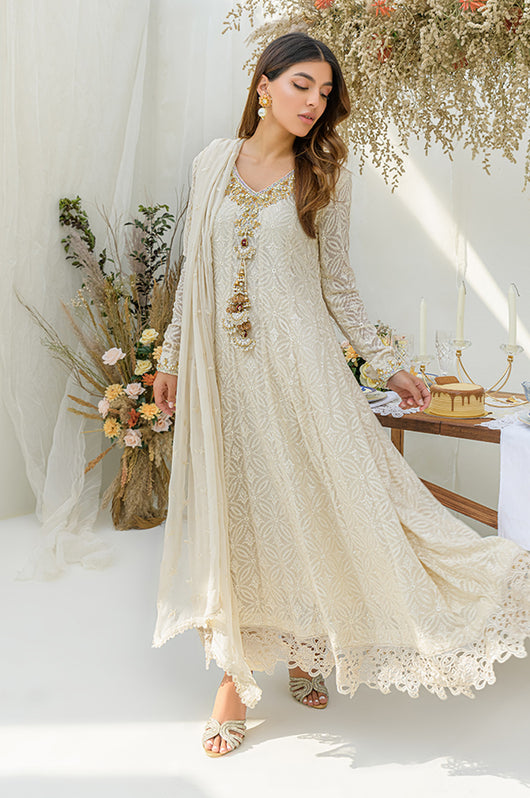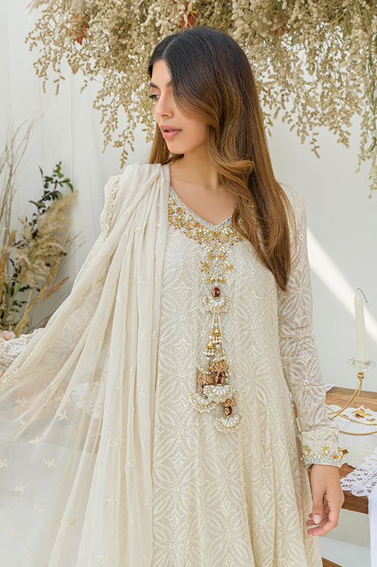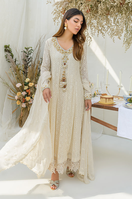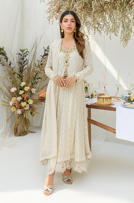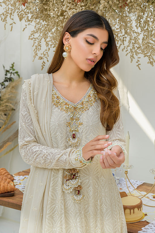 This ivory dress is a season must-have with a kalidar shirt with a heavily embellished neckline with tassel details adding to the charm of the shirt. Comes with a border and chiffon embroidery dupatta. The length of the shirt is 52-53 inches including the border. Comes with straight same colored pants. Hand embellishments also include Swarovski stones and other self-colored materials.
