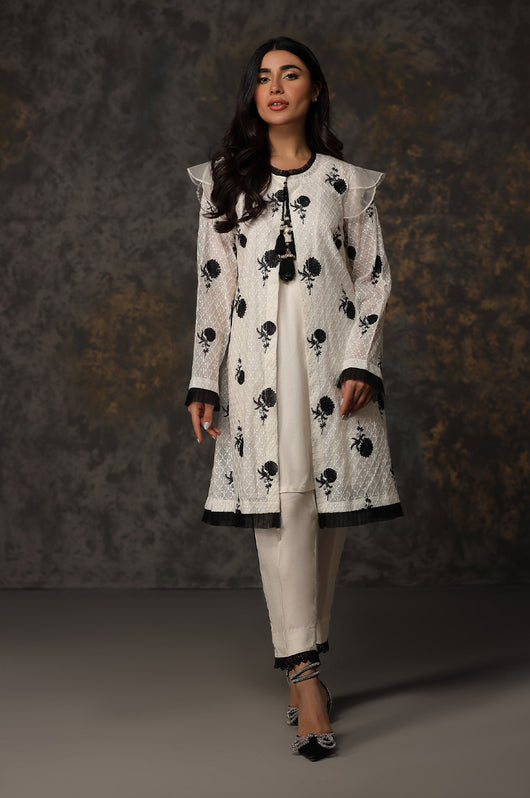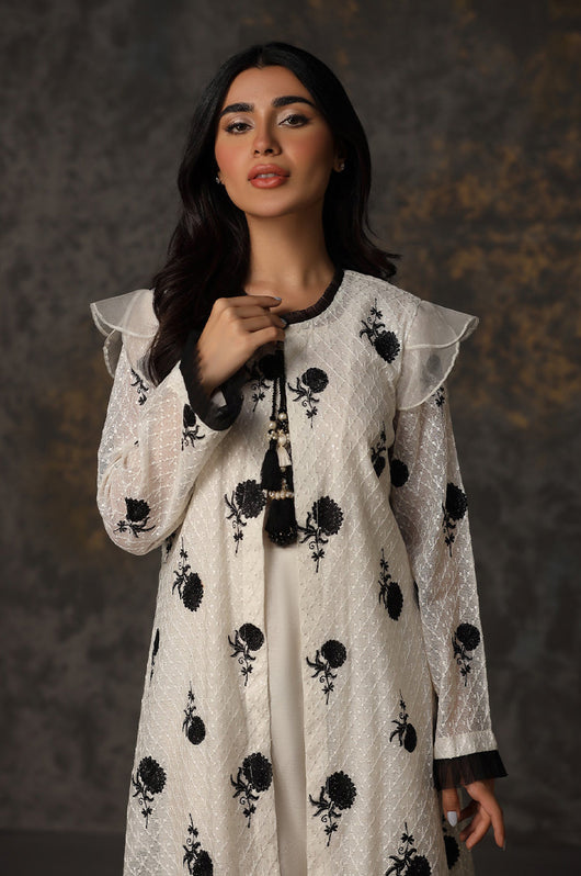 This embroidered outfit has sequence stitched all over the shirt. The front open shirt with ruffled shoulders and black pleated detail finishes. Comes with lace detailed silk pants.
