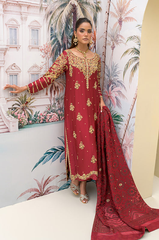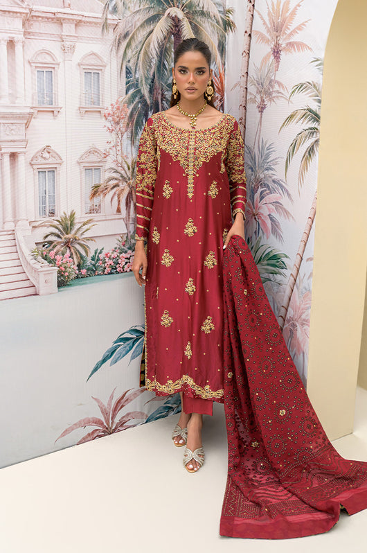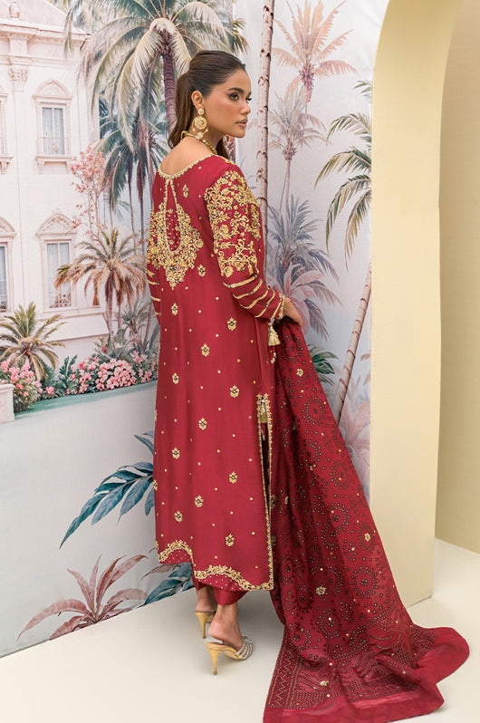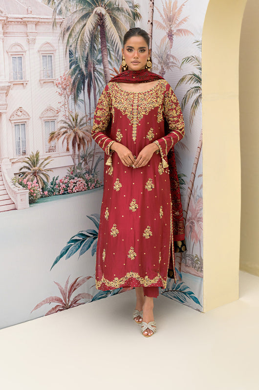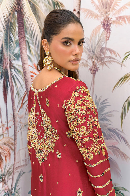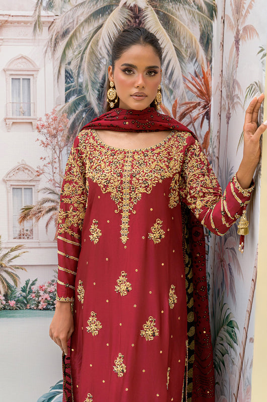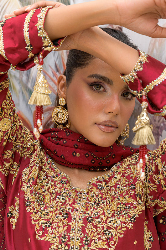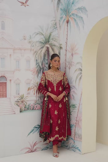 Burgundy Red is a heavily embellished shirt with details on bodice and sleeves along with chaks and daman with a wave like hand work details. The outfit comes with a chiffon chunri dupatta with black and gold inlay and maroon pants made in sheesha silk for complete look. The outfit comes with signature tassel details on the chak and sleeves to complete the look.
