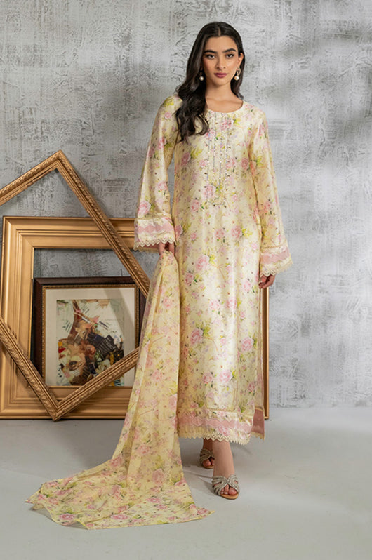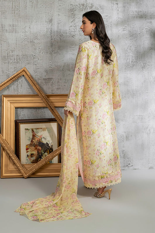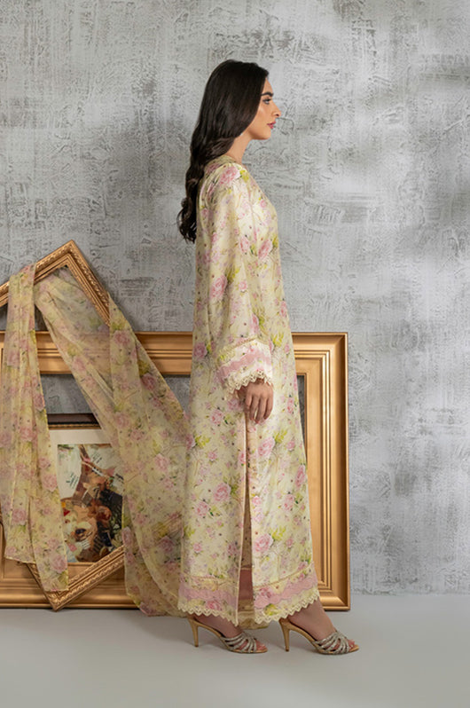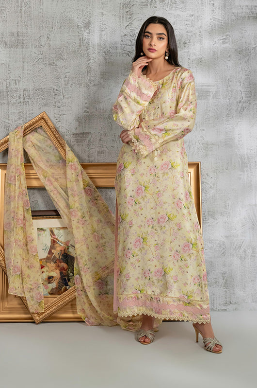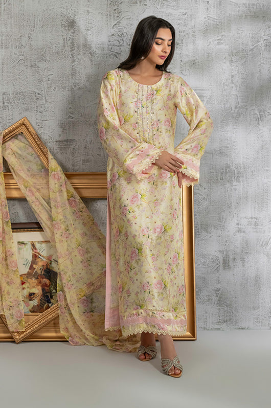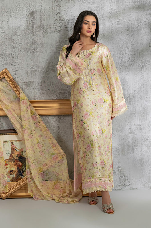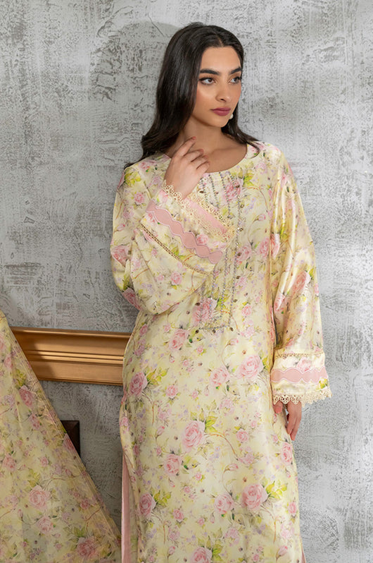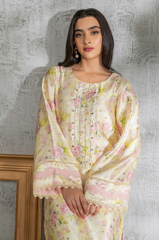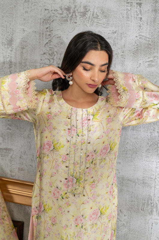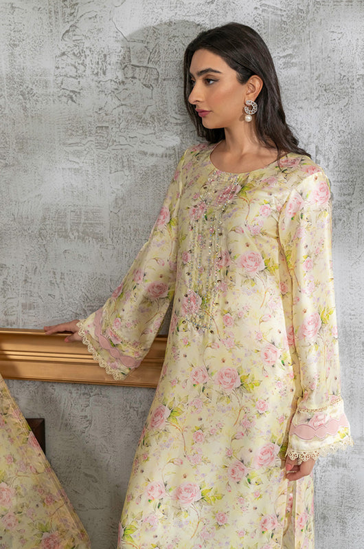 The butter yellow Charmeuse silk with hand embellishments on the neckline, butter yellow lace finishes and pink applique details on the long shirt. Comes with straight pants and silk chiffon dupatta.