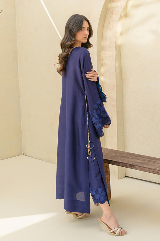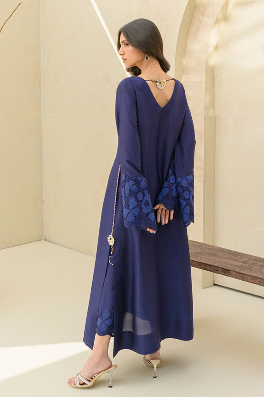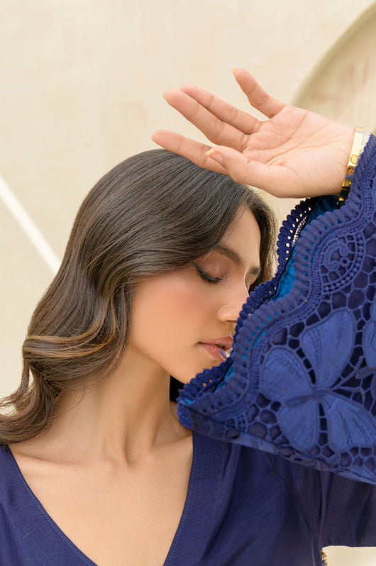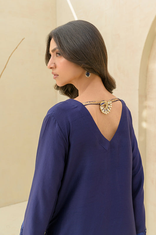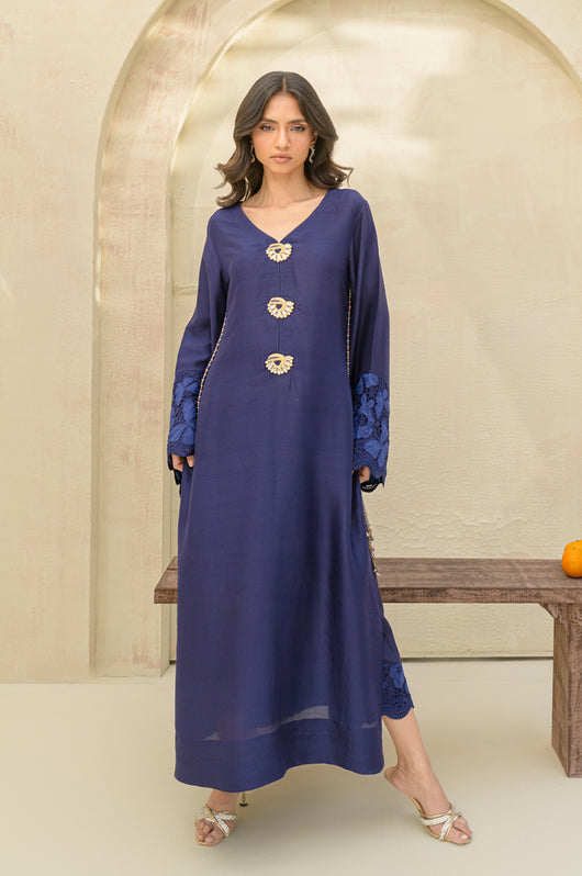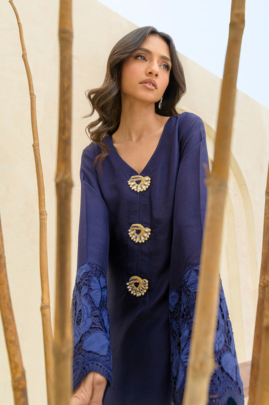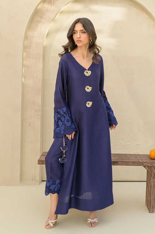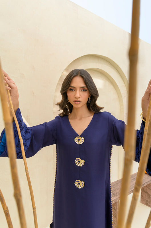 Carman - is a long kaftan style shirt and pants made in pure raw silk 80 gms, the outfit looks graceful and has a contrast of firozi blue finish running all over the shirt and sleeves. The relaxed sleeves have embroidered cutwork details and the same on the pants. Embellished with motifs on the front and back with a v neckline and side tassel details till the side slit of the shirt.