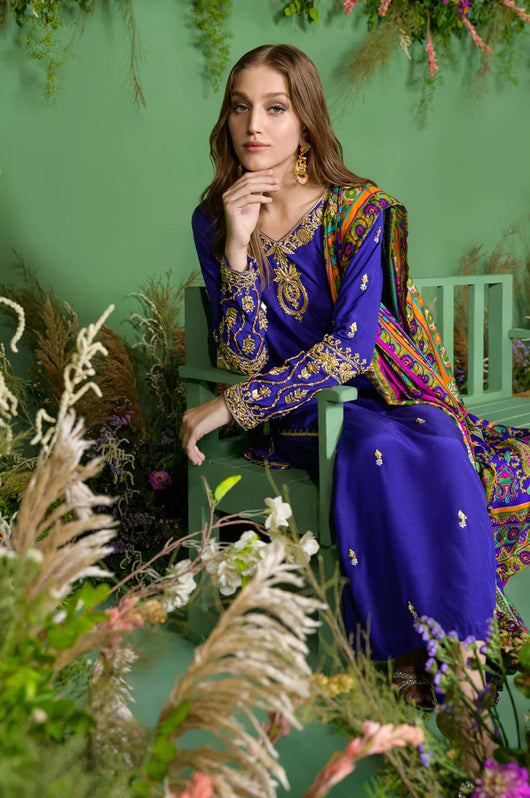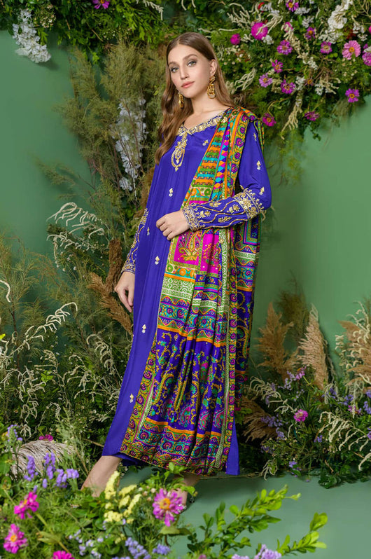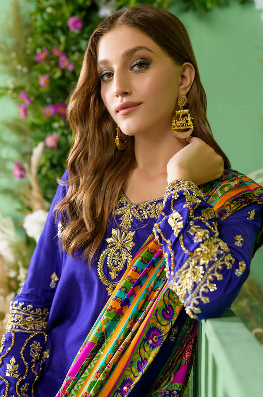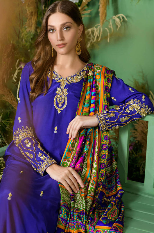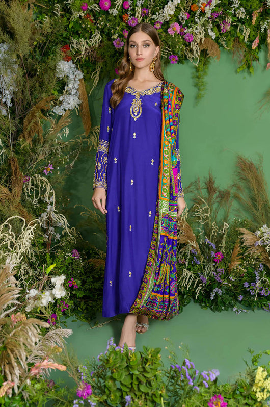 This bluish purple pure silk A-Line shirt showcases fine craftsmanship. It is embellished with gotta, stones and zardoze work around the keyhole neckline and sleeves with motives on the front. Paired with a printed digital printed dupatta which is also embellished with the same material in hues of gold, purples and comes with matching trousers