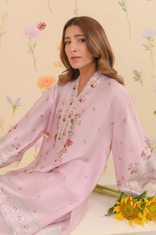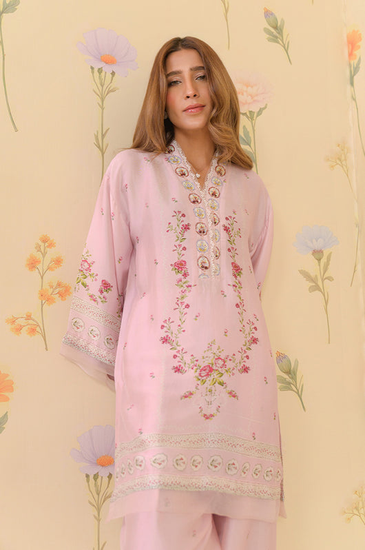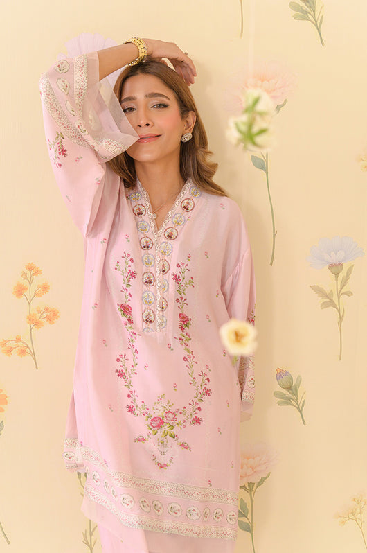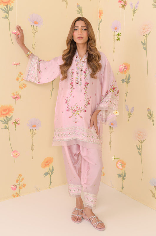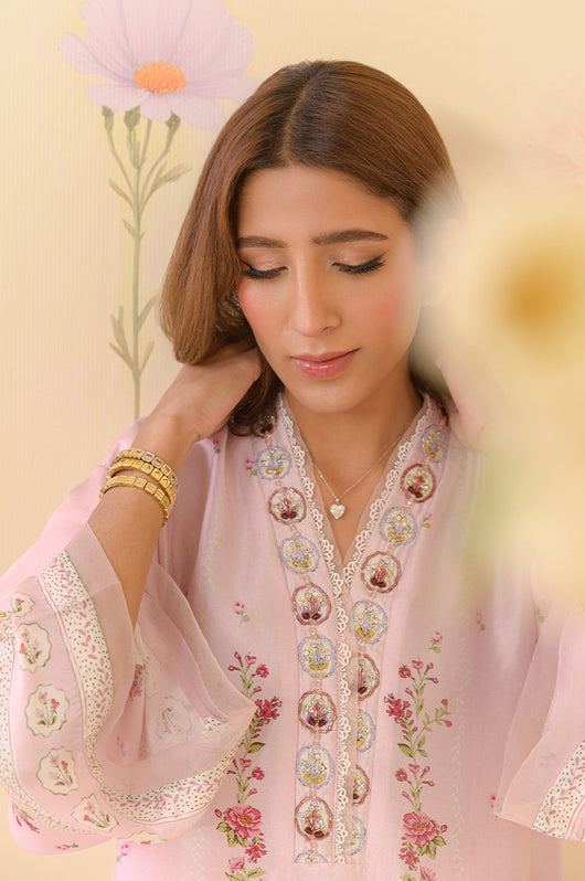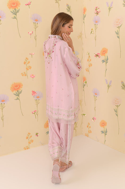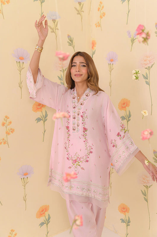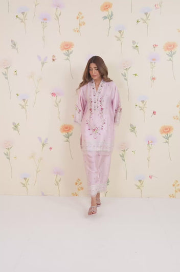 Cherry Gummy is a short shirt and a khadi shalwar with hand embellished neckline in crystals. The outfit comes with a two-piece set and has a pure organza finishes all throughout the shirt and pants. The outfit is made in pure butter silk.