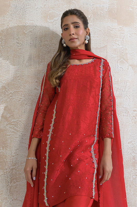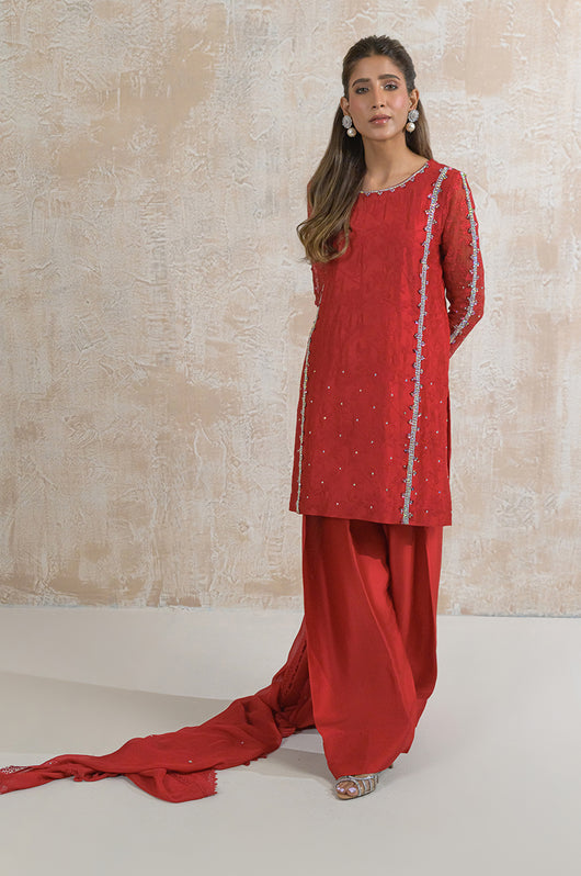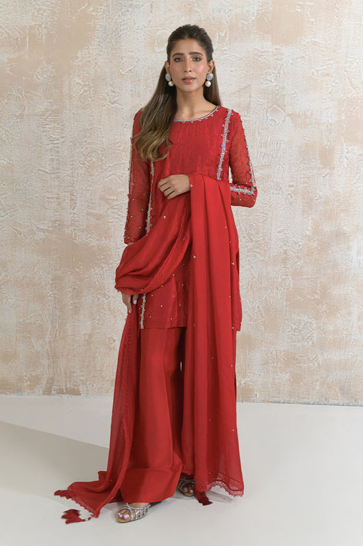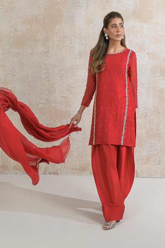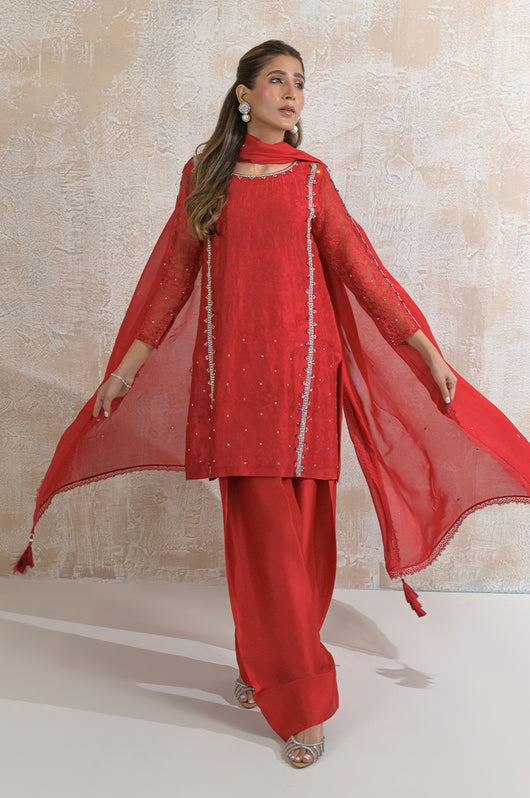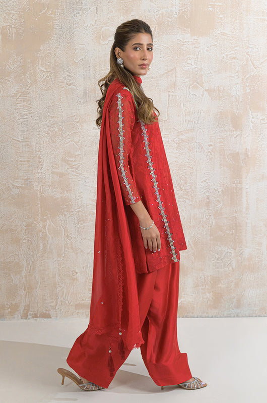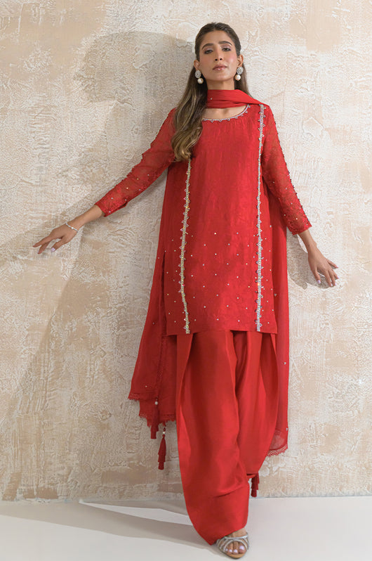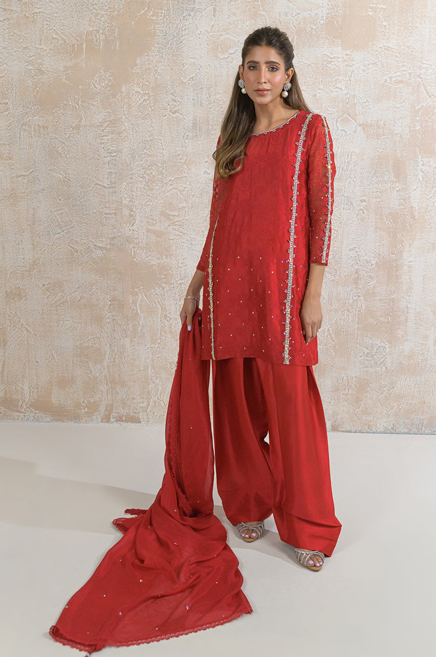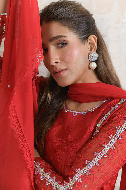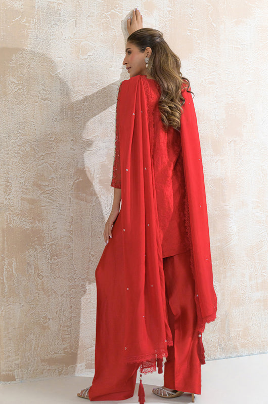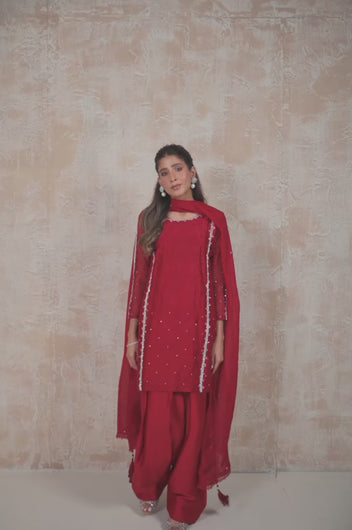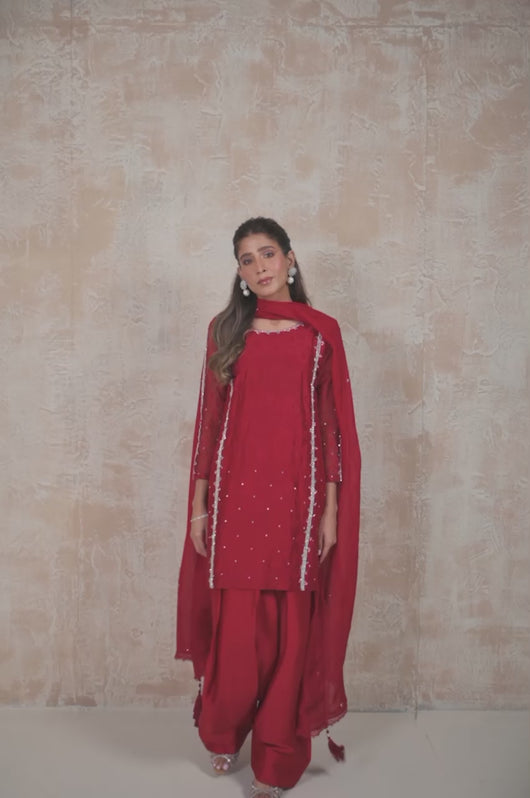 Cherry red is bright red colored self embroidered butter silk fabric, hand embellished with linear Swarovski stones on the shirt. The delicate neckline and bold pattern on the shirt and sleeves. The outfit comes with farshi shalwar and a dupatta with chan and tassel details all over.