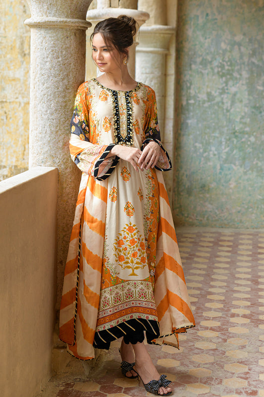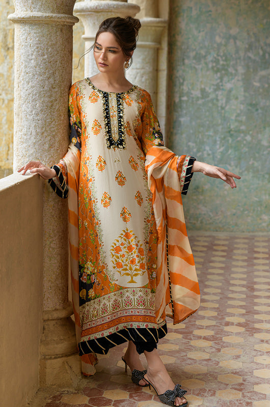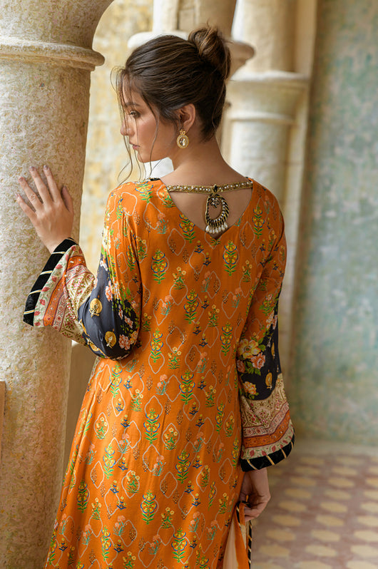 Ciel is a mustard toned base with beige and blacks on a printed canvas made in butter silk. There are velvet details on the neckline and sleeves as an applique. The dress comes with velvet black pants and a silk dupatta in two tones with black chata pati lace finishes. Length of shirt 49 inches and can be customized by mentioning in additional notes section when placing the order.
