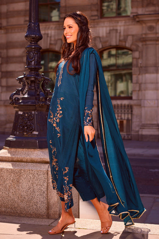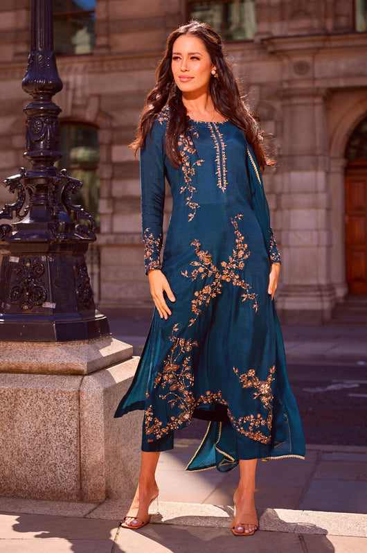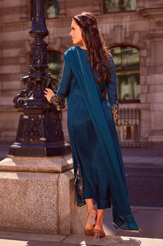 This dark sea green outfit is made with pure silk, block printed details which are further embellished with kora, dabka, stones and motives. The full sleeves have tussel details to finish the look. Comes with straight pants and a dupatta (on order)