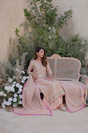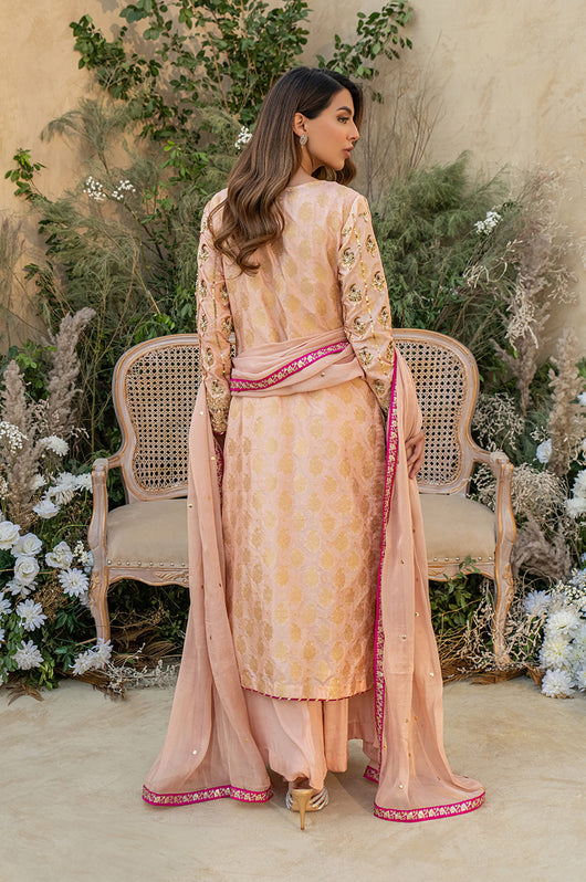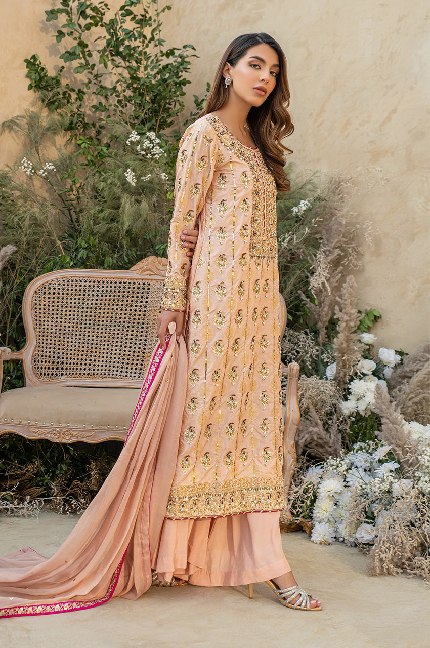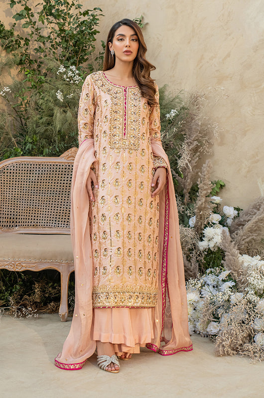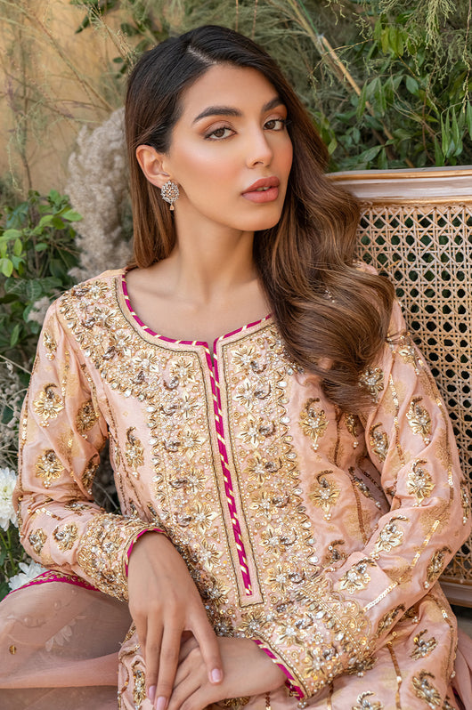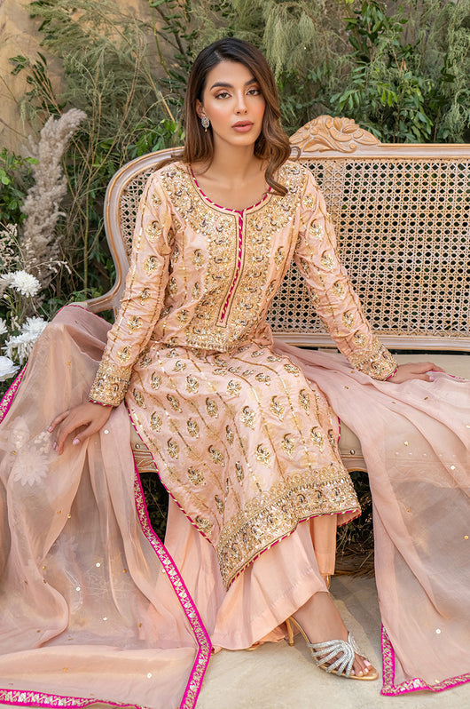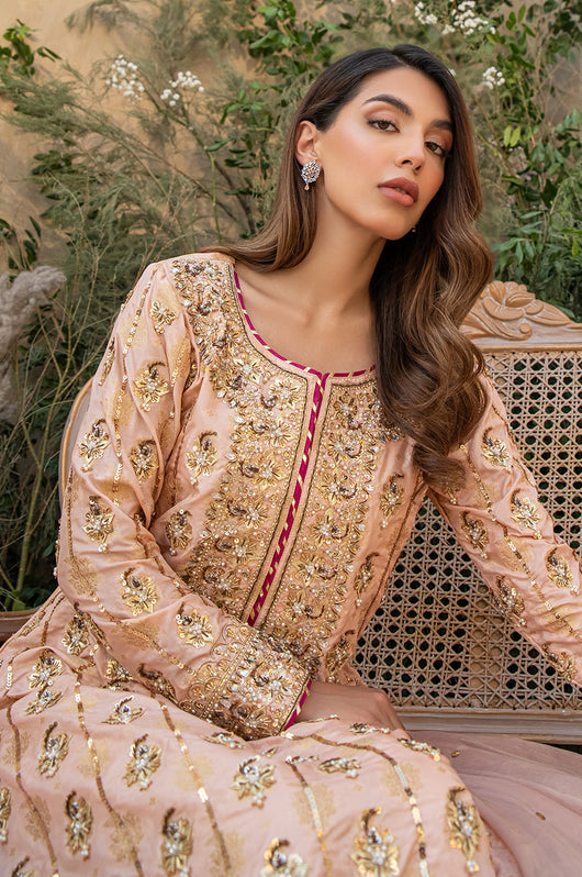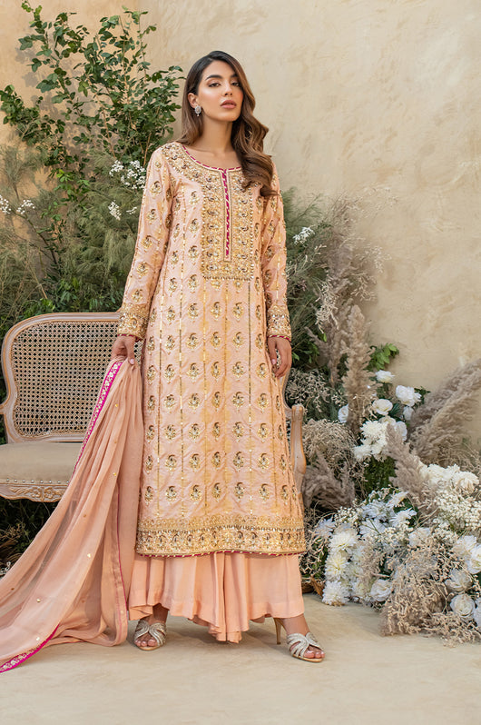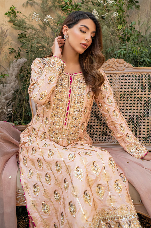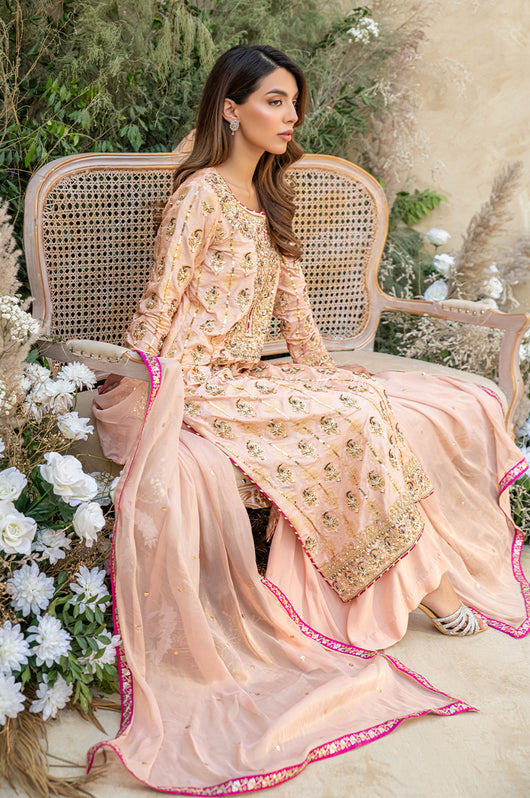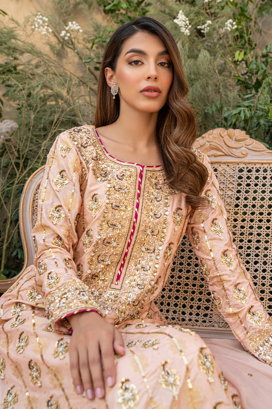 Deena is a peach colored banarsi silk shirt with embellished motifs and a heavily embellished front. With contrasting hues of dark pink the outfit is perfect for wedding festivities. The dupatta is made in gold mysore chiffon and has heavy chan all over. Comes with a flared bottom cut in a pointed direction towards the corners to add to the heaviness of the dress.