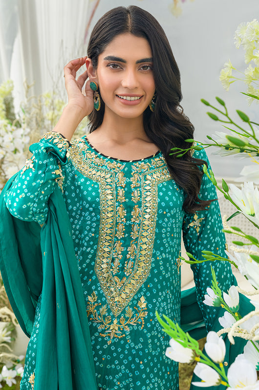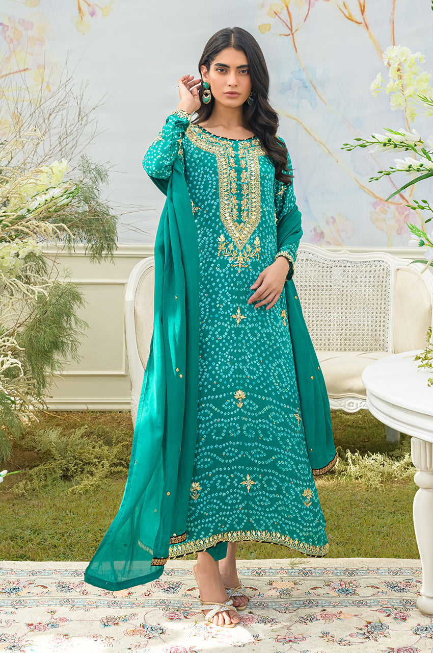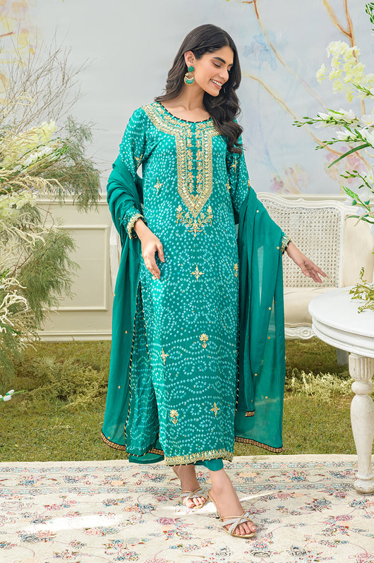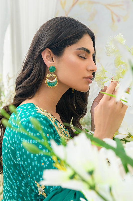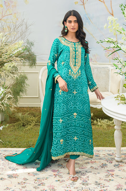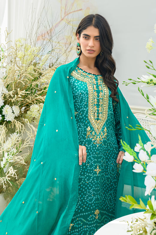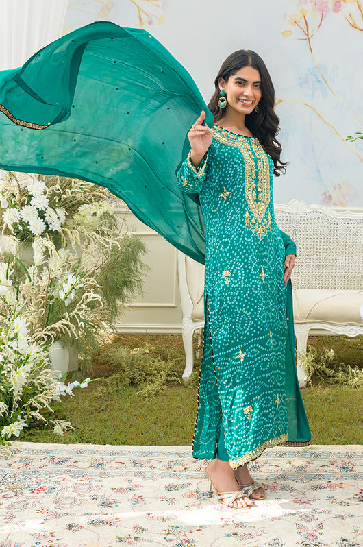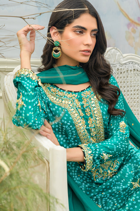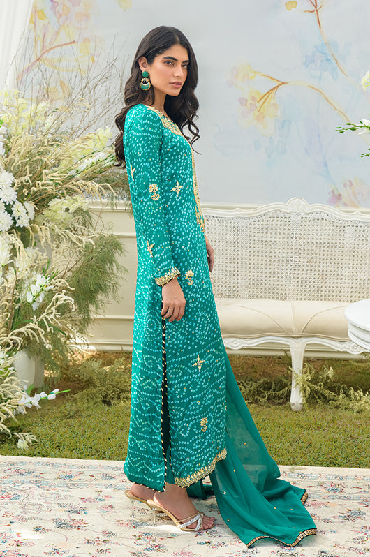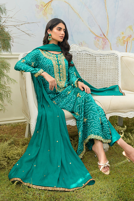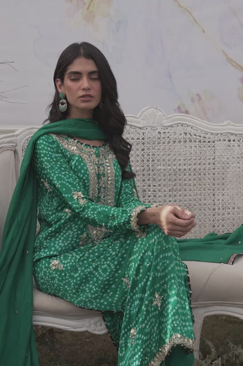 Turn heads in this beautiful green chunri ensemble perfect for a musical night or a mehndi event. The pure Charmeuse silk shirt has a heavily embellished neckline in kora, dabka and gota, followed by heavy motifs all throughout the shirt and a detailed daman. Sleeves fully embellished as well. The dress comes with silk pants of the same color and a silk dupatta with Chan details. All the edges throughout the shirt and dupatta are finished with black and gold chatapati finishes.