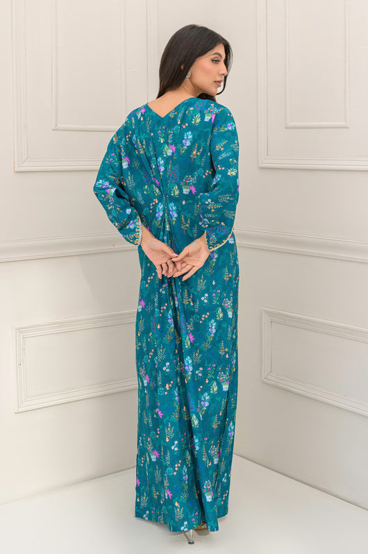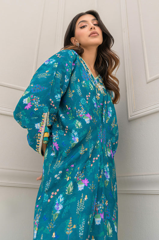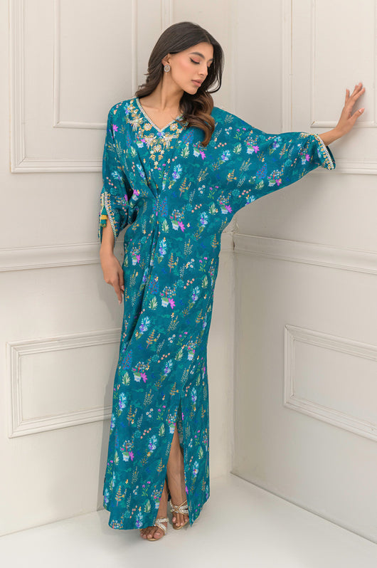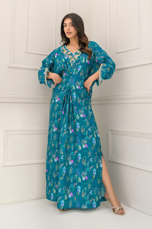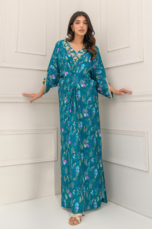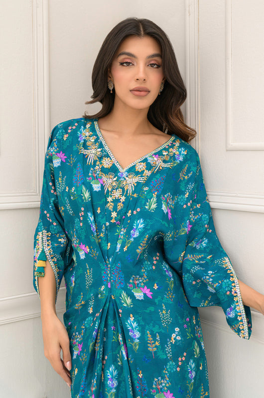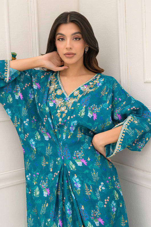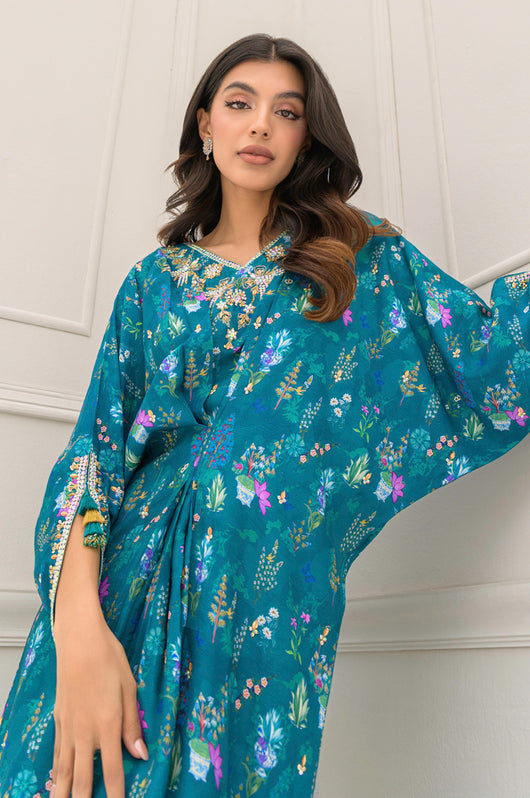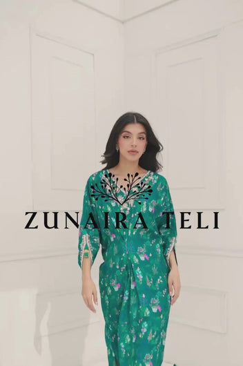 Dira is an emerald green kaftan with notes of purple a very busy print, we’ve added a heavily embellished neckline and sleeves details for a perfect easy breezy eid outfit.