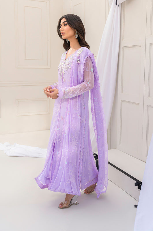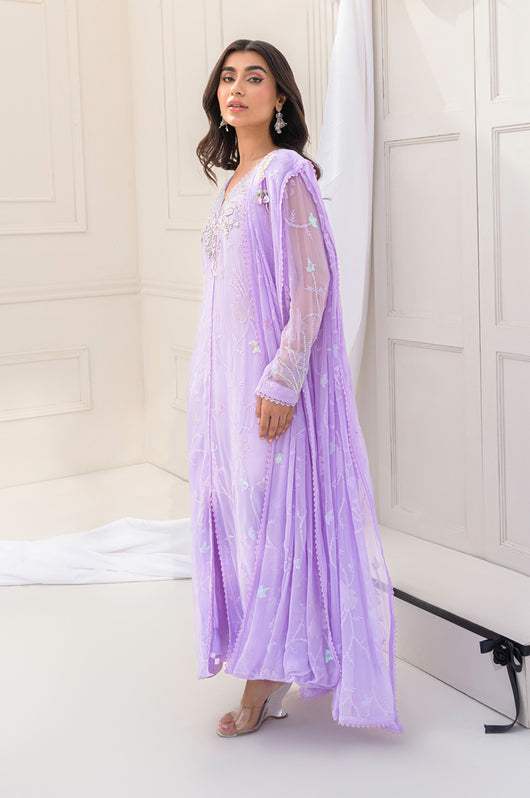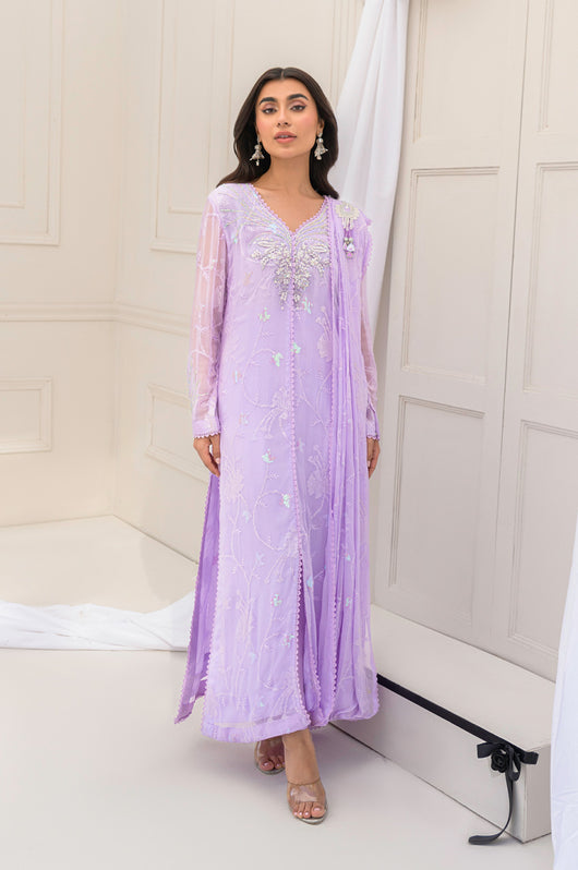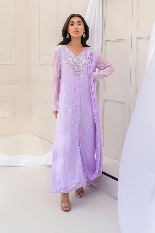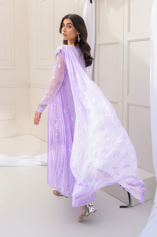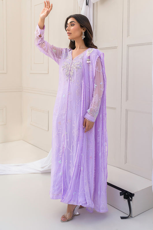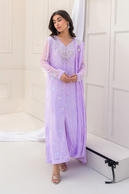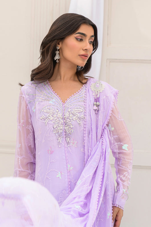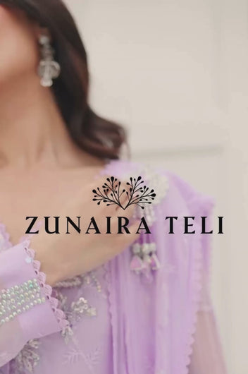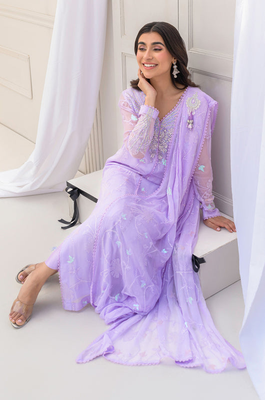 Eila is a pastel lilac sarree cut style drape dress made in chiffon with white transparent sitaray. It comes with a heavily embellished neckline made in the same lilac color and multi-colored sequins. Comes with a broch on the side of the dupatta and lace details throughout. The dress comes witj complimentary cotton silk same colored pants.