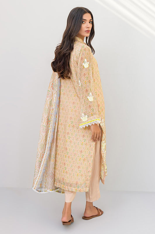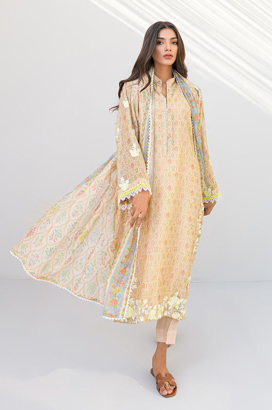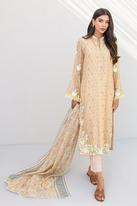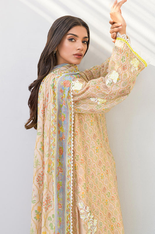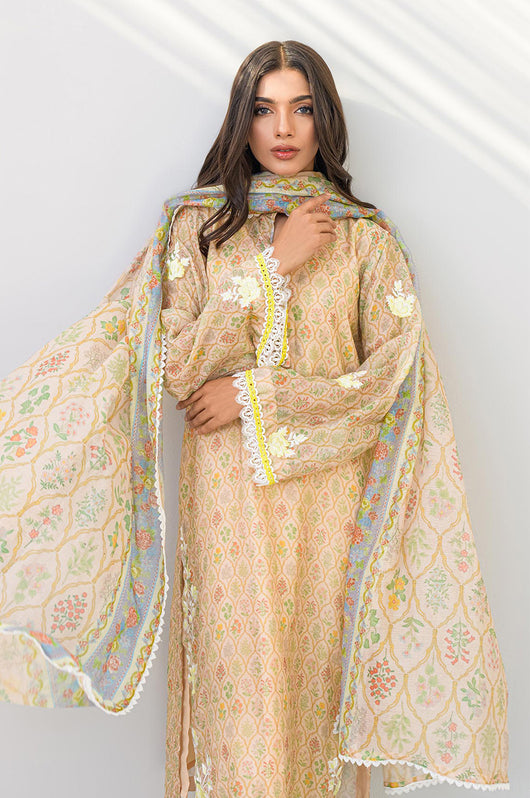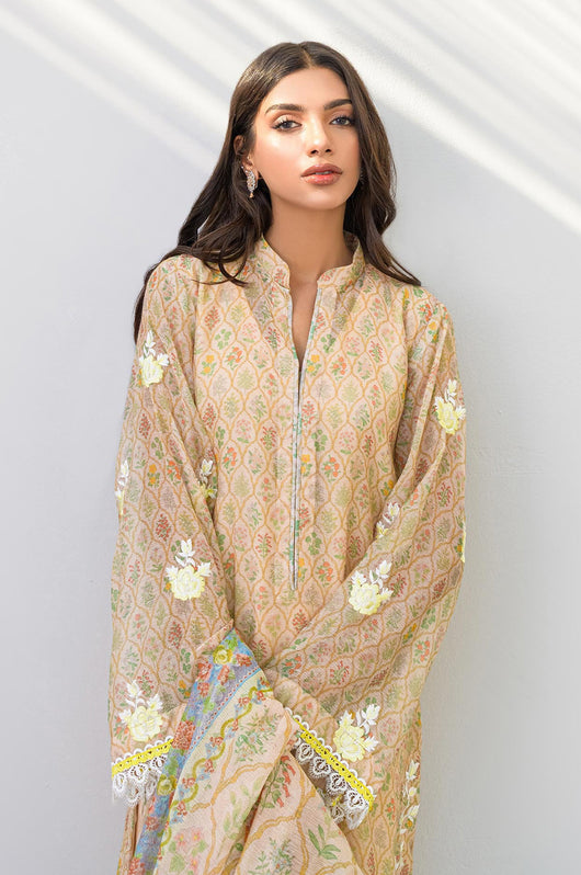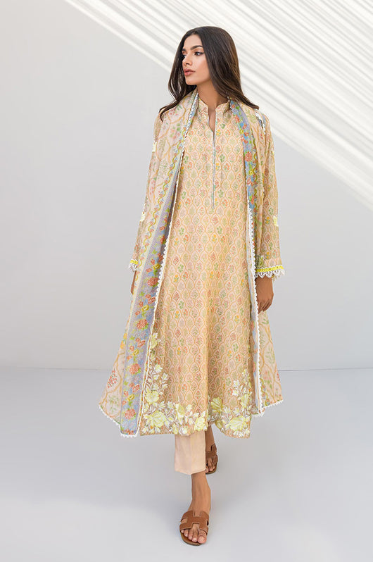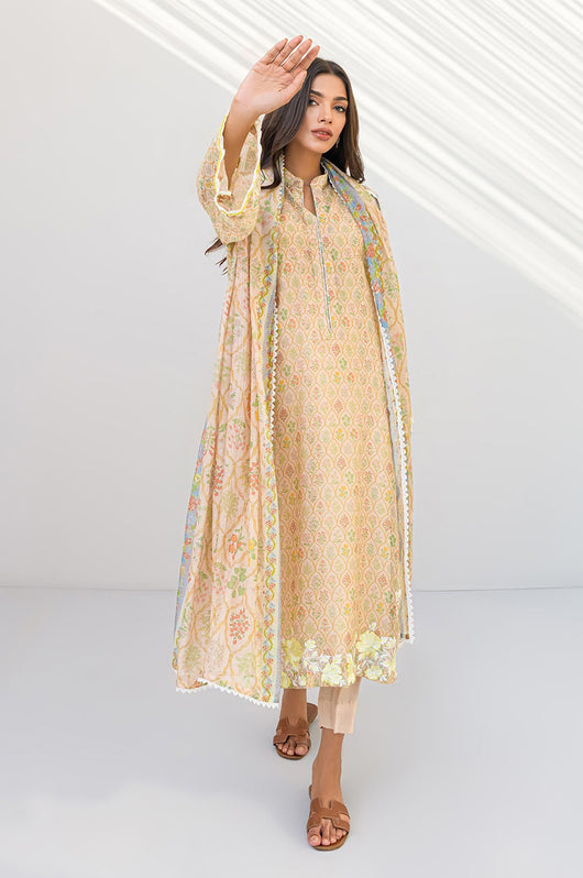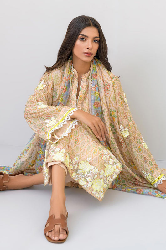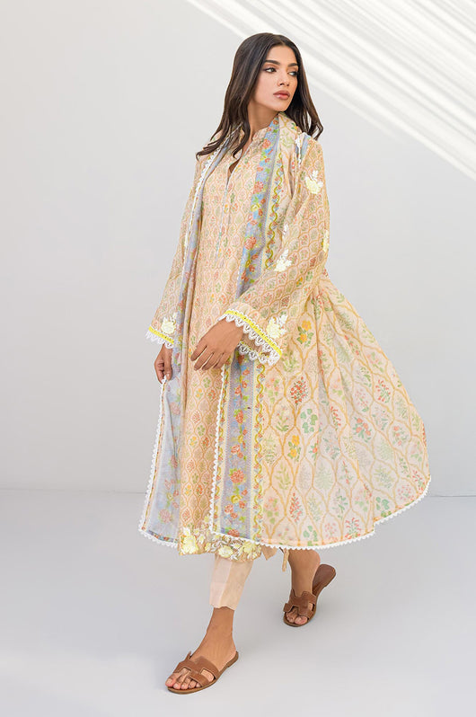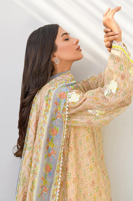 A long cotton net shirt is artfully rendered with a delicate floral print in a multicolored hue on a pale peach canvas and features embroidered motifs on chak and all over the sleeves with shades of lime on an ivory bed of embroidered flowers. Paired with matching pants and a printed cotton net dupatta in shades of lime, peach and multi with white lace detailing.