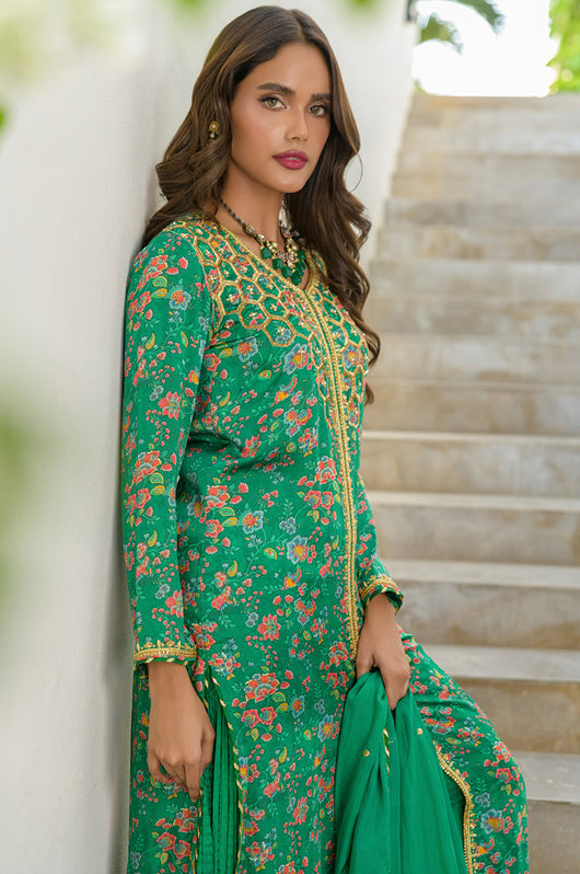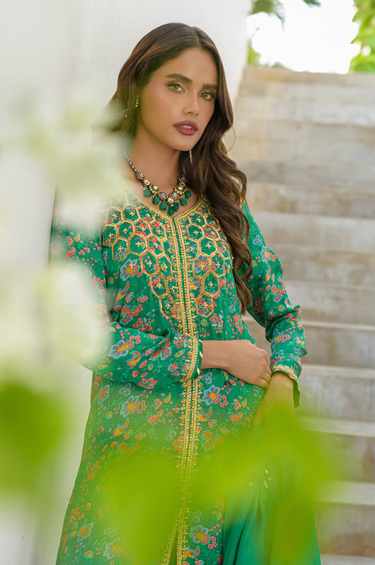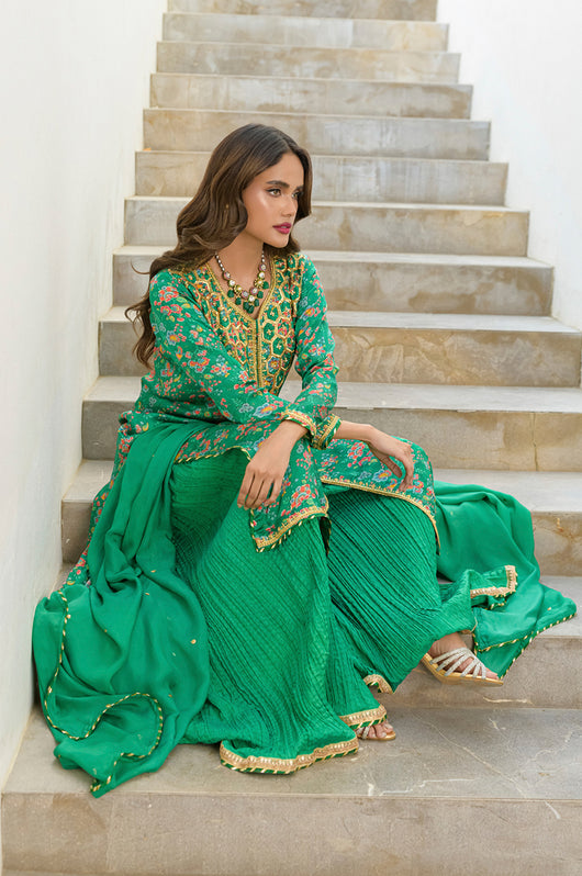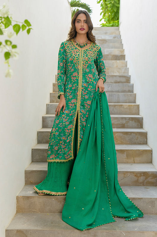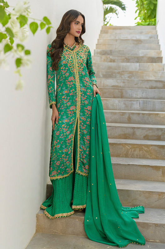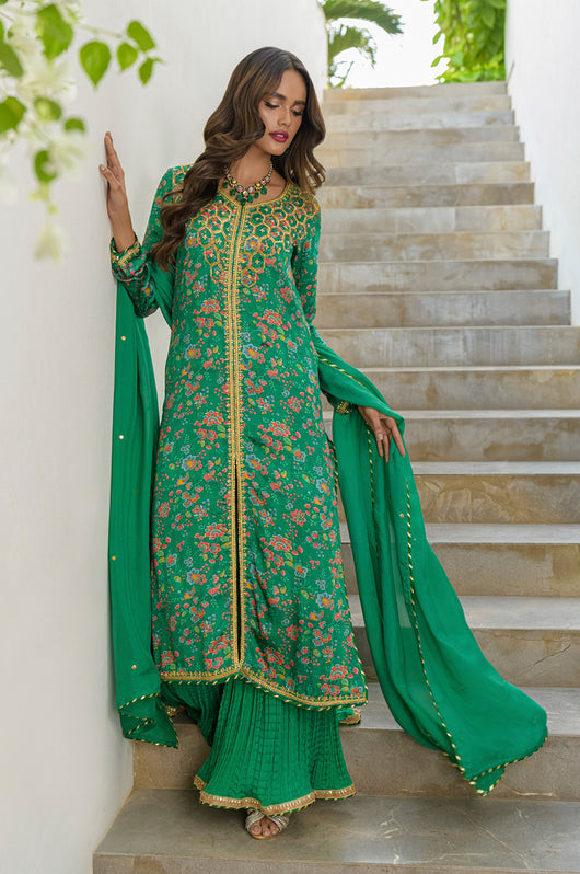 Elka is a forest green canvas on crepe silk with multicolored floral print all over the shirt. With handwork made in gold in a bee’s hive pattern and a heavily embellished front open style and daman to complete the look. The dress comes with lace details on crushed pants and a silk dupatta with cham and lace finishes all in green.
