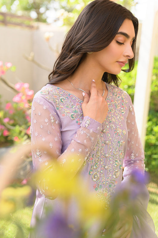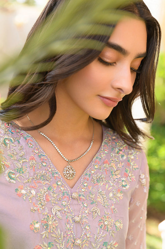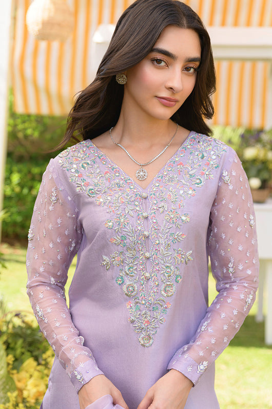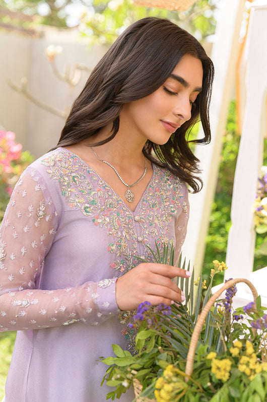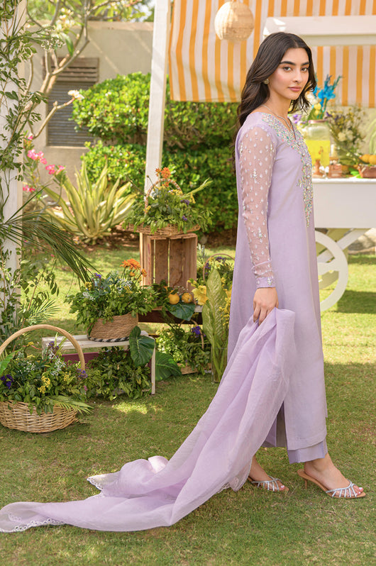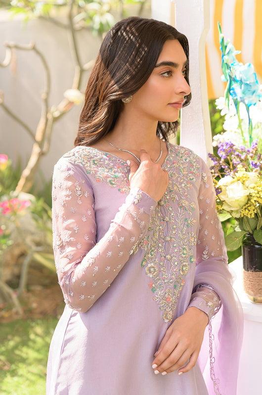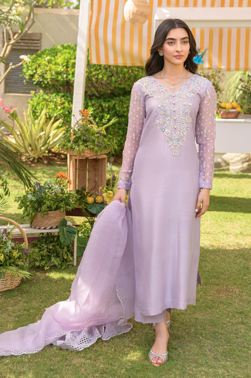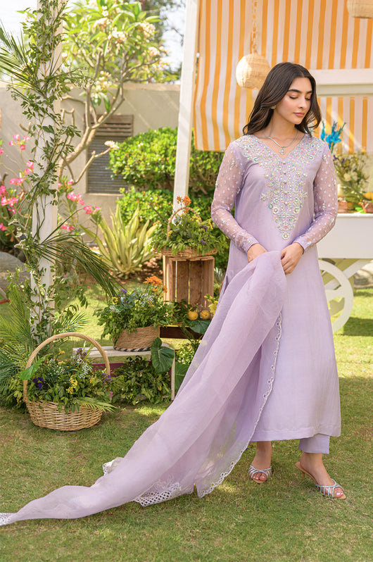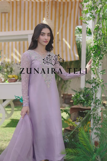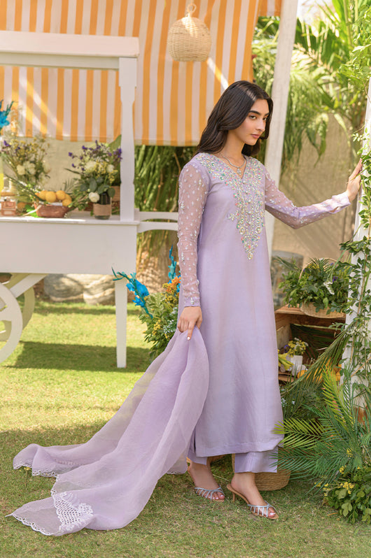 Elna is a lilac-toned pure 80 gms raw silk outfit with a heavily embellished neckline and dreamy pure organza sleeves decorated with multi-shaded motifs and chan all over. The outfit comes with pure 80 gms raw silk pants and a pure embroidered organza dupatta to compliment the look.