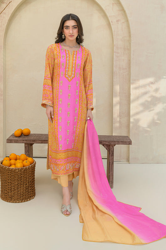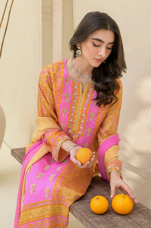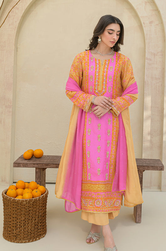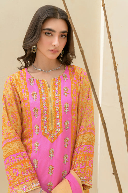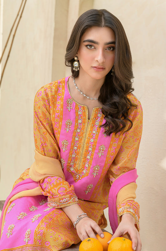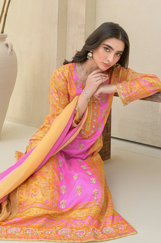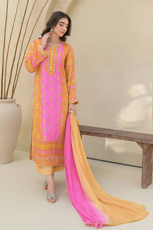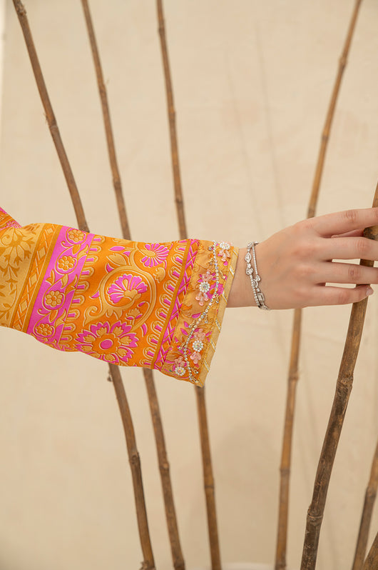 Brimming with signature RZT’s details, our new prints in confectionary hues with instantly show stopping details will have your heart skipping a beat! Cut from pure breathable medium silk, the yellow and pink shirt is printed with whimsical florals that bloom daintily all over, making this an absolute must have. The relaxed, much loved silhouette has a universally flattering neckline, adorned with delicate hand-made floral motifs, pearls and sequins making this outfit feel like a dream. The outfit is paired with wide leg pants as shown and statement two toned dupatta with sparkling details to breeze through festivities.