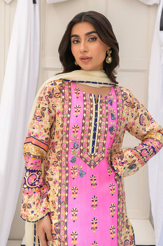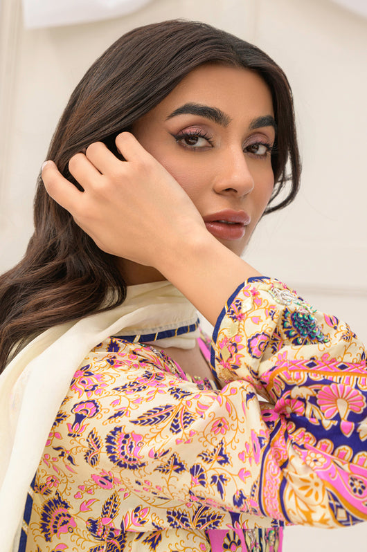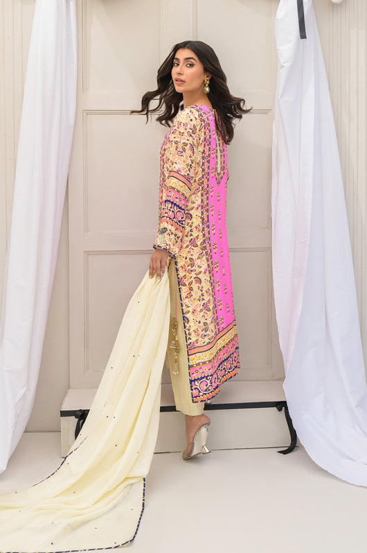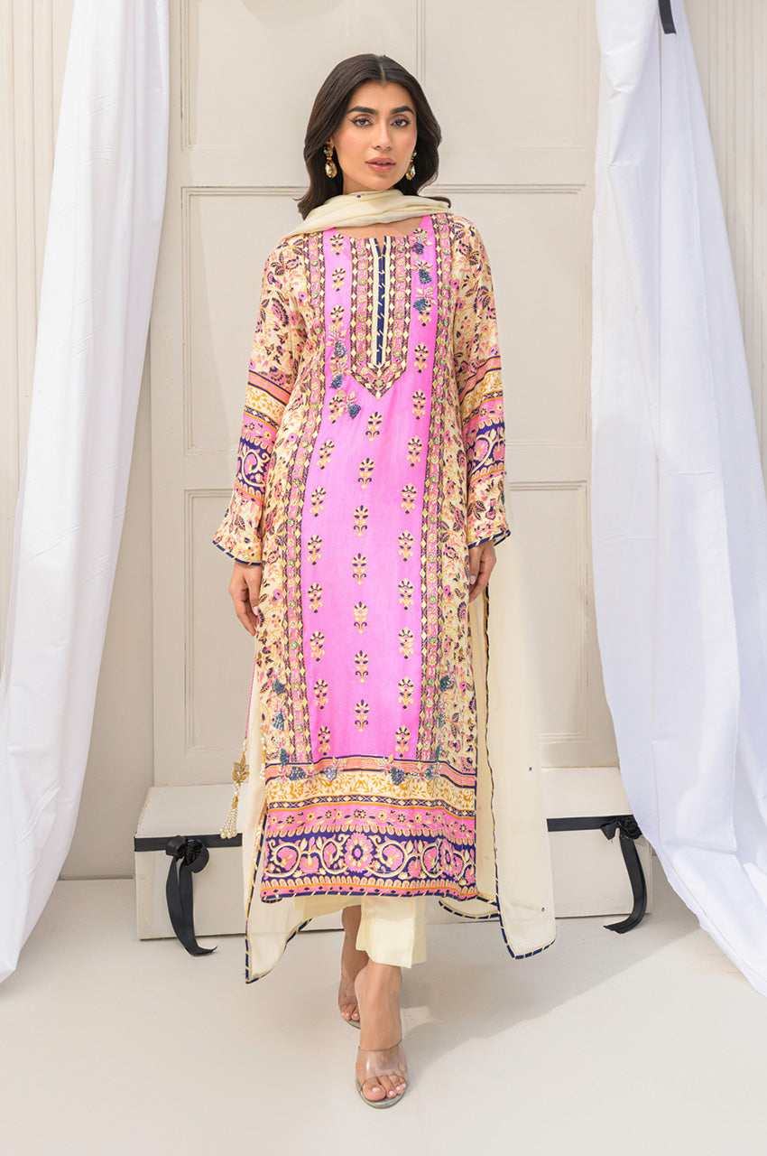 Esmay is a beautifully embellished shirt made in pure medium silk 60 gms with heavily embellished neckline and shirt front. The dress comes pants made in cotton silk and a silk dupatta with chan details and lace finishes.