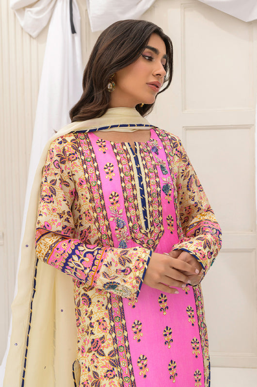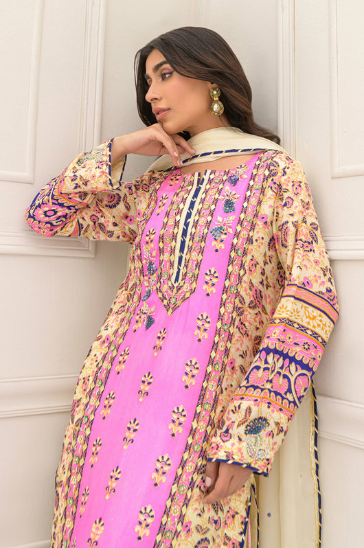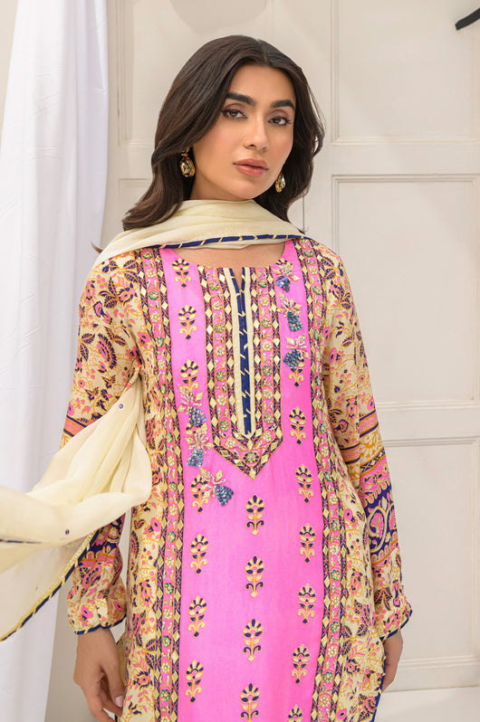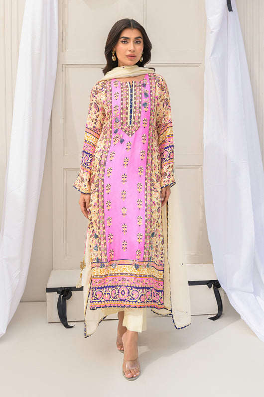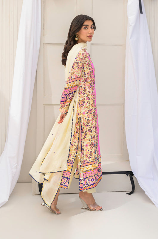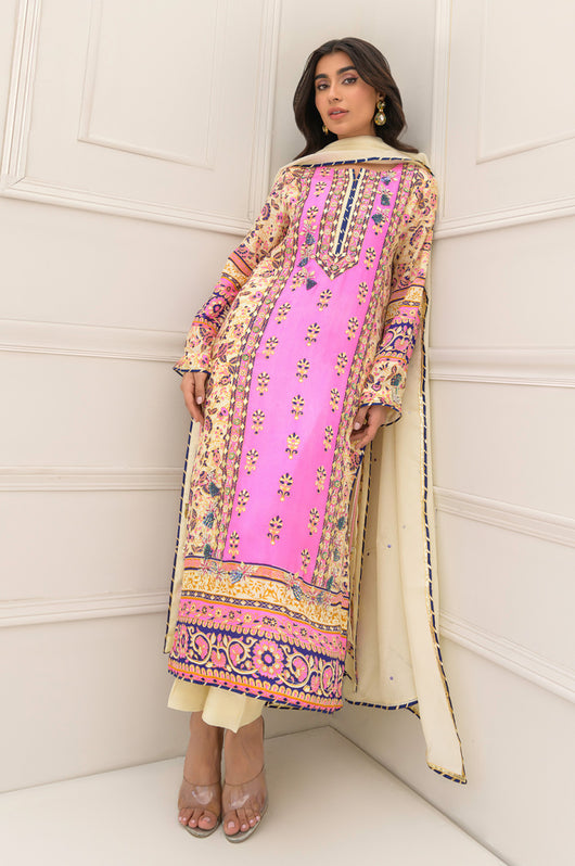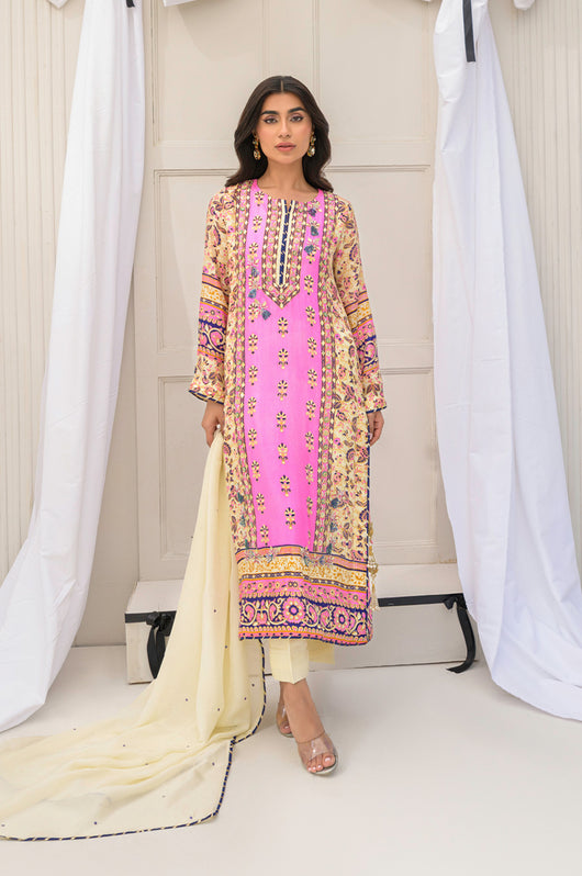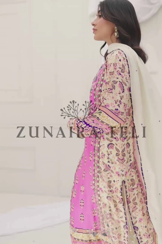Esmay is a beautifully embellished shirt made in pure medium silk 60 gms with heavily embellished neckline and shirt front. The dress comes pants made in cotton silk and a silk dupatta with chan details and lace finishes.