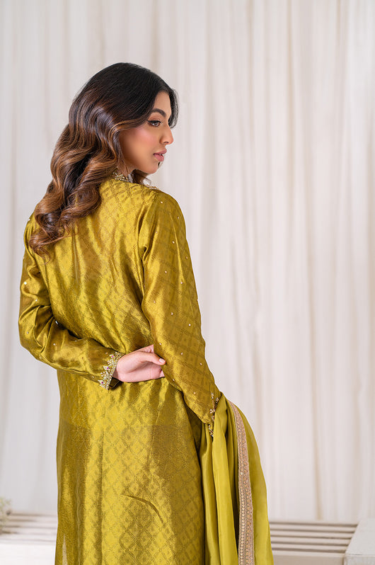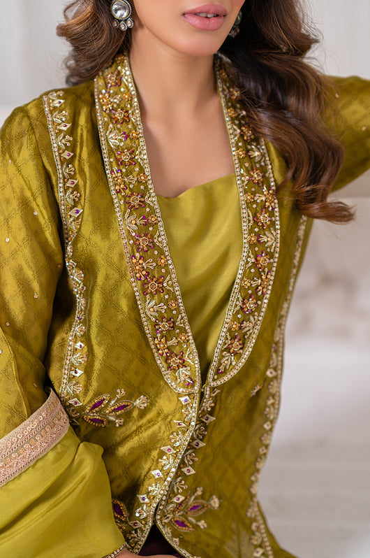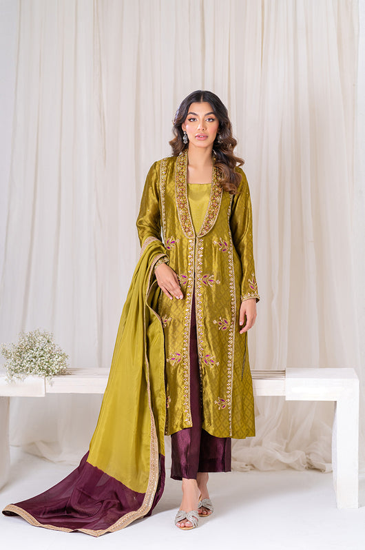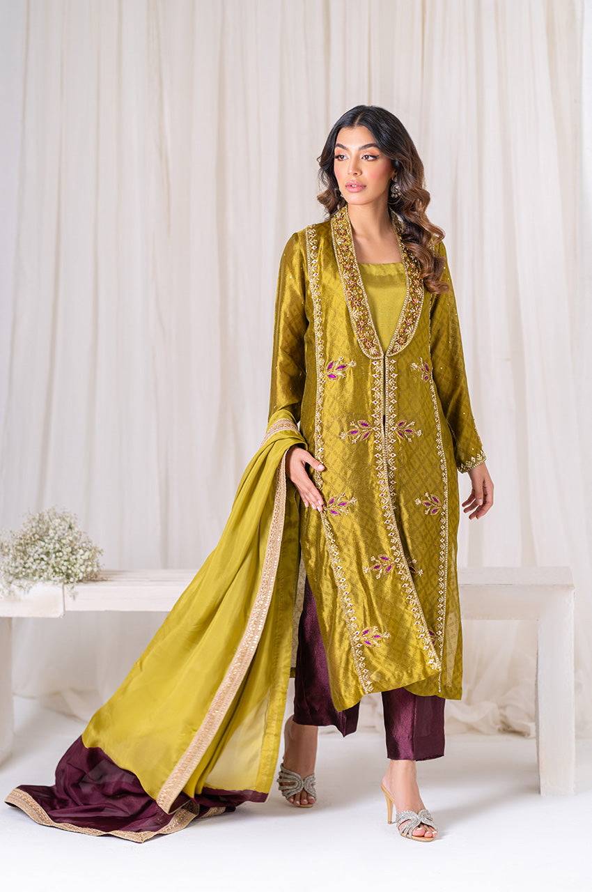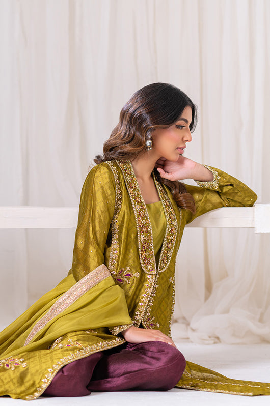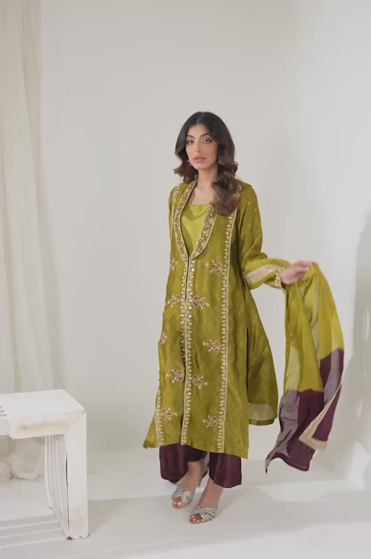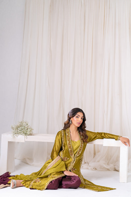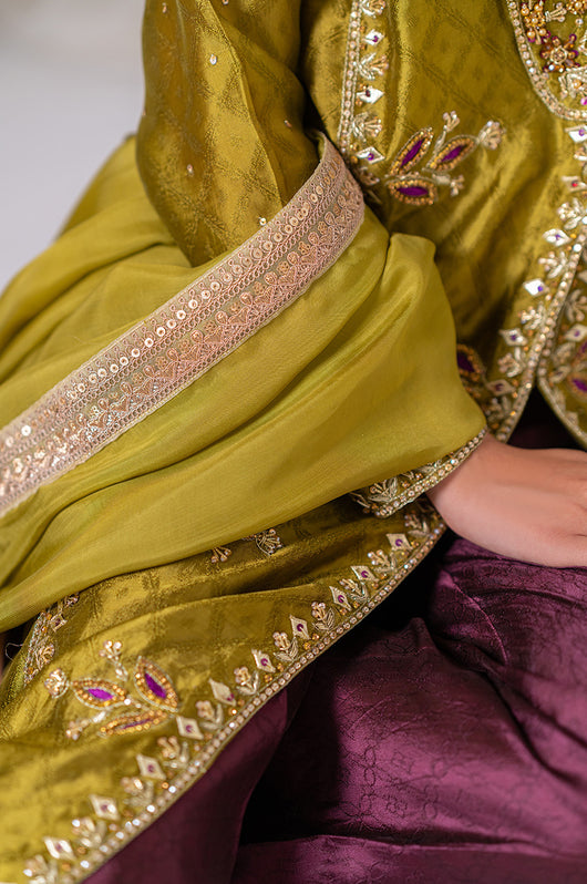 The hand embellished pure sheesha silk shirt and pants are made in olive green color and deep maroon color respectively. The dress comes with a heavily embellished shirt with a high neck collar and a front open shirt with notes of dark purple and maroon. The material used is gold kut dana, zardozi, resham and other embellishments. Paired with a two toned dupatta with traditional lace borders to complete the look. The length of the shirt is 46 inches and comes with a half inner.