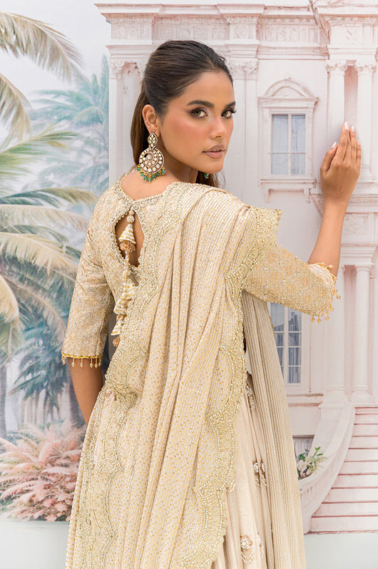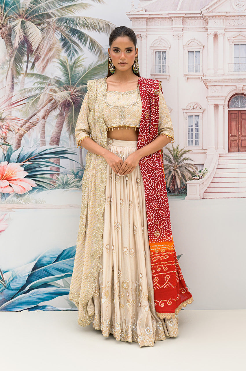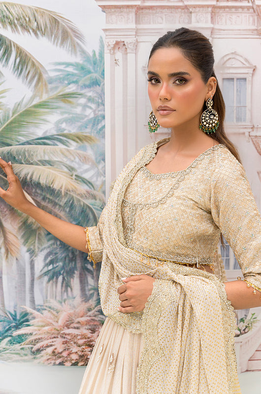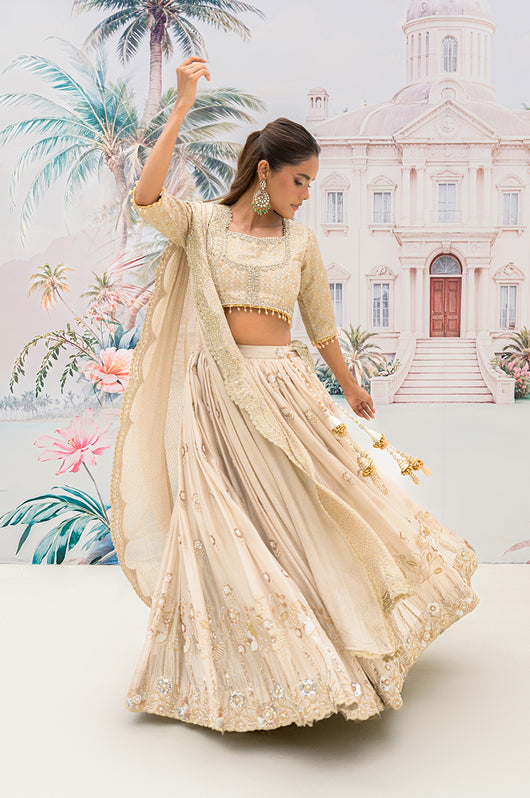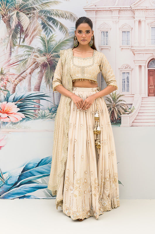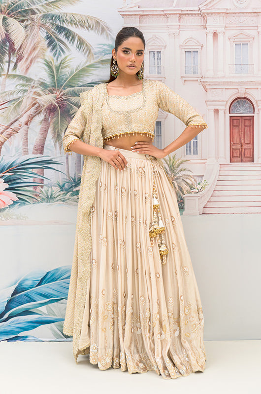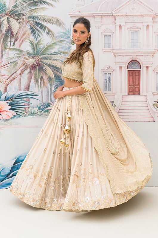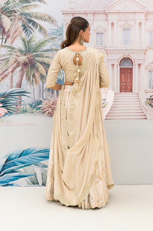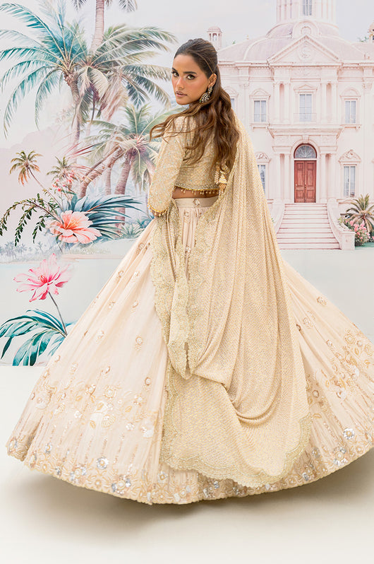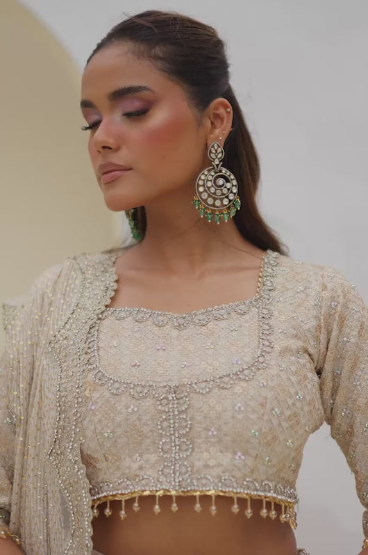 Gold dust is a lengha choli made in heavily embellished fabric with lace and hand work details on the lehnga and choli both made in mysori chiffon as the base of the fabric. The outfit comes with a heavily embellished dupatta with lace borders and tassel details on the sharara and the back of the choli.