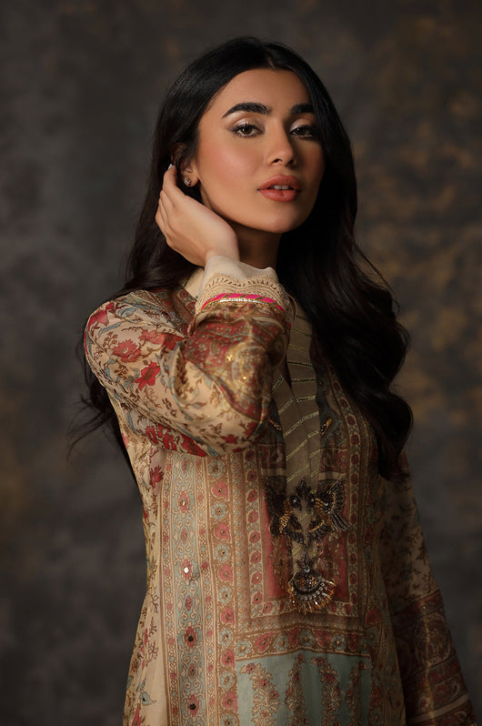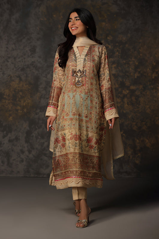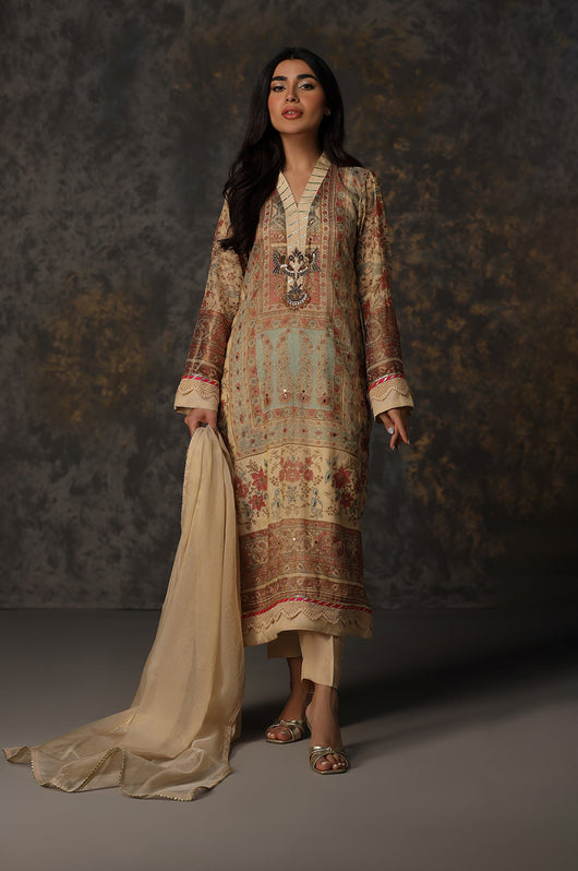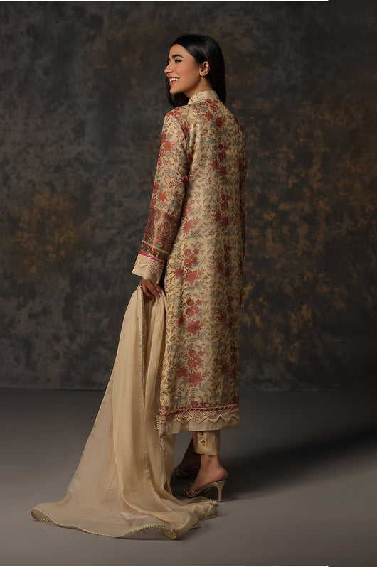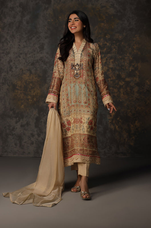 Printed gold shirt with sequence details and a motive on the neckline comes with plain straight pants. Complete the look by adding Mysori chiffon dupatta with lace details.