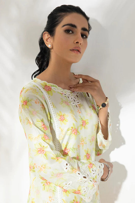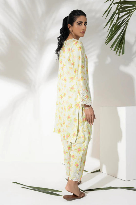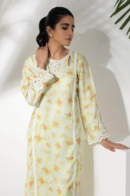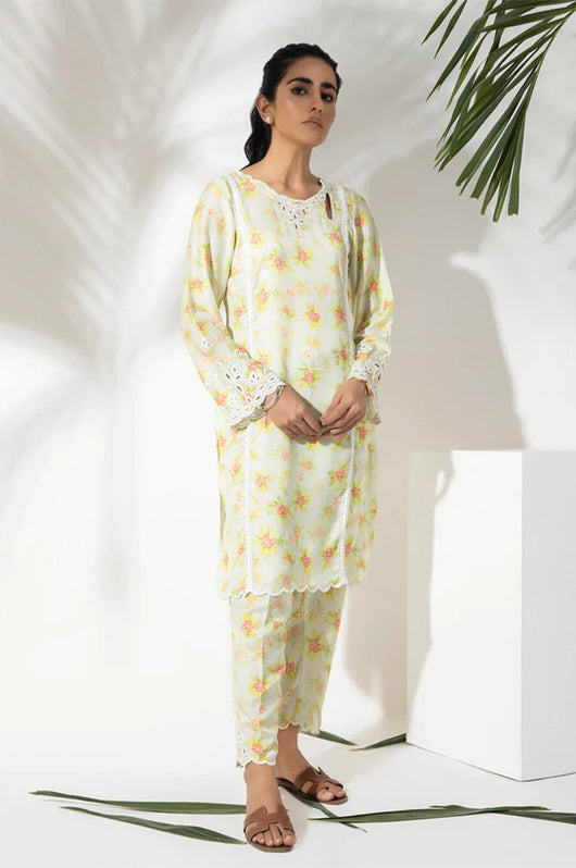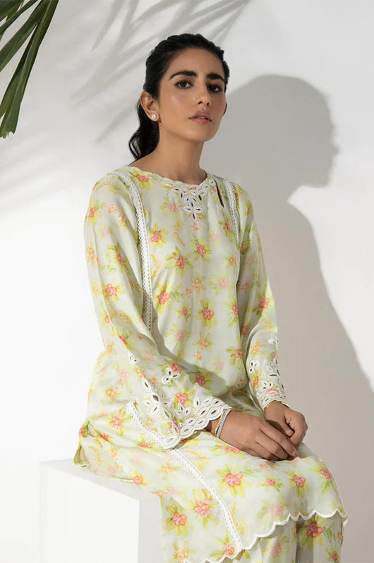 This two piece crepe silk is embroidered with cut work sleeves and has cutwork detailing even on the bottom. A casual day to night outfit for any occasion.
