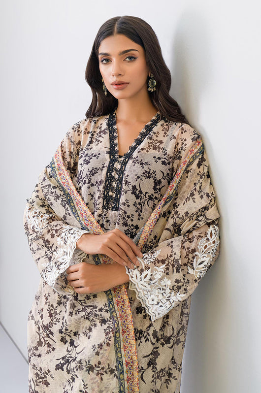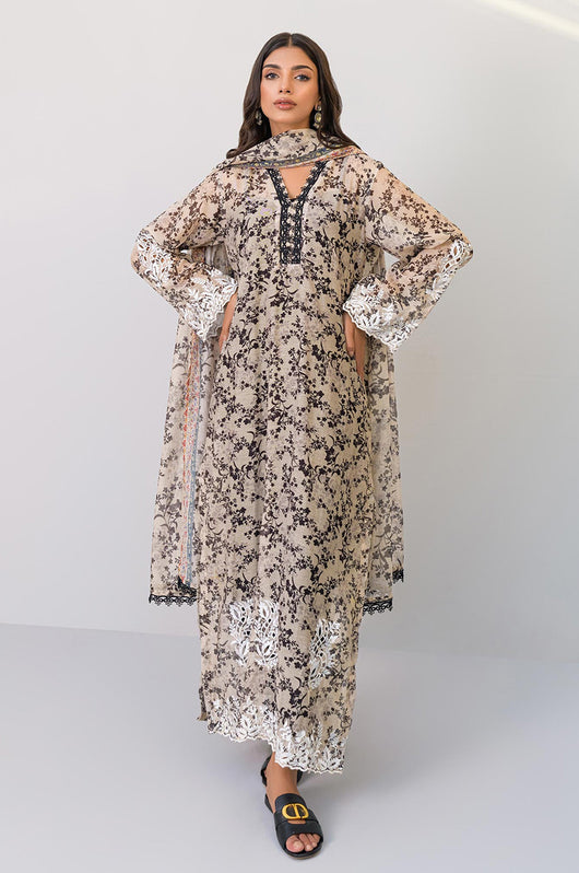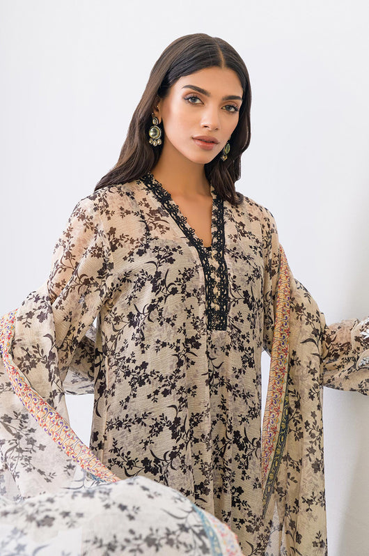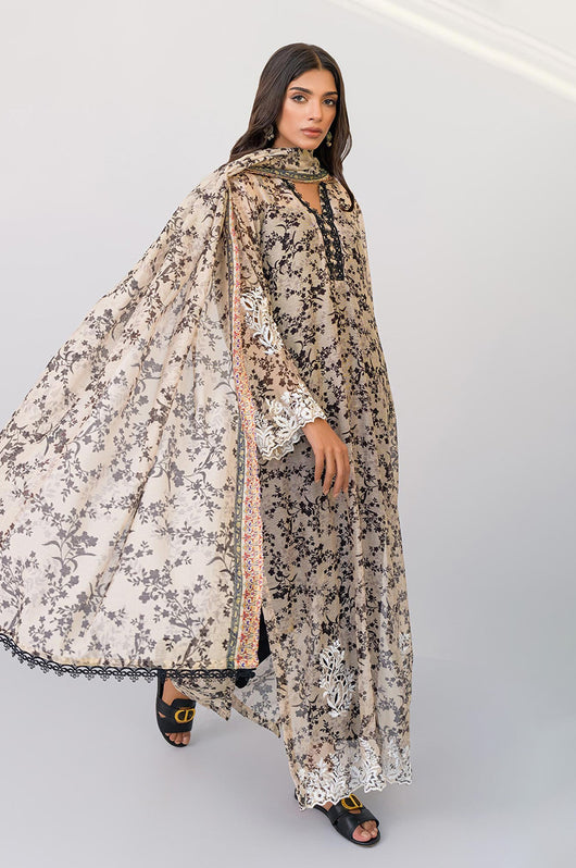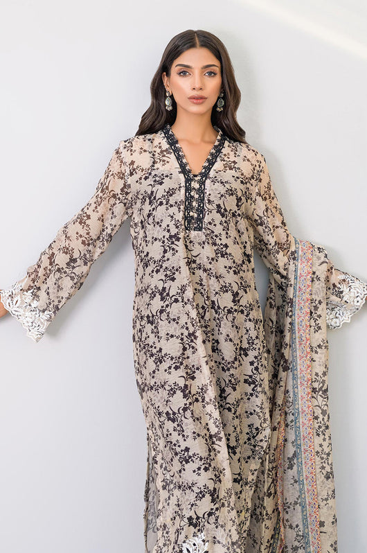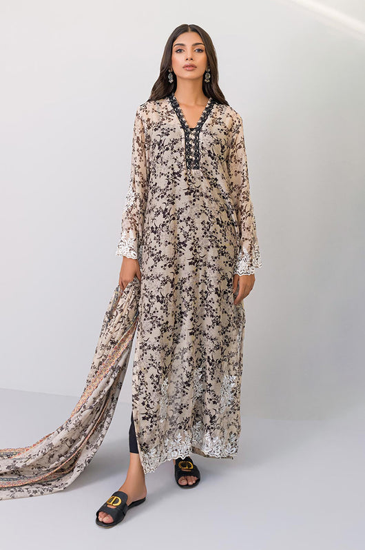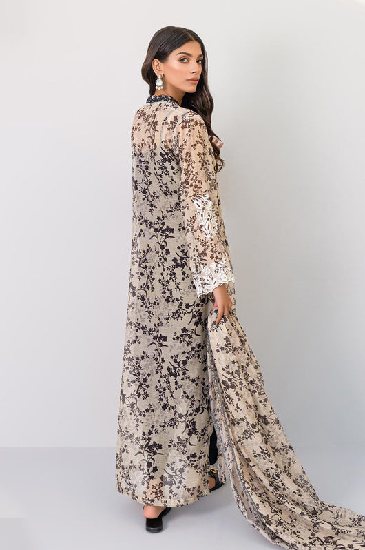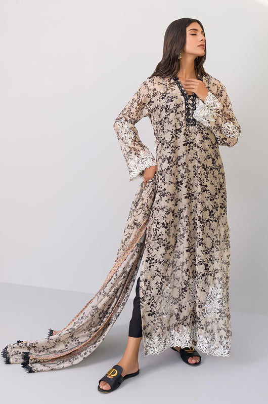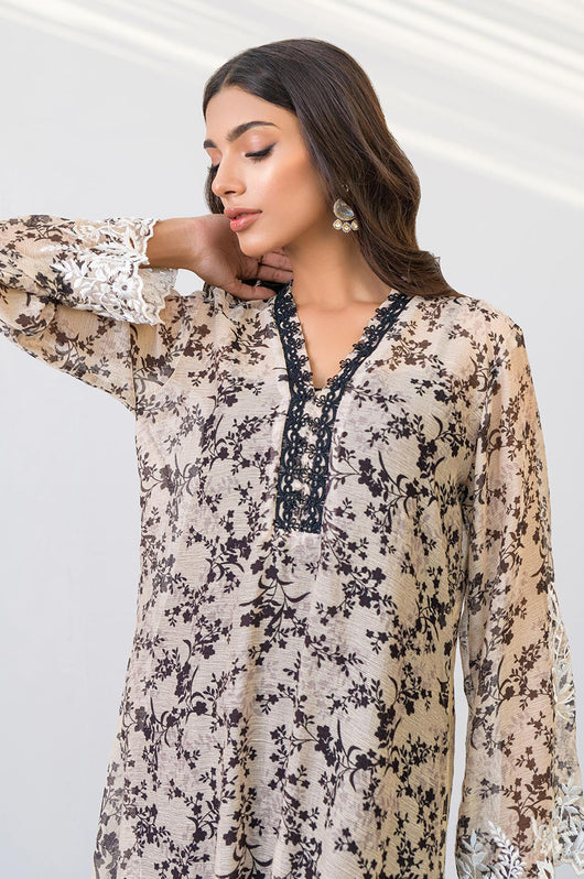 A long cotton net beige and onyx kaftan long shirt featuring a straight hemline is florally printed in shades of black and embroidered with contrasting white to give it a more casual but sophisticated look. Paired with black straight loose fit pants and a short inner with straps.