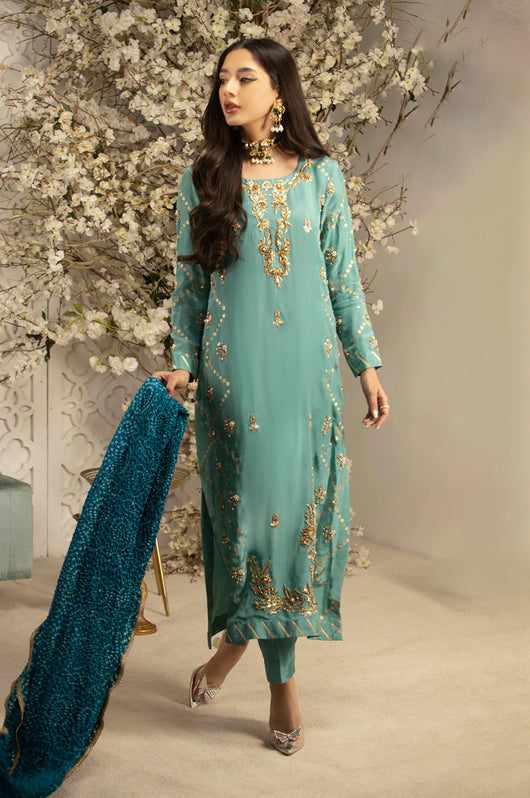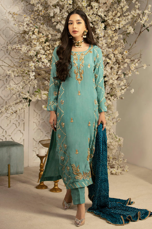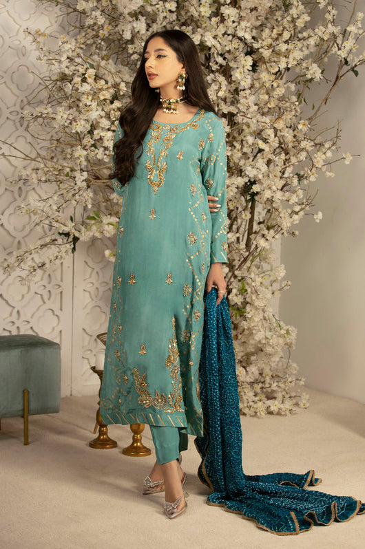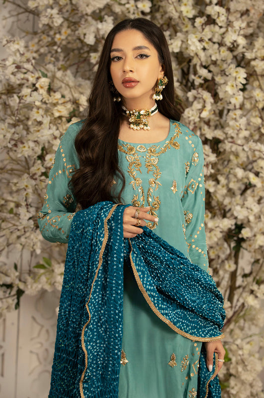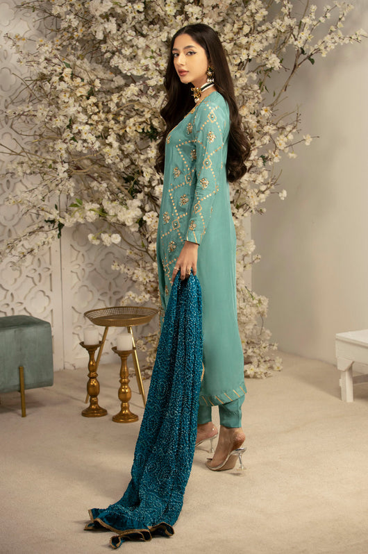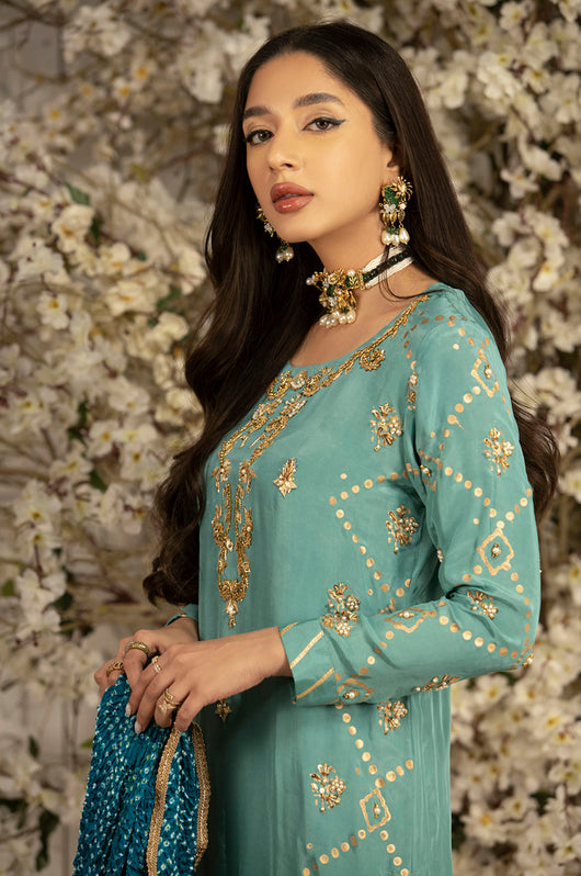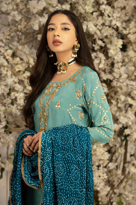 This Charmeuse silk article comes with block printed sides and heavily embellished neckline, daman and borders. The dress comes with pure medium silk chunri dupatta with lace finishes and comes with plain pants. This outfit has all the notes of traditional outfit. Style it from a mehndi to a wedding for a perfect formal ensemble.