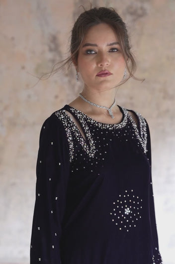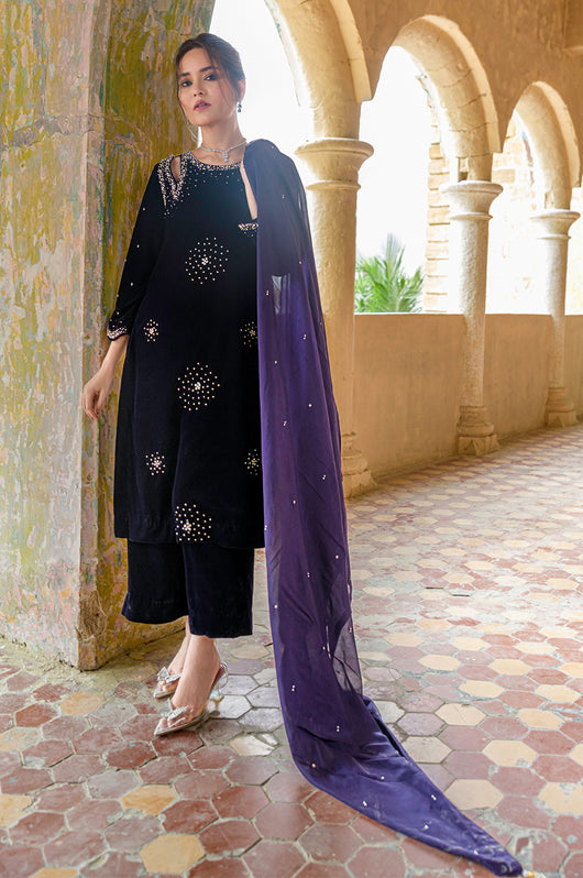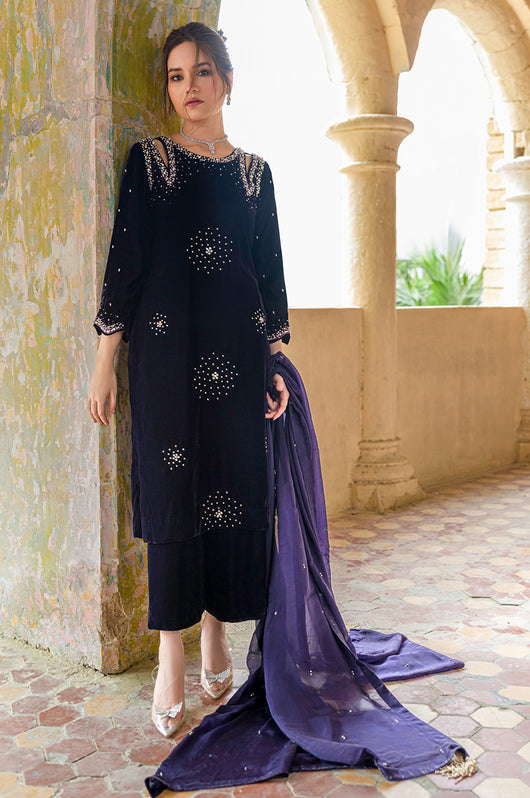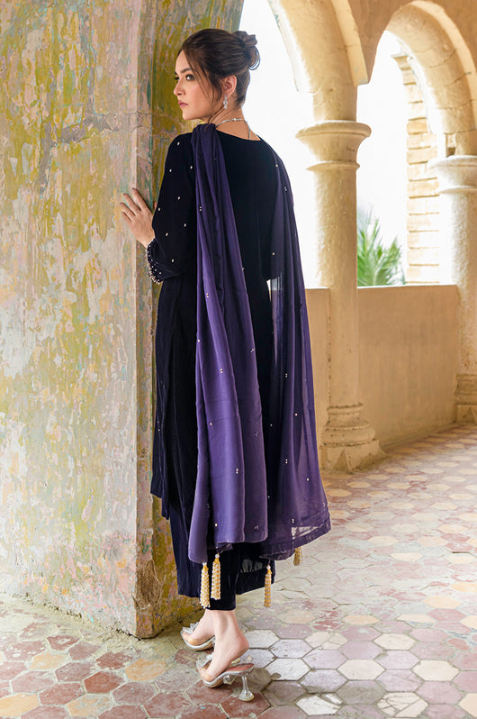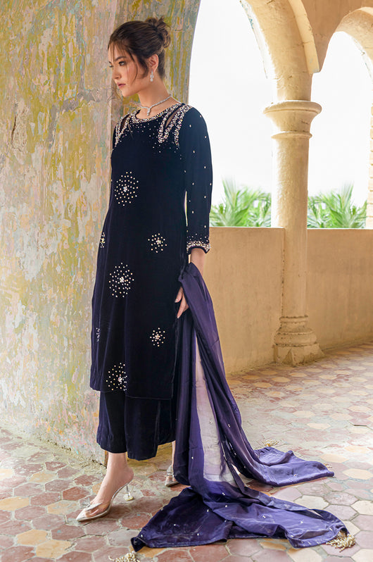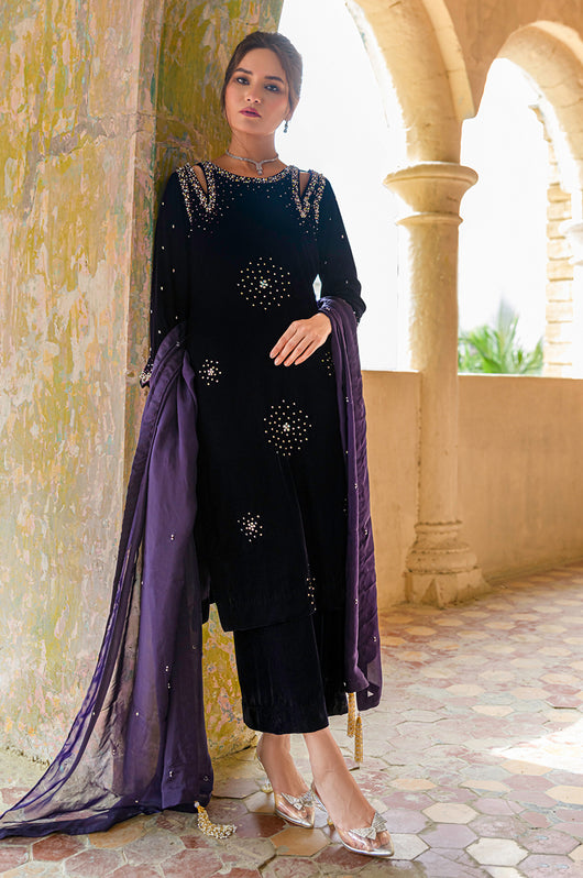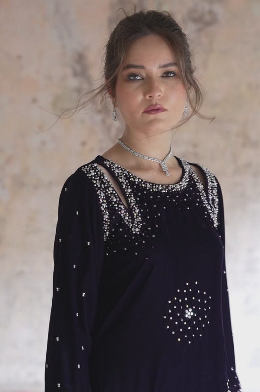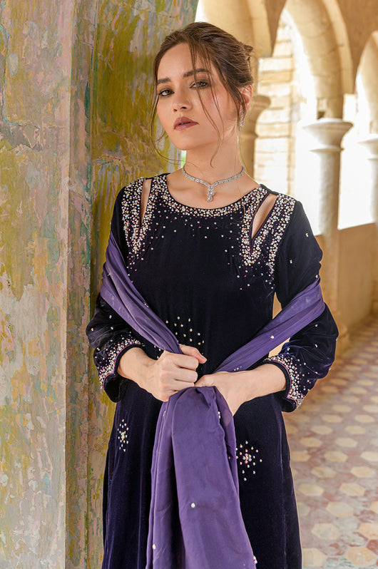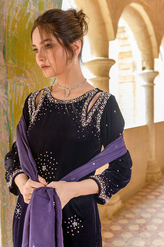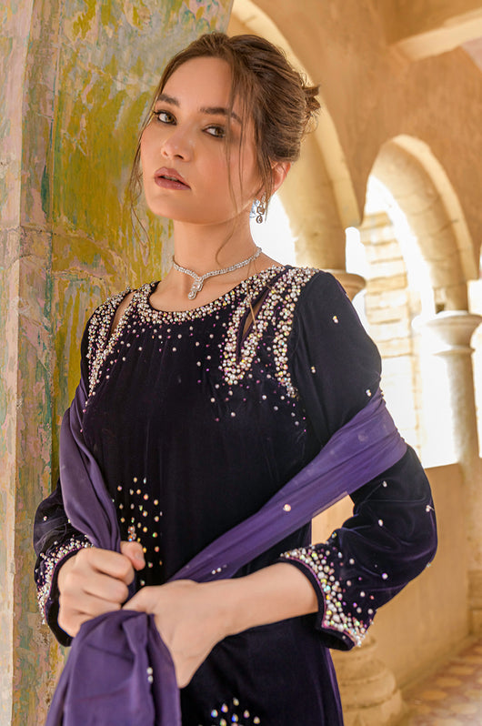 Hassah is an English purple dress made in a very modern outlook. The dress has side slits on the shoulders and spray chan all over the shirt. There are notes of dark and light stones and resham in the embellishments that add variation to the work. Comes with straight pants and an embellished dupatta. Length of the shirt is 40 inches and can be customized according to your needs.