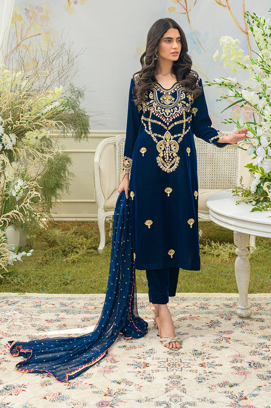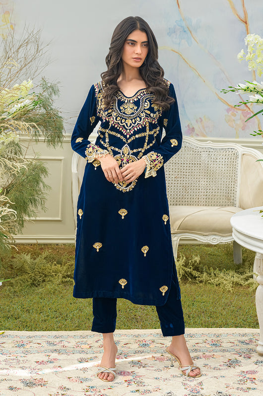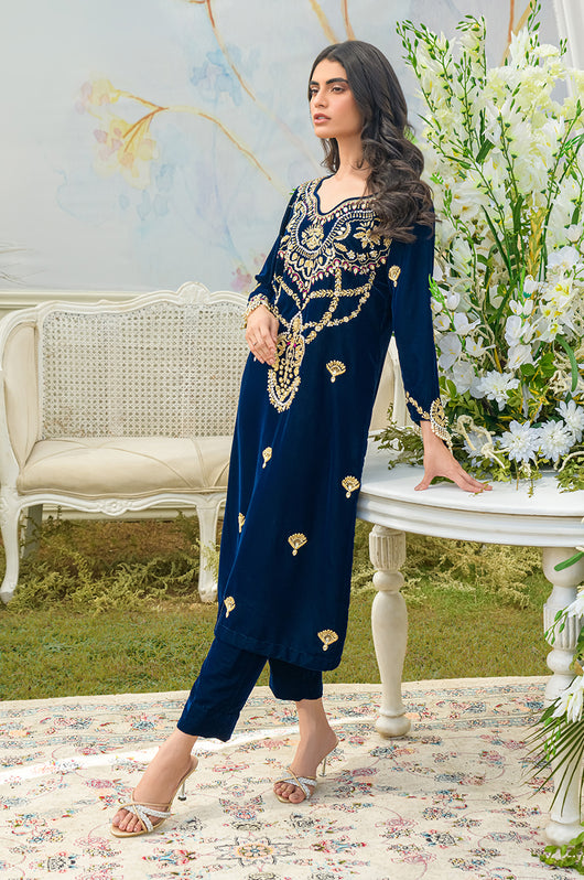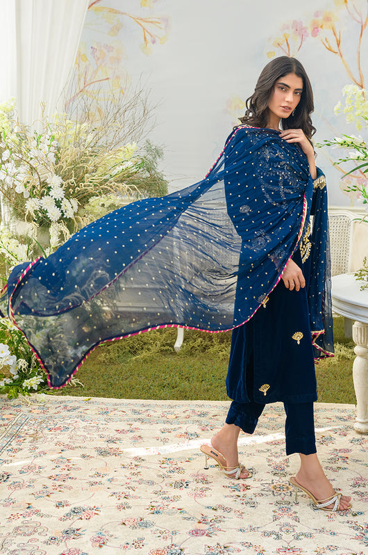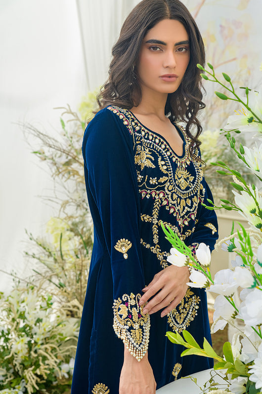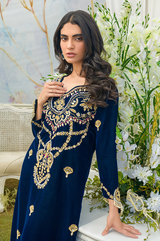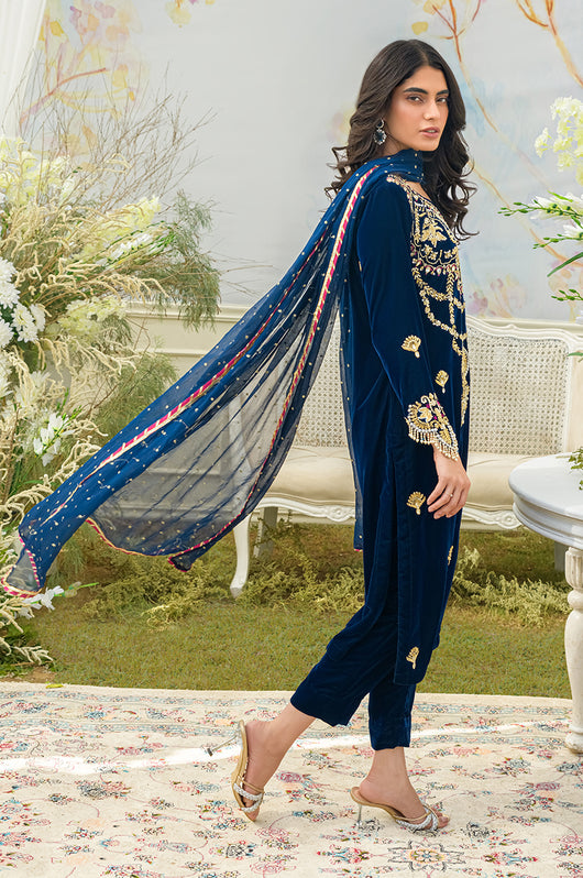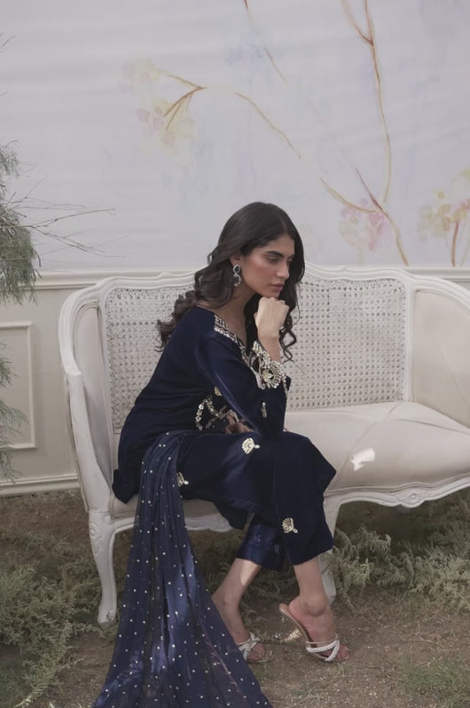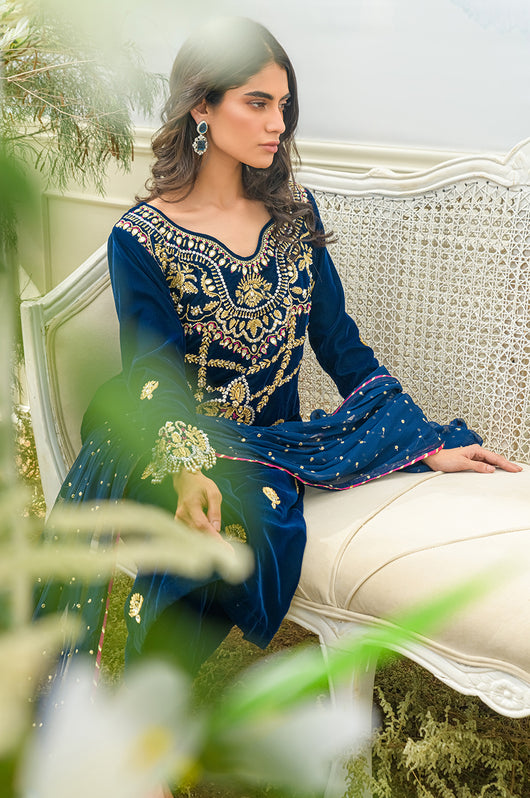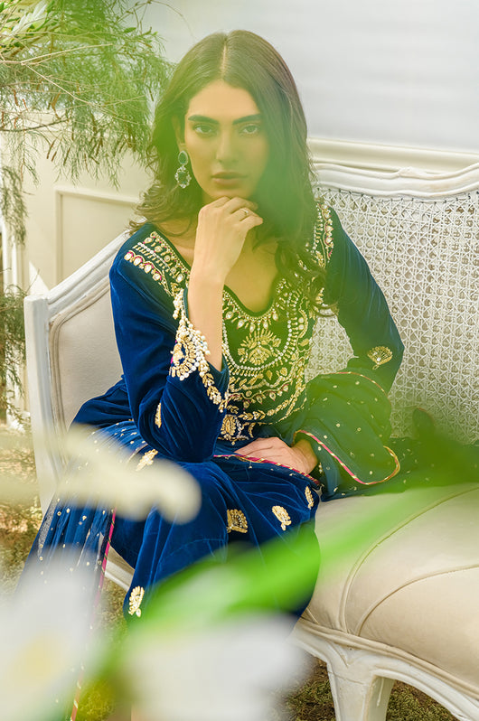 Hazal is a cobalt blue velvet shirt and pants made in the same velvet fabric with a chiffon embroidered dupatta in the same color and a pink contrast all throughout the dress. The shirt is hand embellished in gold handwork with kora, dabka, stones and pearls. The star of the outfit is the sleeve with a cutwork detailing running throughout the end and pearls hanging as a beautiful detailed finish. The dupatta has lace finishes all throughout. Step outside this festive season in this Cobalt hued traditionally worked yet very classic designed outfit.