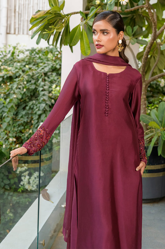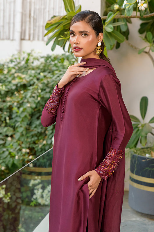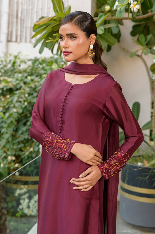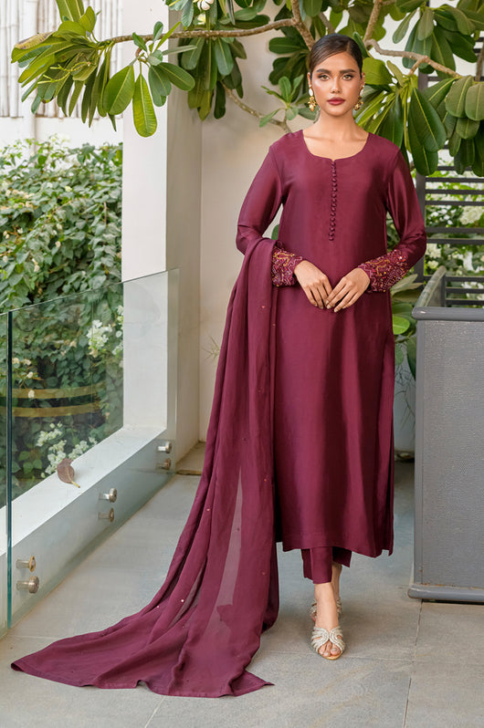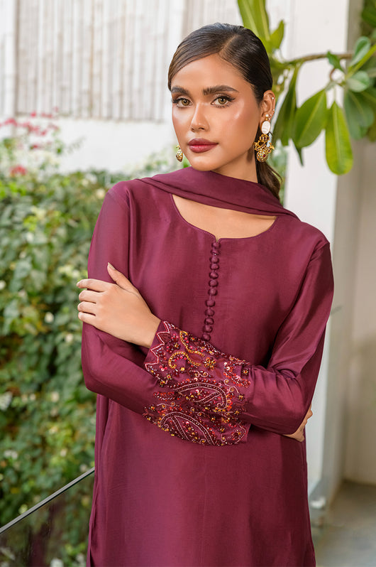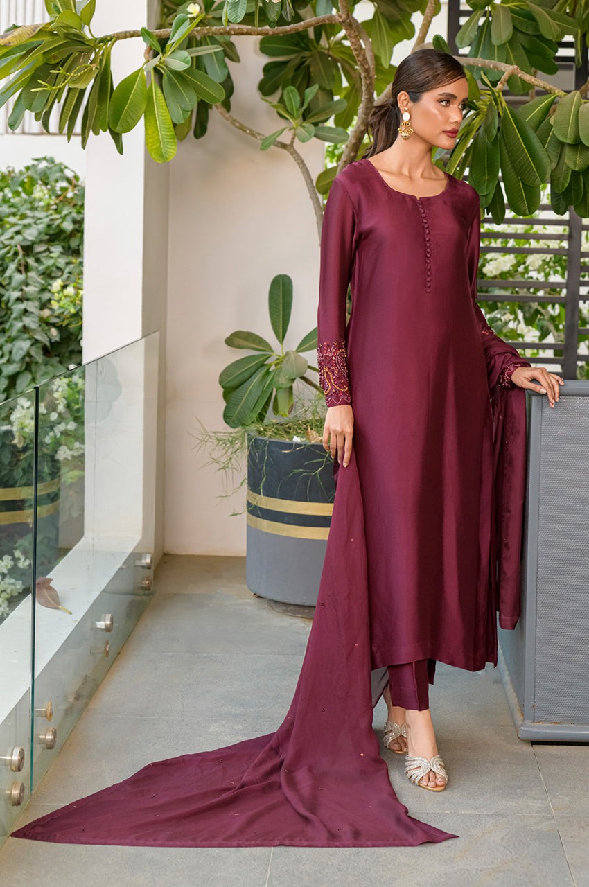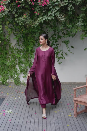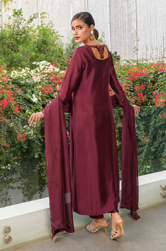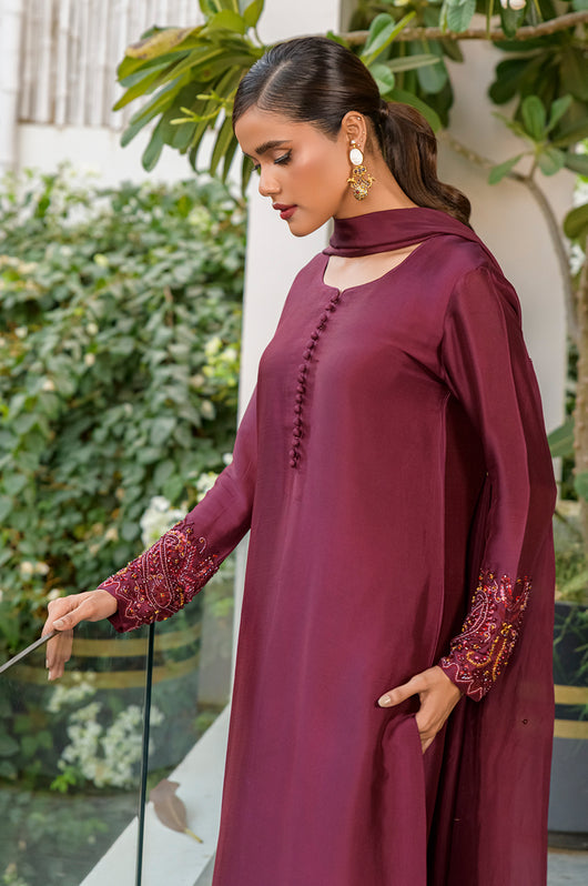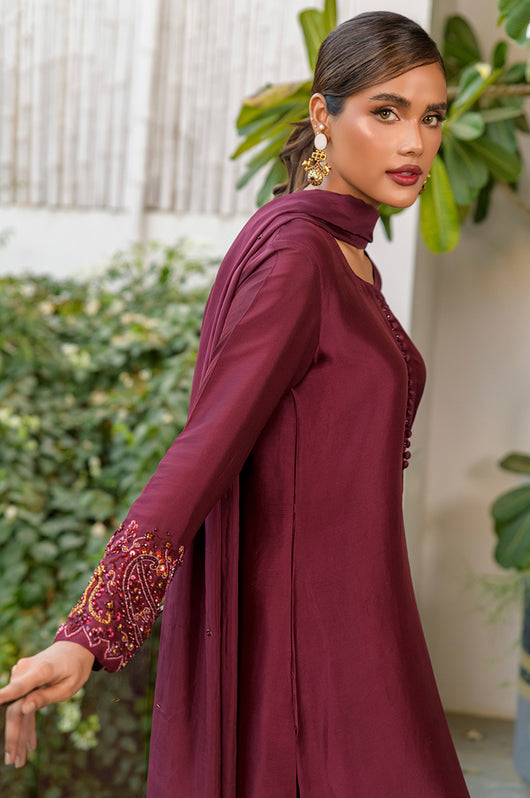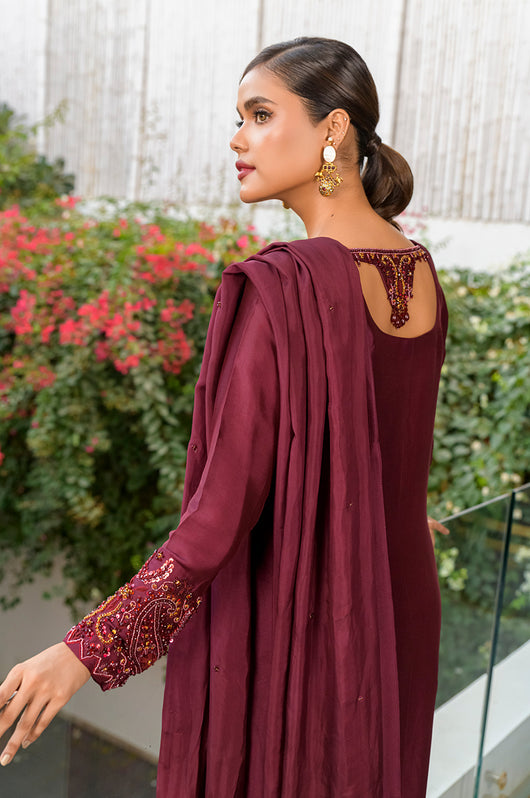 Hind is a burgundy colored butter silk monochrome long shirt with handworked sleeves and the same self colored back details as well. The hand work is made in burgundy colored crushed kat dana and stones details along with other embellishments. The dress comes with same colored straight pants made in butter silk and silk dupatta with crushed kut dana chan all over the dupatta.