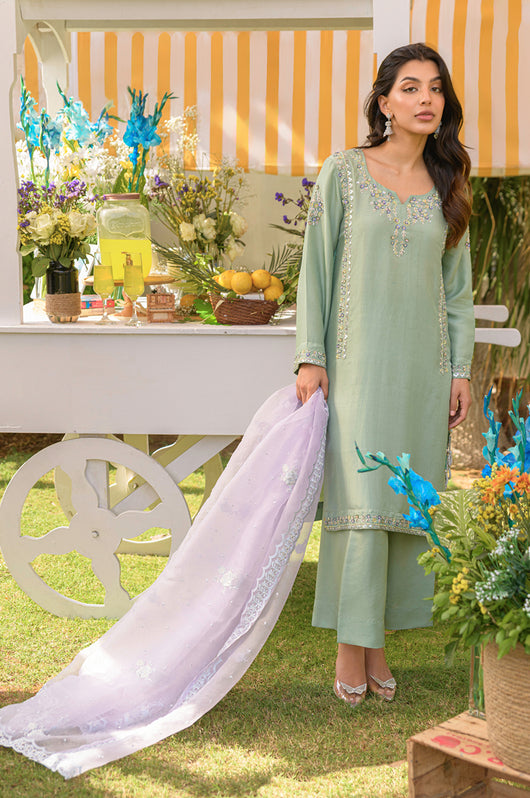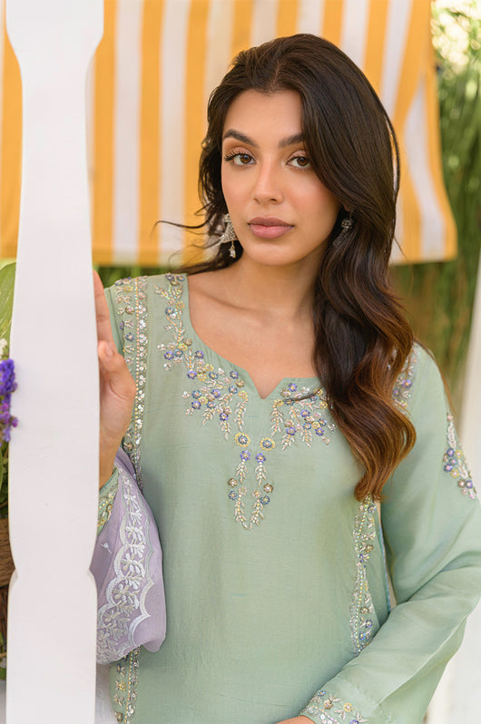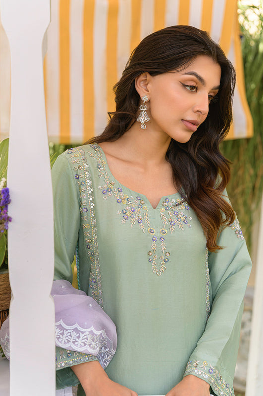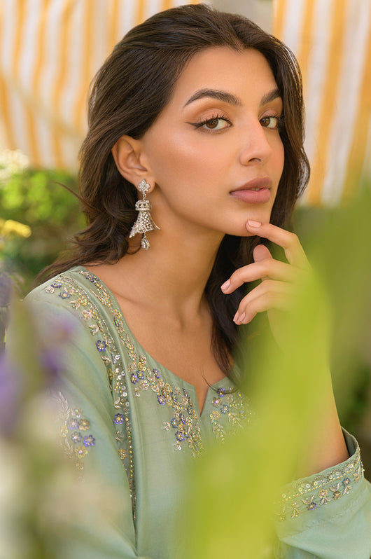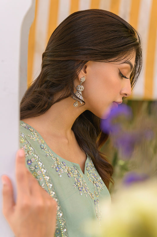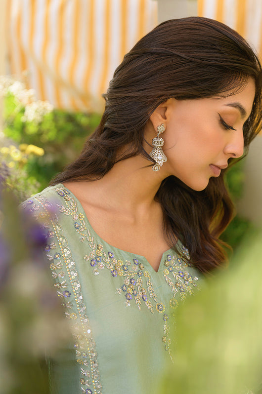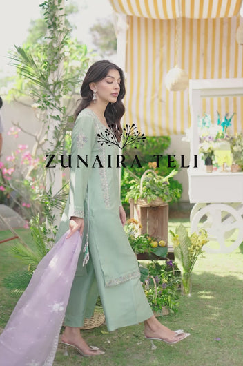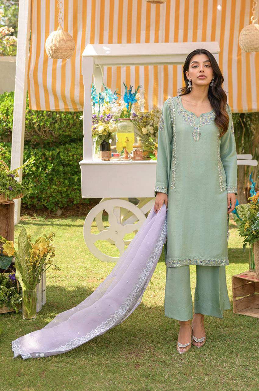 Husna is a mint-colored heavily embellished shirt with handwork details in purple and tones of grey. Multi-colored embellishments in kora, dabka, stones, sequins, and resham add old-world charm yet maintain the modernity of the overall feel of the outfit. The side slits have a beautiful detail of hanging tassels in two tones complimenting the outfit. Comes with relaxed loose pants cut in the same fabric and color and a lilac self-embroidered pure silk organza dupatta. You can opt for a silk dupatta as well for the flow.