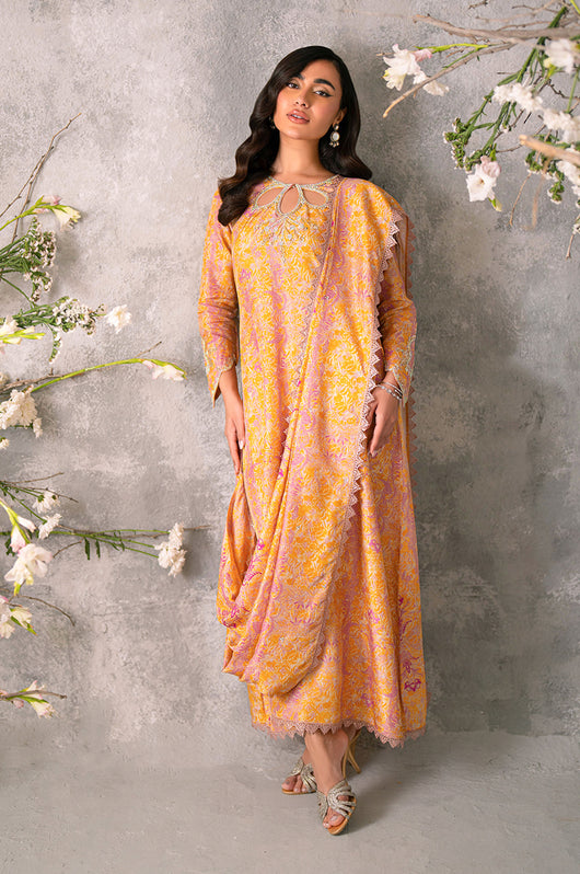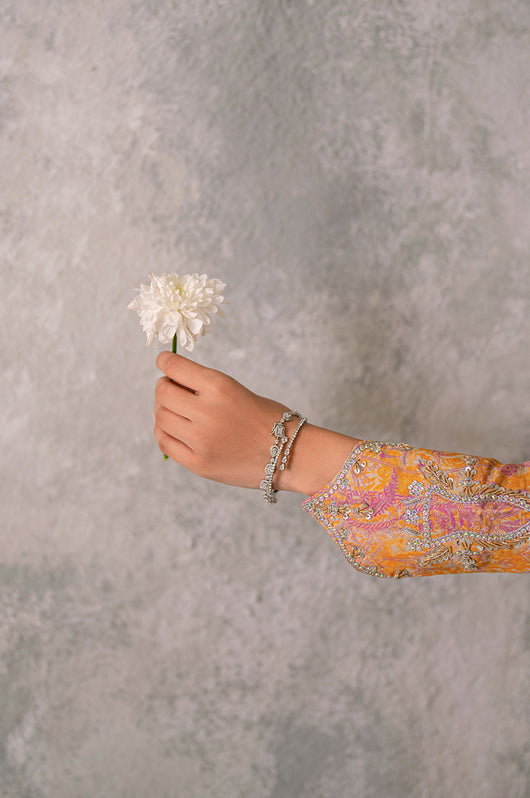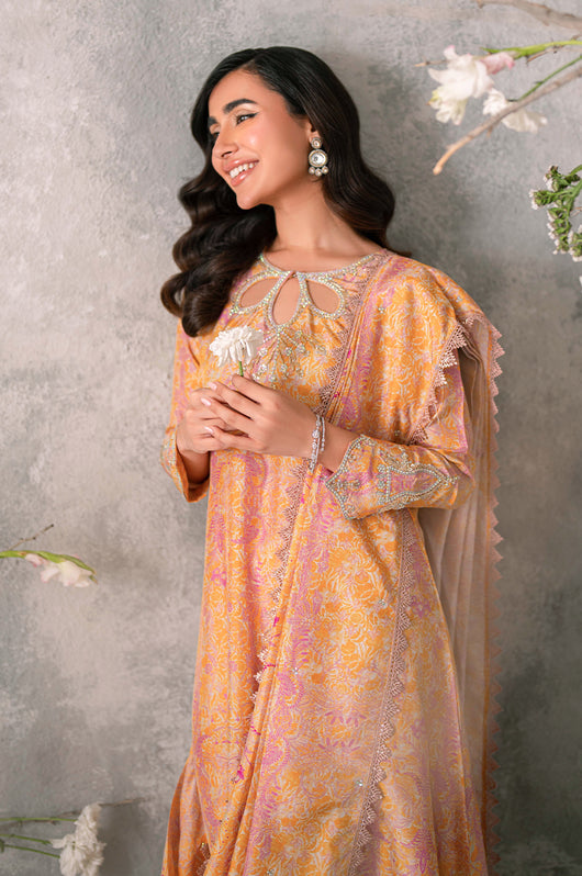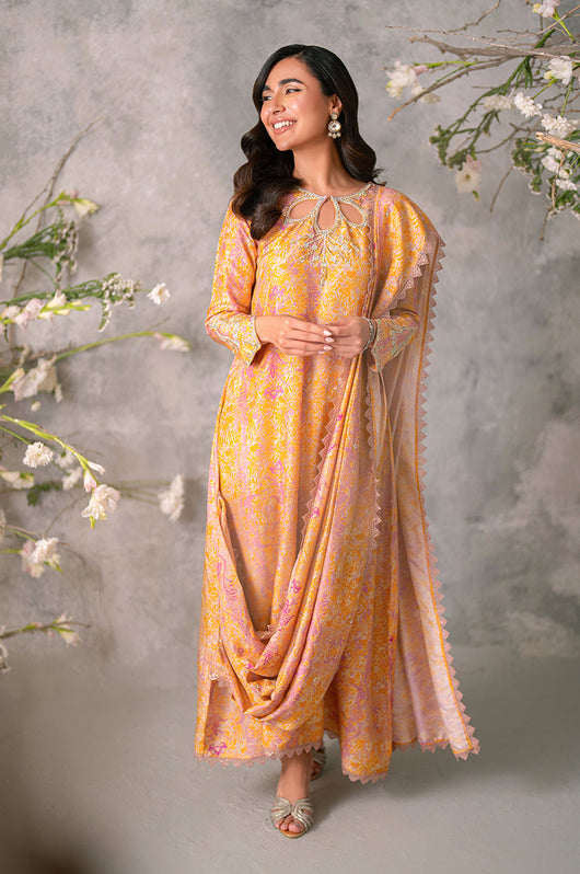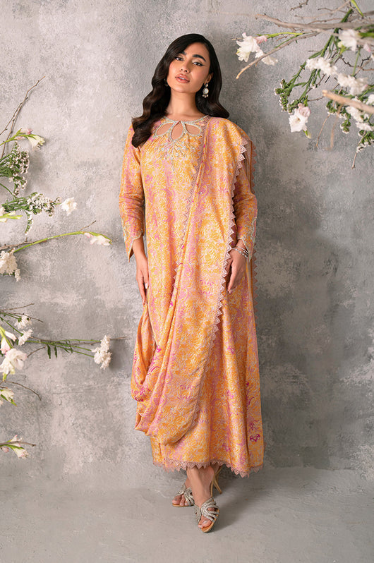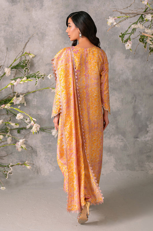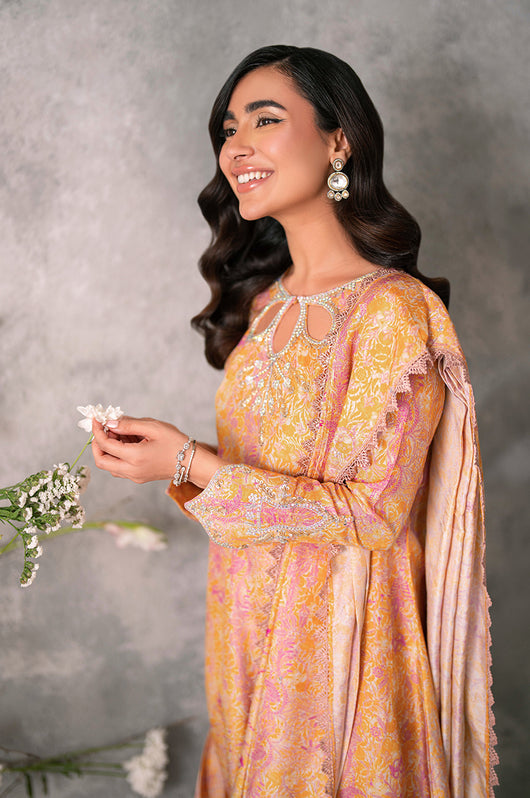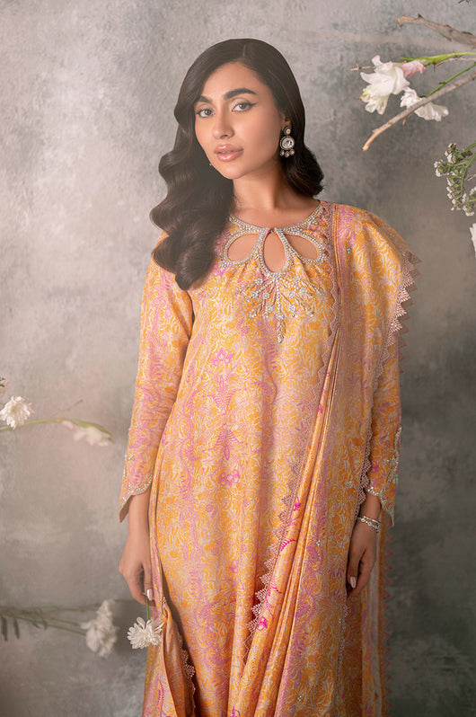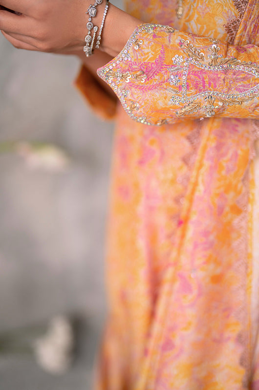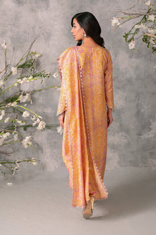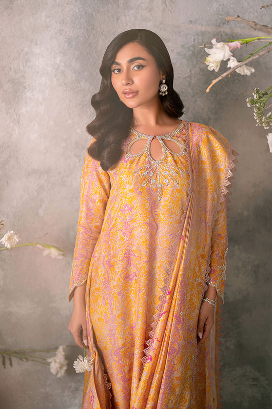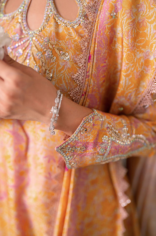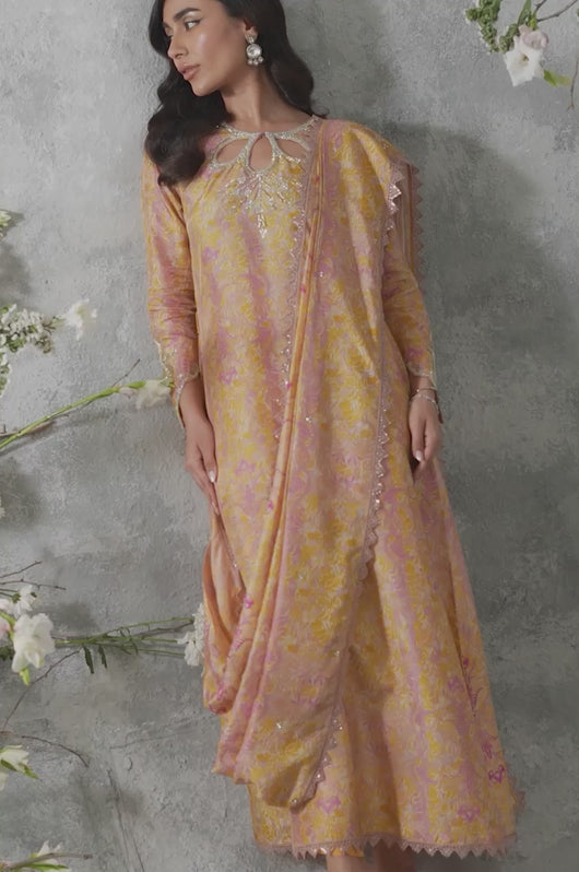 Husniya is a powder pink and yellow colored drape style saree cut. Made in the finest raw silk, the dress is cut in A line shape with attached dupatta from the bottom and comes with straight pants underneath. There is a heavily embellished neckline and sleeves with a beautiful shaped cutwork. The dupatta has floral chan and lace finishes all over.