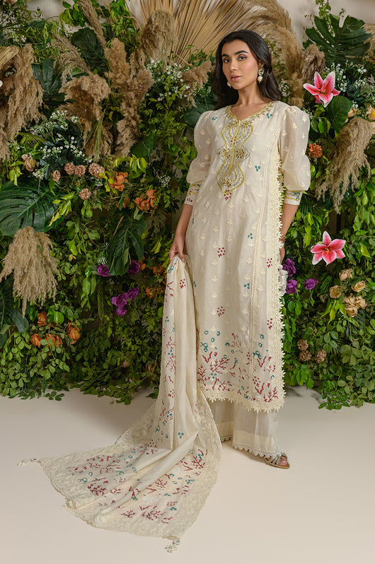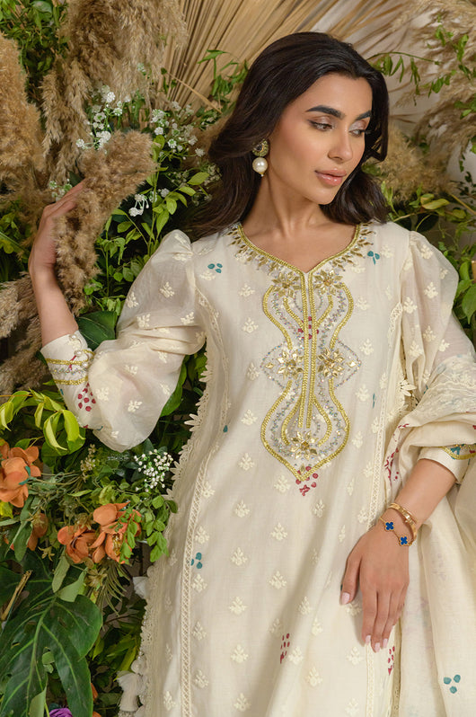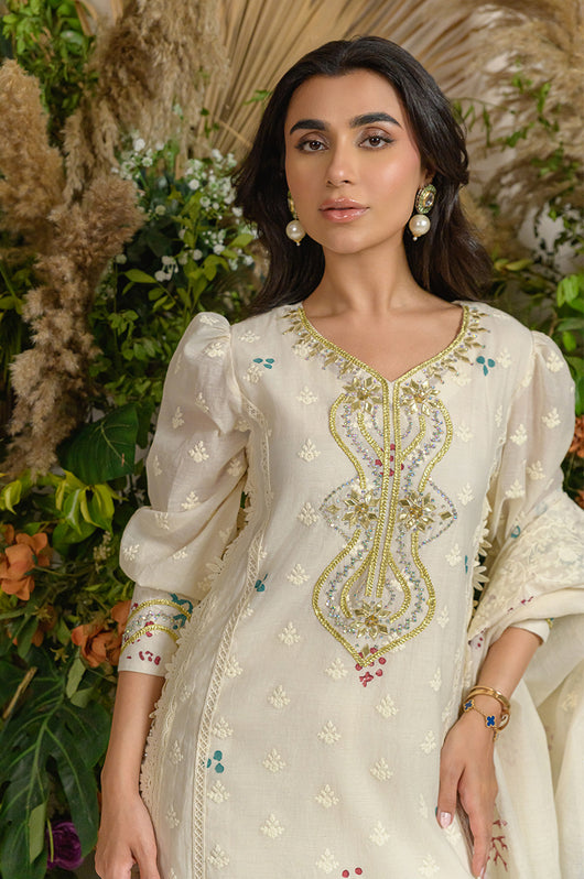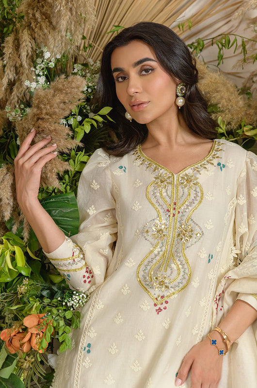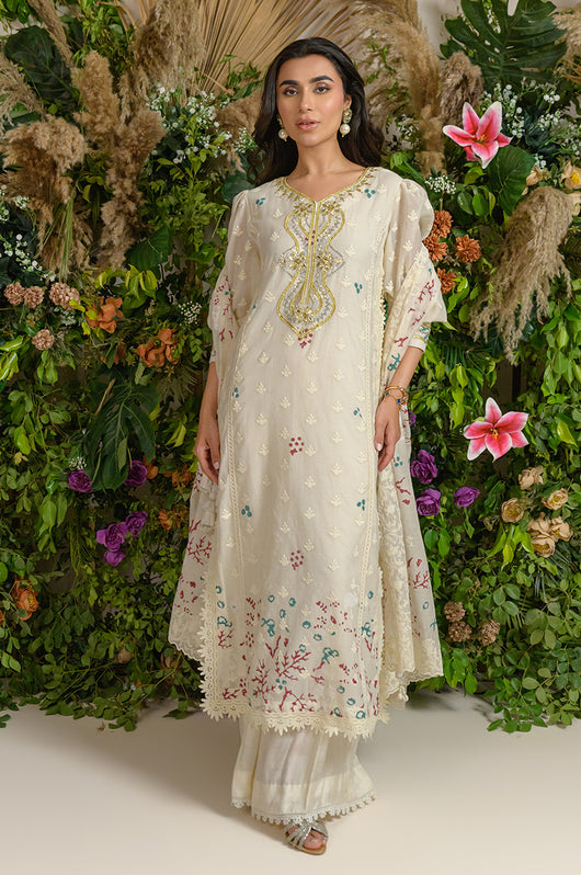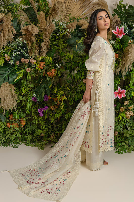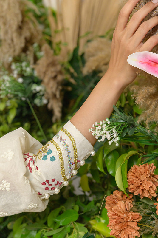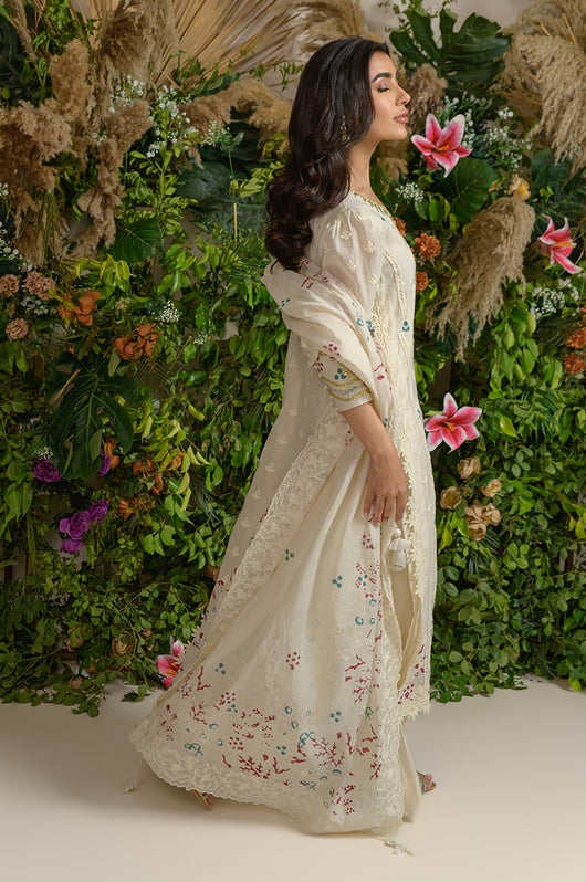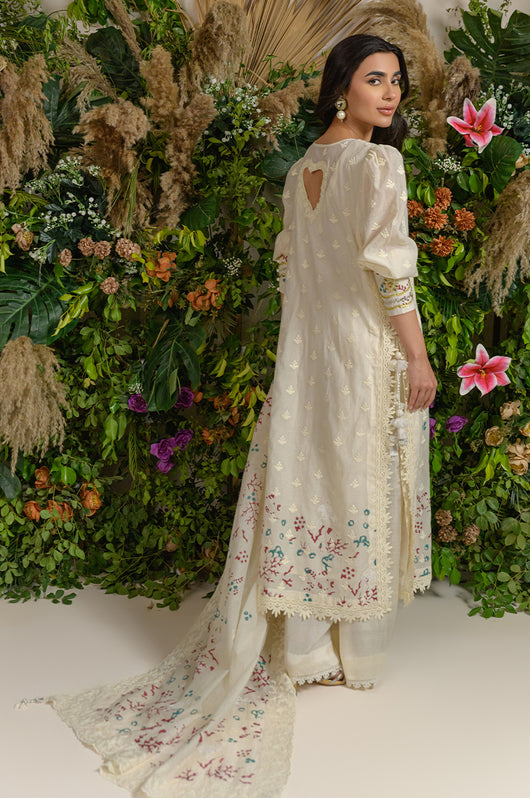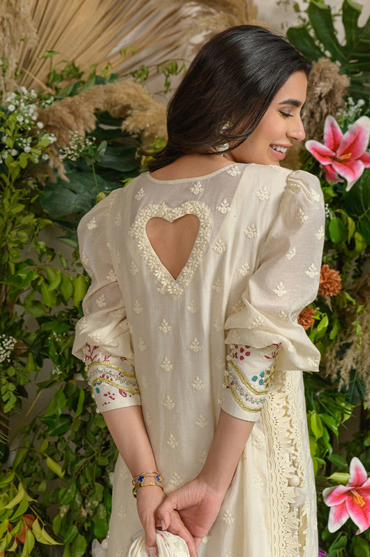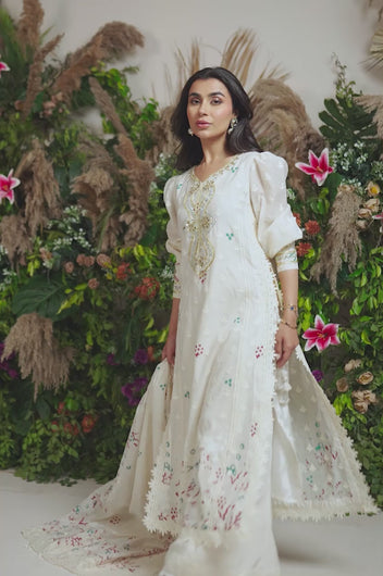 Ivory is a mid length shirt made in swiss voile with multiple techniques used. The shirt is block printed first and then hand worked with gold gotta details on the neckline and sleeves cuff. There are lace details that run all throughout the sides of the outfit along with hanging tassels. The outfit has heart details on the back with lace finishes all over. The outfit comes with cotton silk pants and embroidered dupatta with block printed details.