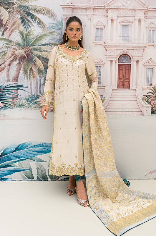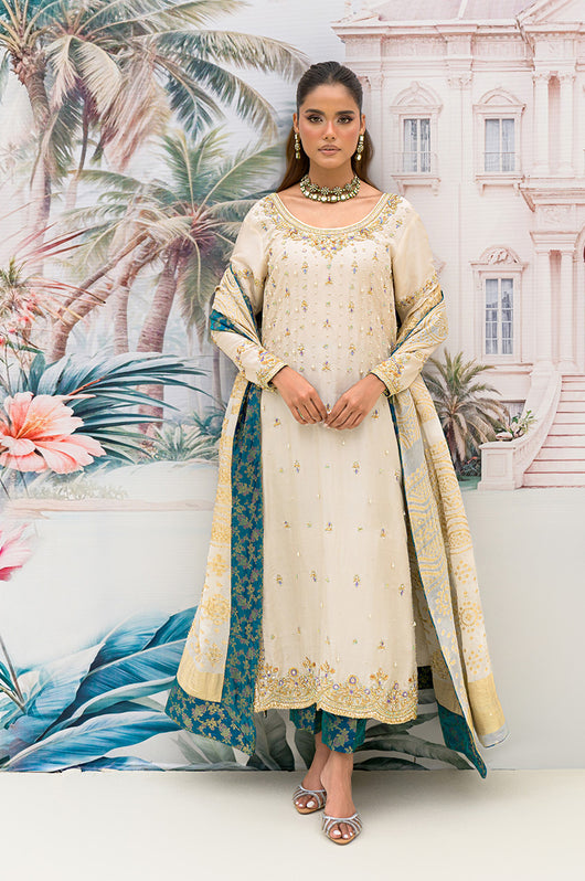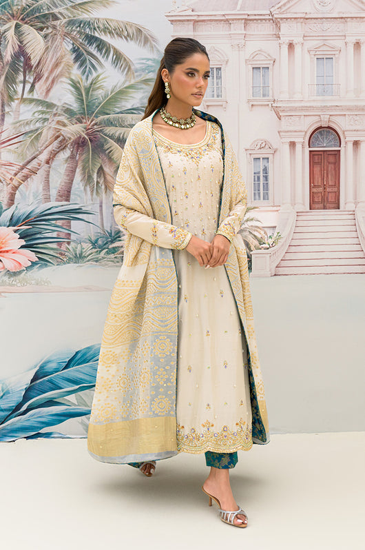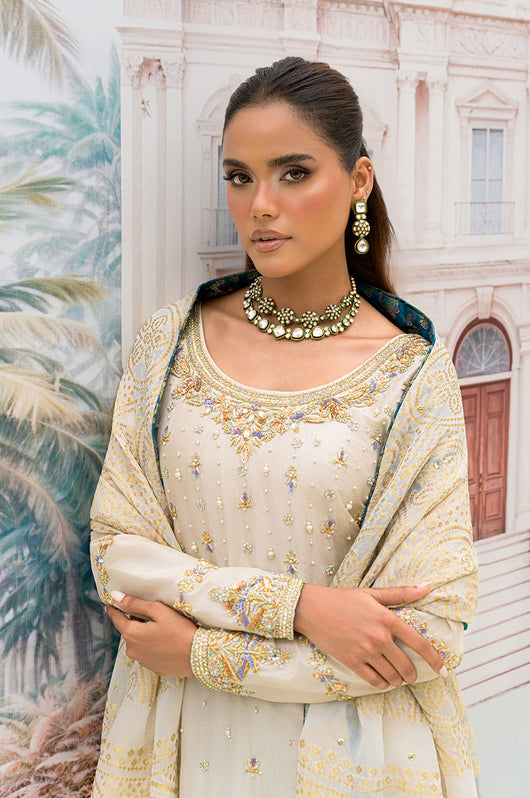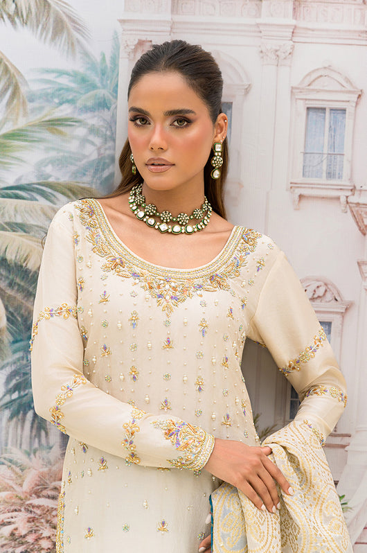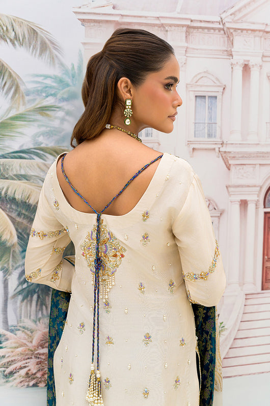 Ivory Mocha is a beautifully designed A line shirt made in Pure raw silk 80 gms fabric. The shirt is heavily embellished in gold and silver with the contrast blue and purple colored sequins which go along with the two toned banarsi pants. The dress has banarsi finishes all over the shirt and dupatta and also comes with a heavily embellished back with motifs and tassel details. The outfit comes with a chiffon banarsi gold dupatta with pattern made in inlay.