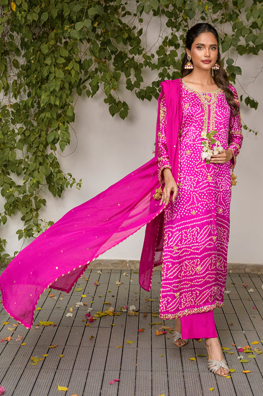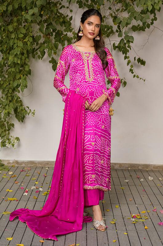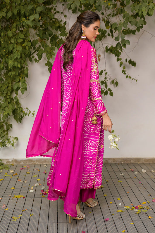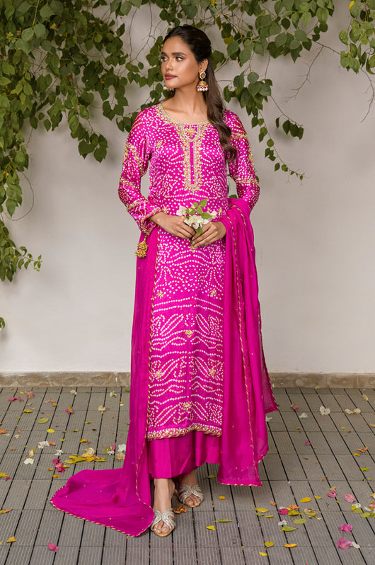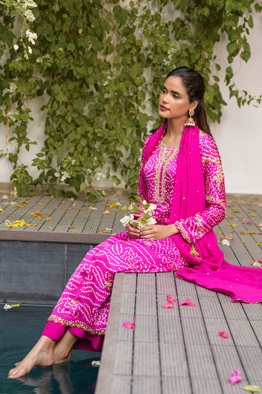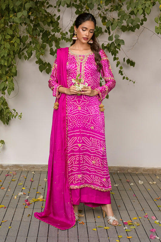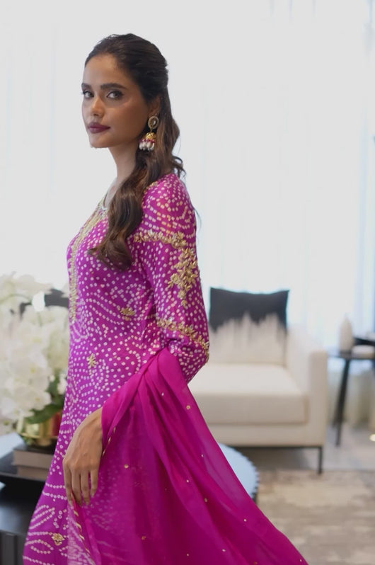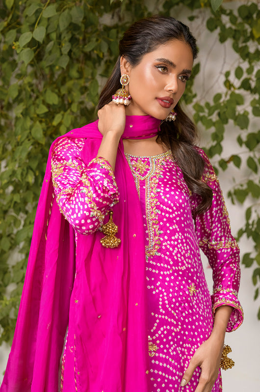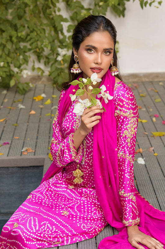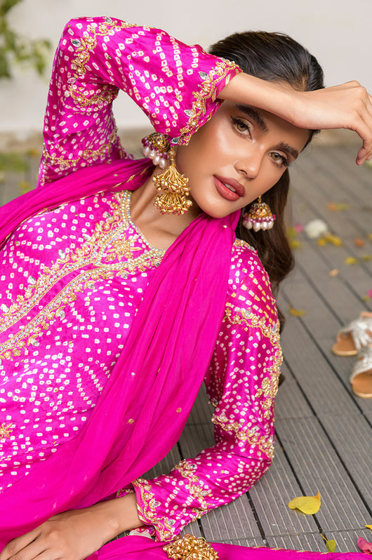 Izana is a magenta pink chunri base made in pure Charmeuse silk with heavily embellished neckline and sleeves and with motifs and chan all overall. Tassel details on the sleeves as well. The dress is hand embellished with Swarovski stones, kora, dabka and all other premium hand embellished details. The dress comes with a culotte made in Bosci silk and a dupatta with chan and chatapati details all over.