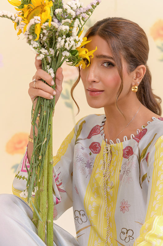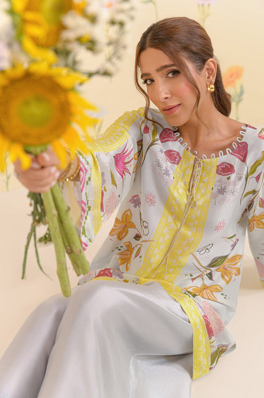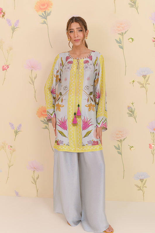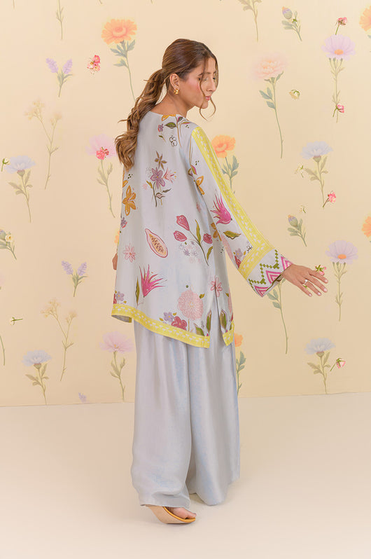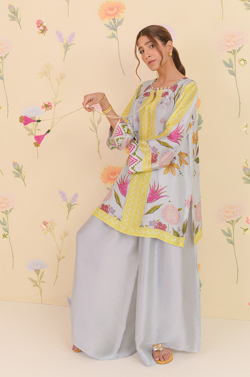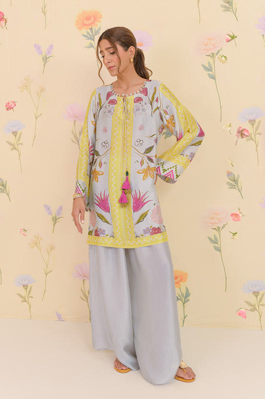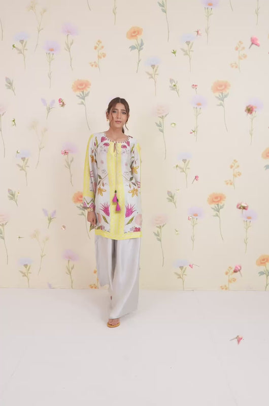Jellybean Jubilee is a multicolored floral pattern inspired by the jellybean colors on a sky-blue base. The outfit comes with v shaped silk pants for the twist and has hand embellished tassel details on the neckline. The outfit is made in pure butter silk.