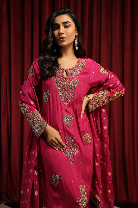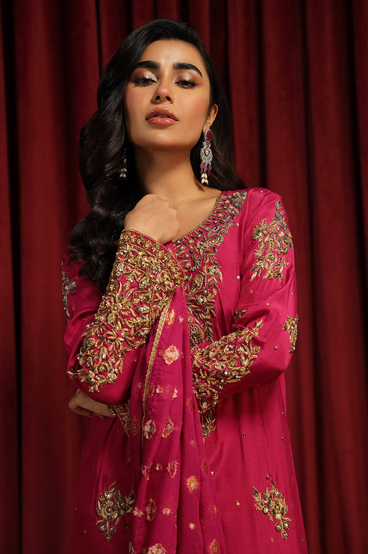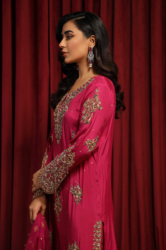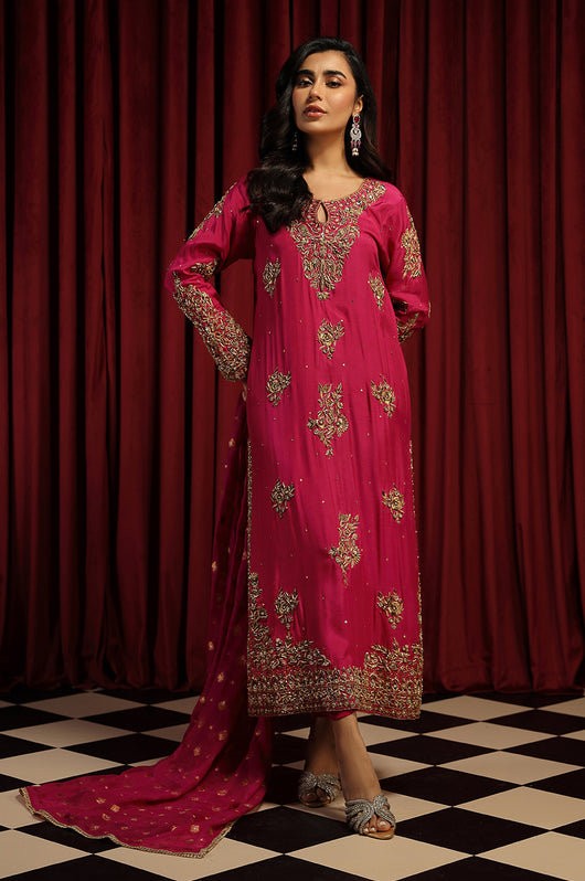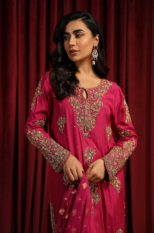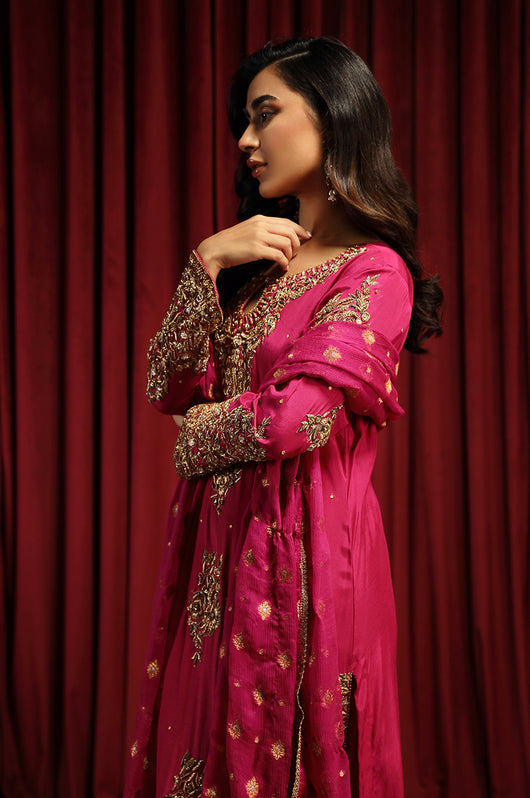 Kenza is a dark pink straight-line shirt with heavily embellished borders running on the daman and chaks of the shirt. The embellished shirt has gold-colored work notes that add to the beauty. This ensemble is the perfect personification of elegance for any occasion. Comes with a pure jamawar chiffon dupatta finished with gold lace and straight pants cut and stitched from the same fabric.